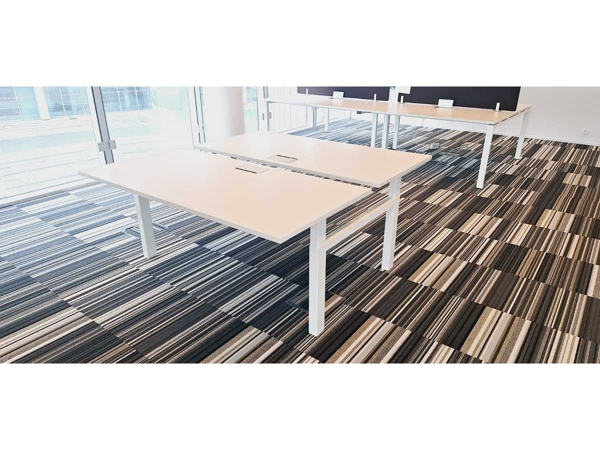 Duoworkbench Haworth, onderstel in metaal kleur Wit, werkbladen in melamine kleur Wit voorzien van kabeldoorvoer in alu, goede staat Merk: Haworth Kleur: Wit-Lichte Eik Gewicht: 120kg Breedte: 160cm Diepte: 170cm