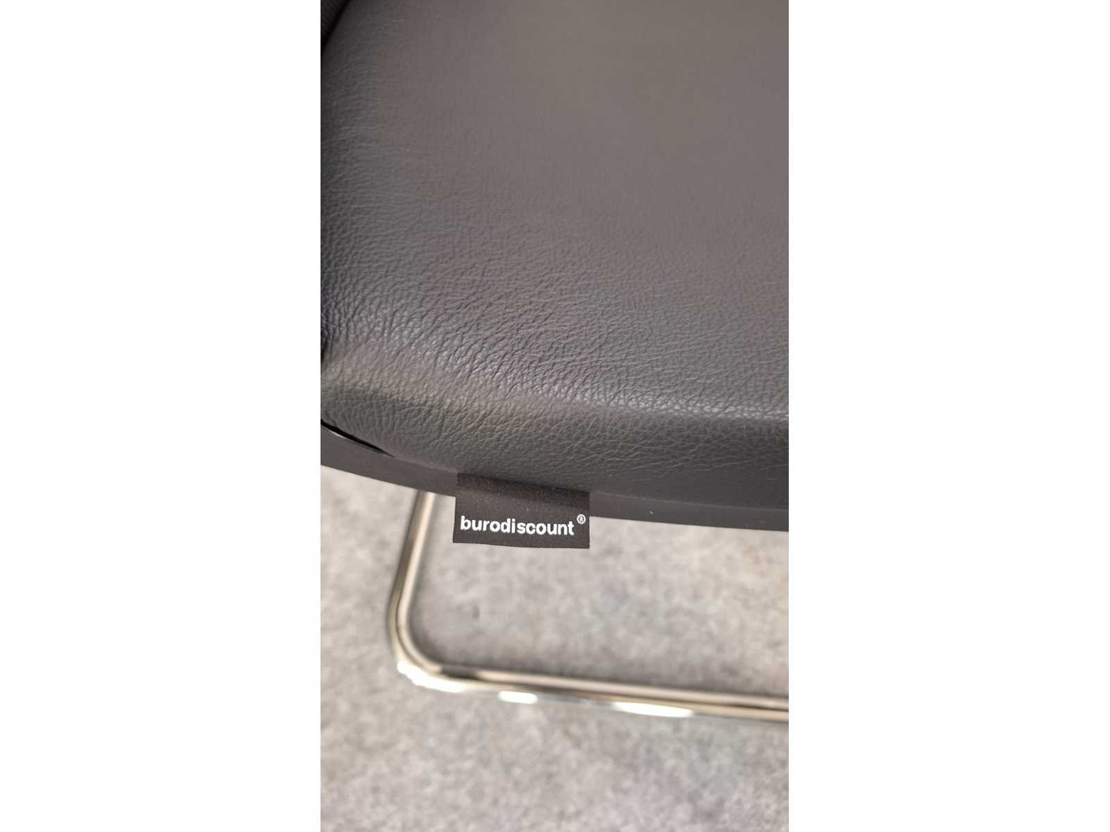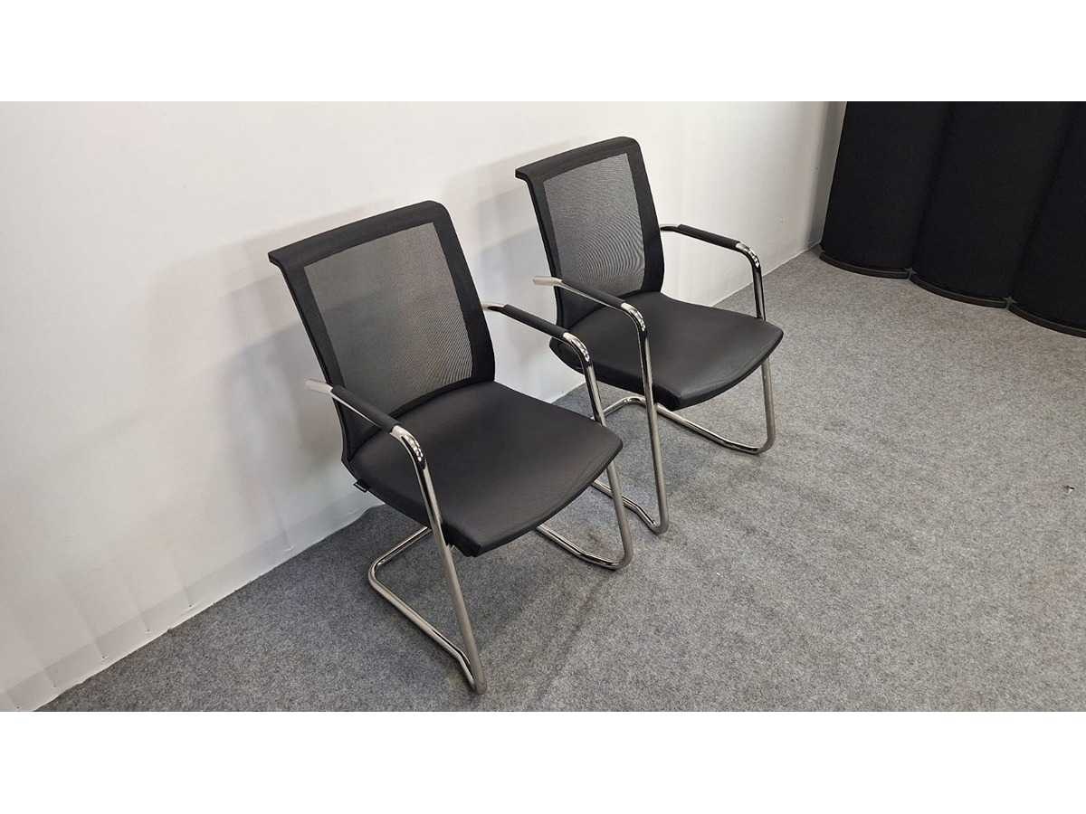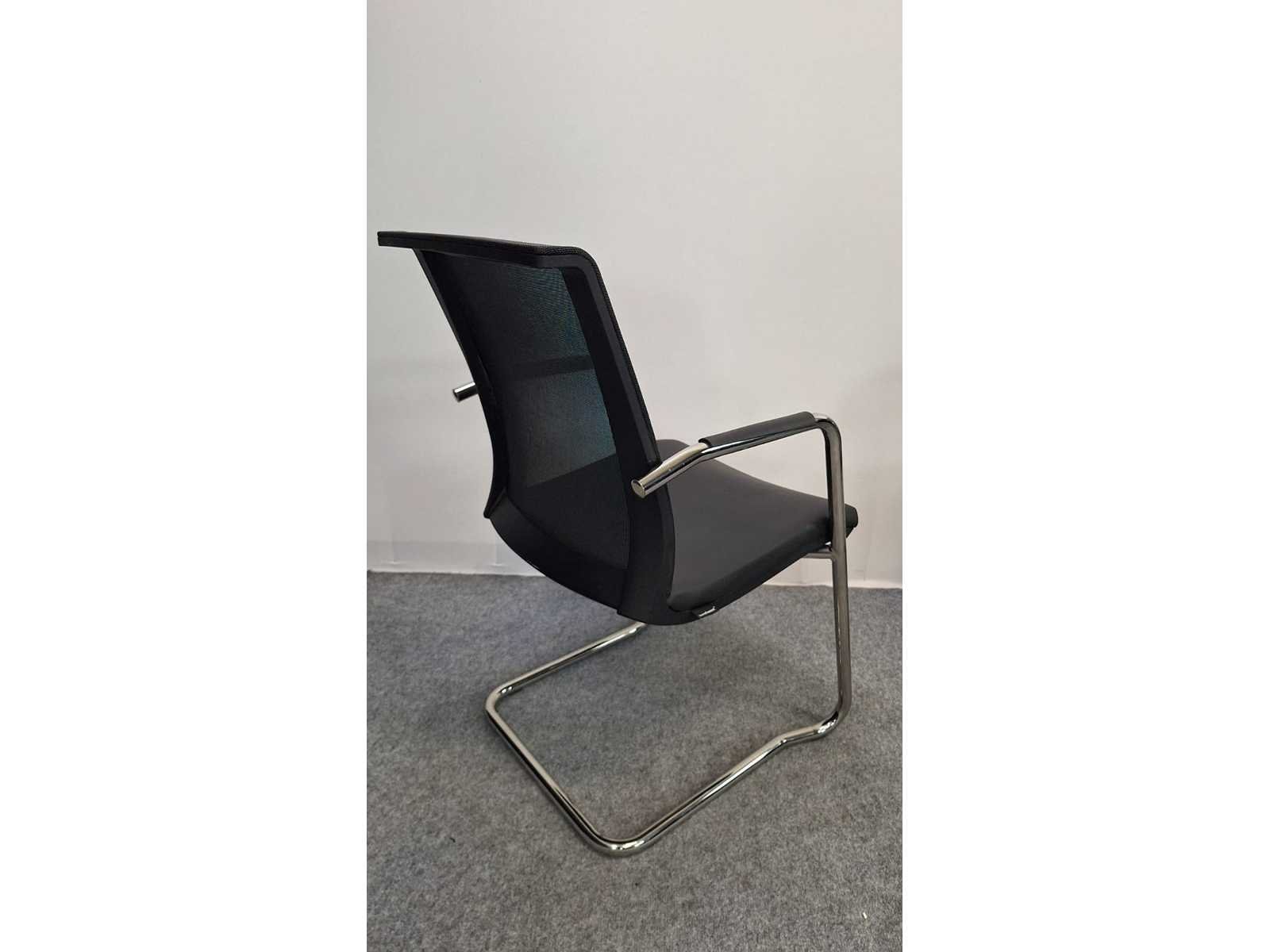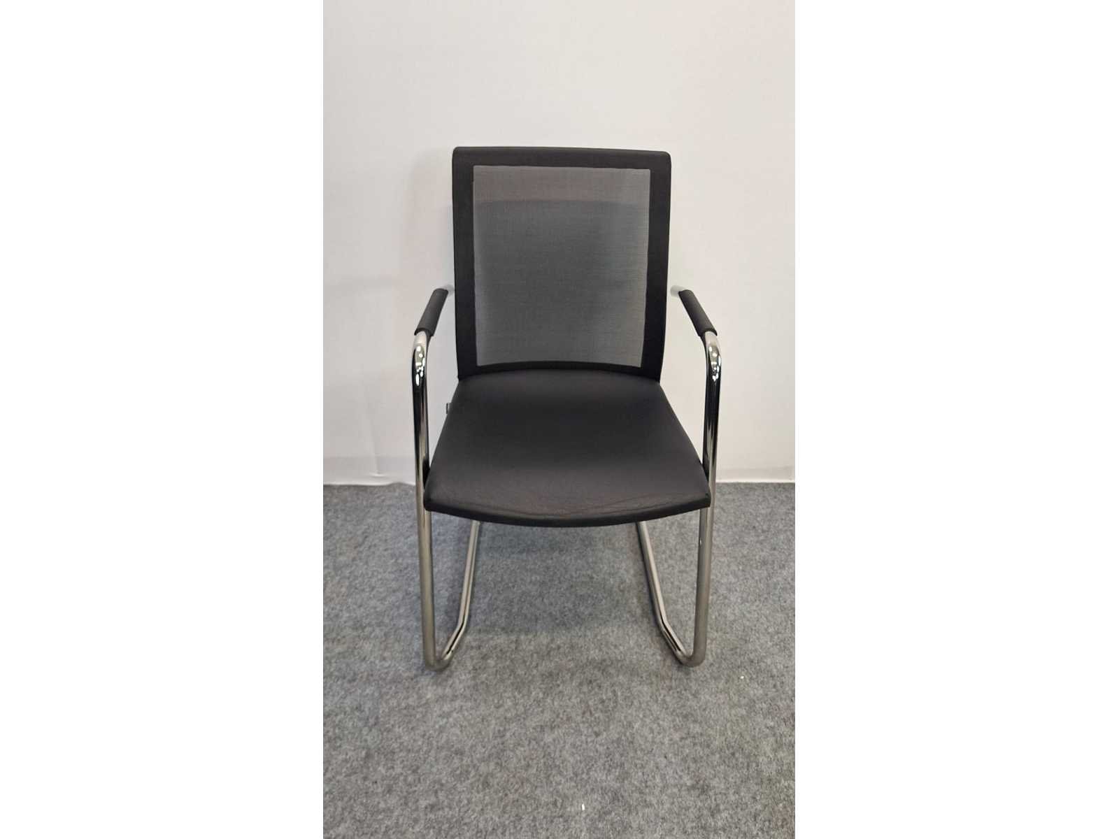 Slede onderstel in metaal hoogglans verchroomd, zitting in kunstleder kleur Zwart, rugleuning in netweave kleur Zwart, armleuningen in kunststof kleur Zwart, in zeer goede staat Merk: Narbutas Kleur: Chroom - Zwart Materiaal: Metaal, kunststof, stof Zithoogte: 43cm Hoogte: 80cm Breedte: 50cm Diepte: 50cm Gewicht: 30kg