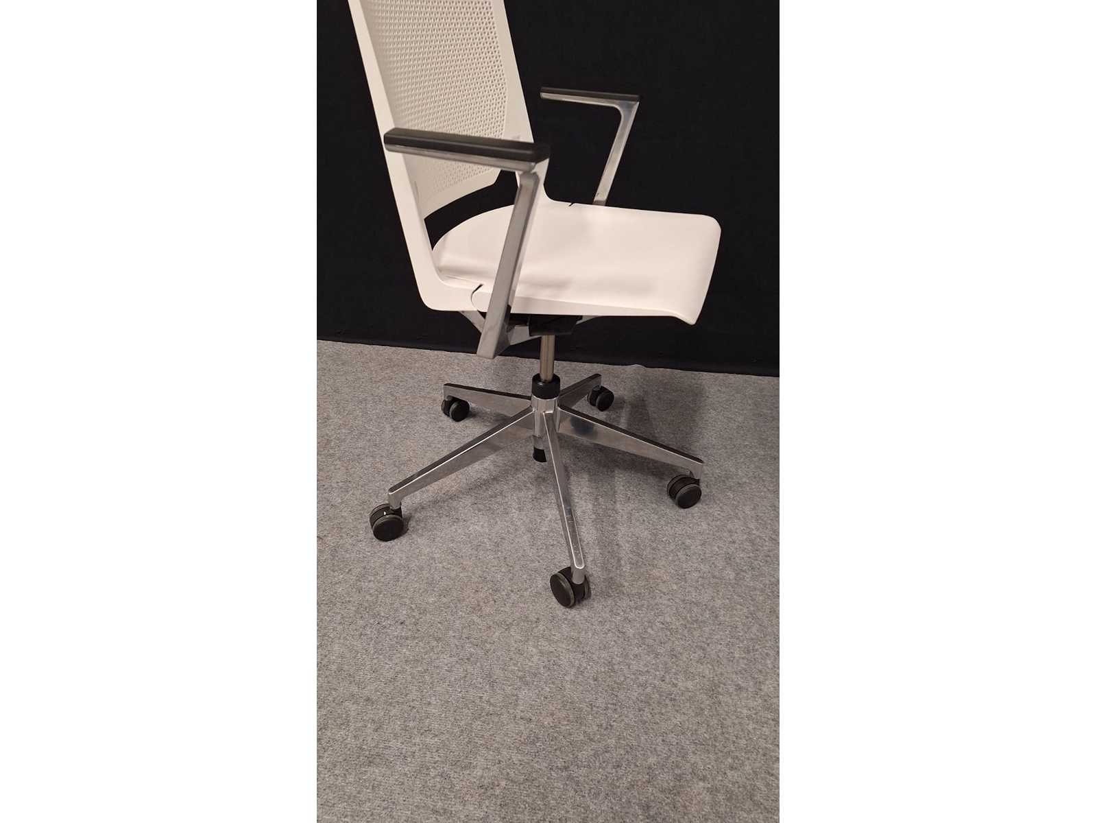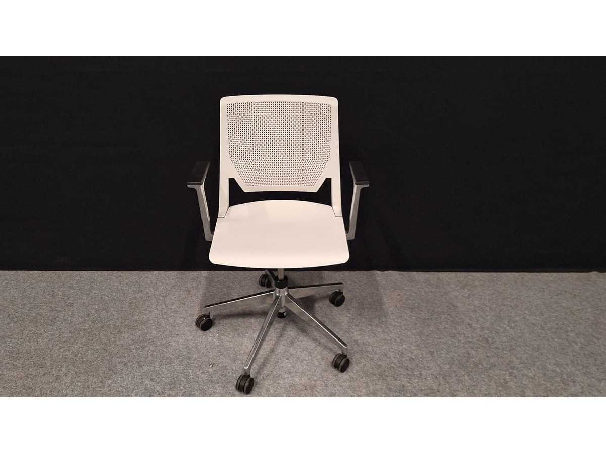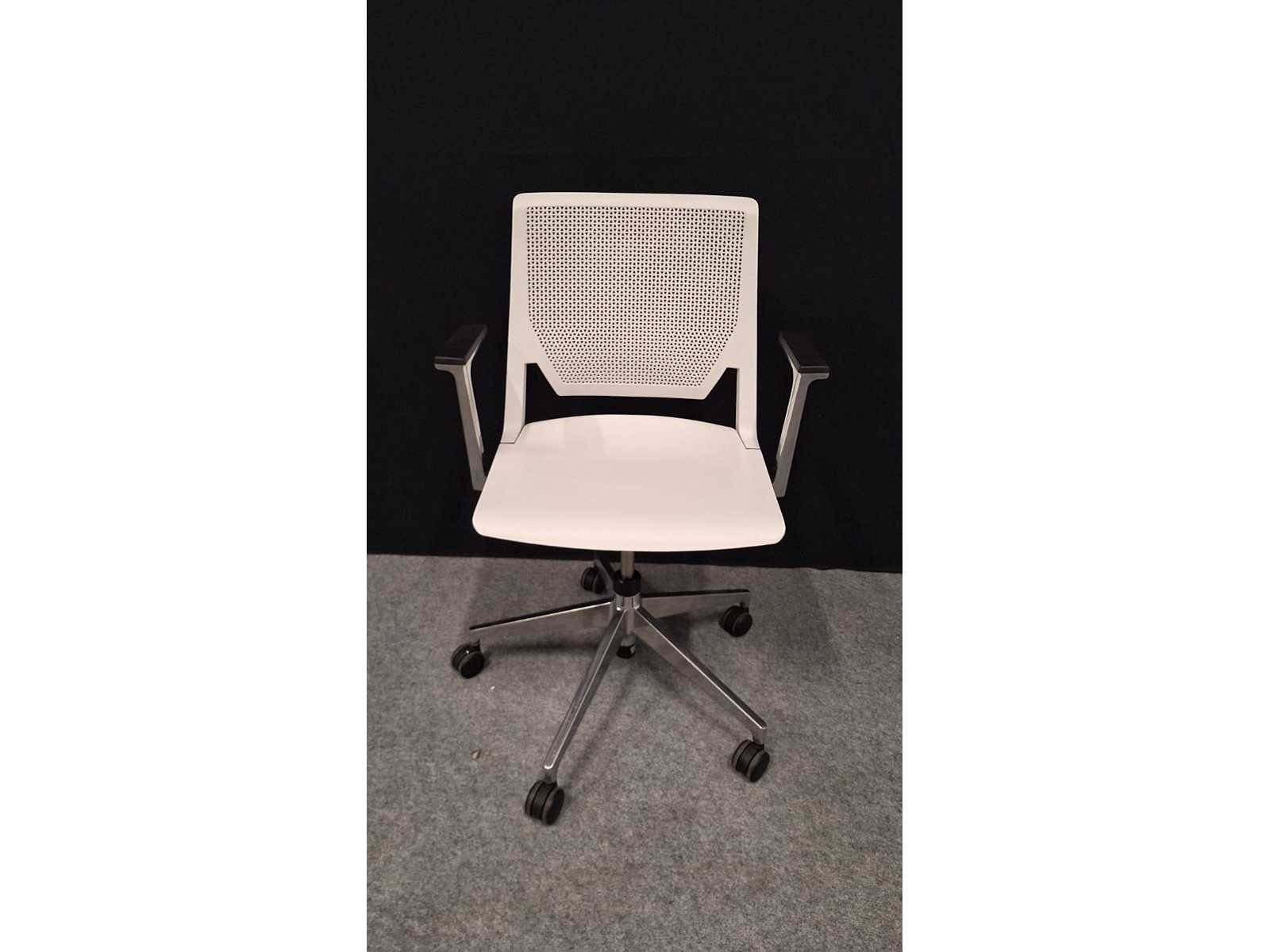 Voetkruis in gepolijst aluminium voorzien van multifunctionele zwenkwielen, armleuningen in gepolijst aluminium voorzien van kunststof leggers kleur Zwart, zitting en rugleuning in kunststof kleur Wit, mooie design vergadertafel stoel uit hoogwaardige materialen samengesteld, gebruikssporen aanwezig Merk: Haworth Kleur: alu-wit Materiaal: Aluminium, metaal, kunststof Zithoogte: 41-51cm Hoogte: 880cm Breedte: 65cm Diepte: 55cm Gewicht: 40kg
