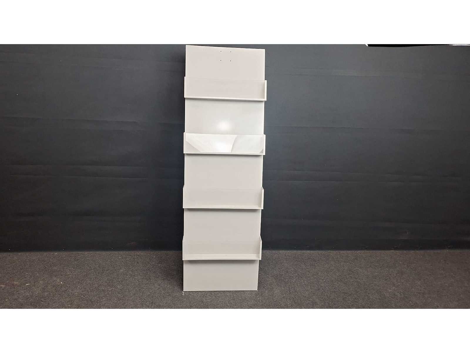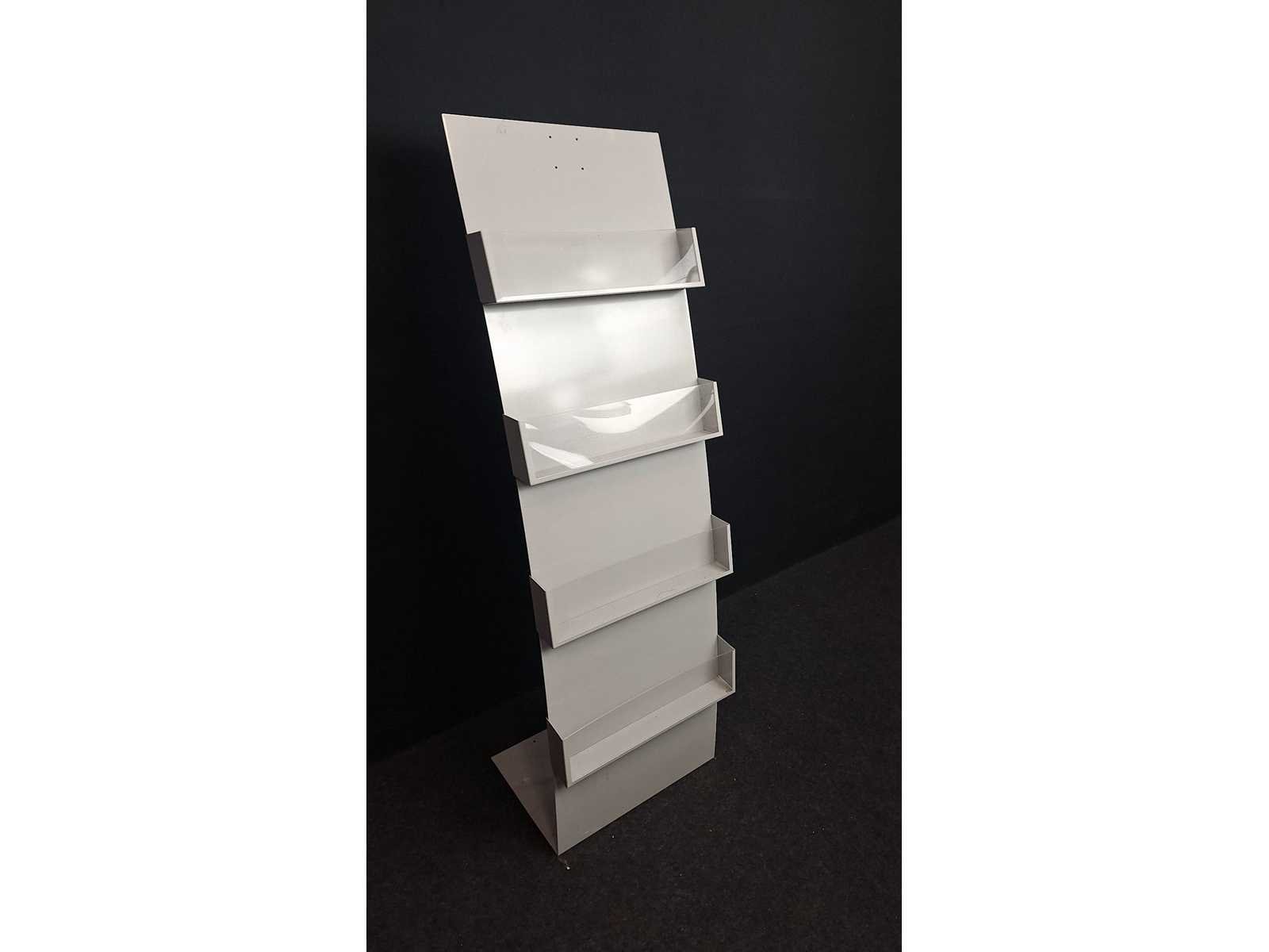 Folder voorzien van 4 houders in kunststof, lichte gebruikssporen mogelijk Kleur: Alugrijs Gewicht: 30kg Breedte: 48cm Hoogte: 150cm Diepte: 35cm Materiaal: Metaal, kunststof