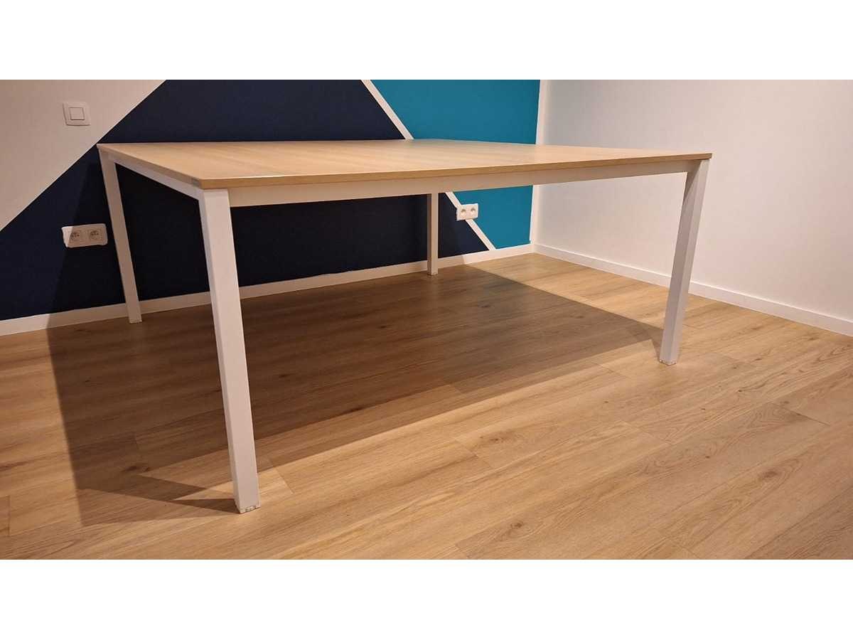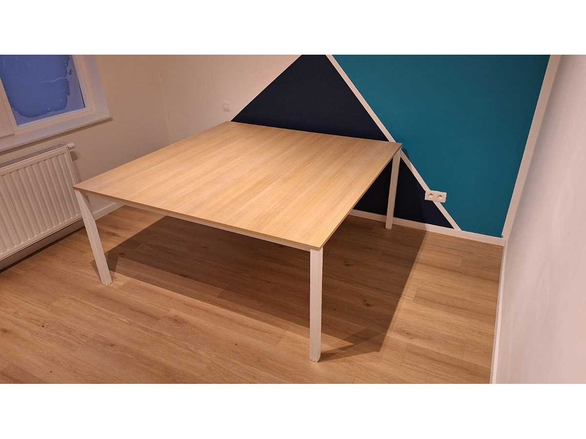 Onderstel in metaal kleur Wit, blad in melamine kleur lichte Eik, zeer goede staat Merk: Dromea Kleur: Wit-lichte Eik Gewicht: 80kg Lengte: 160cm Breedte: 160cm Hoogte: 74cm Materiaal: Metaal, hout, melamine, kunststof