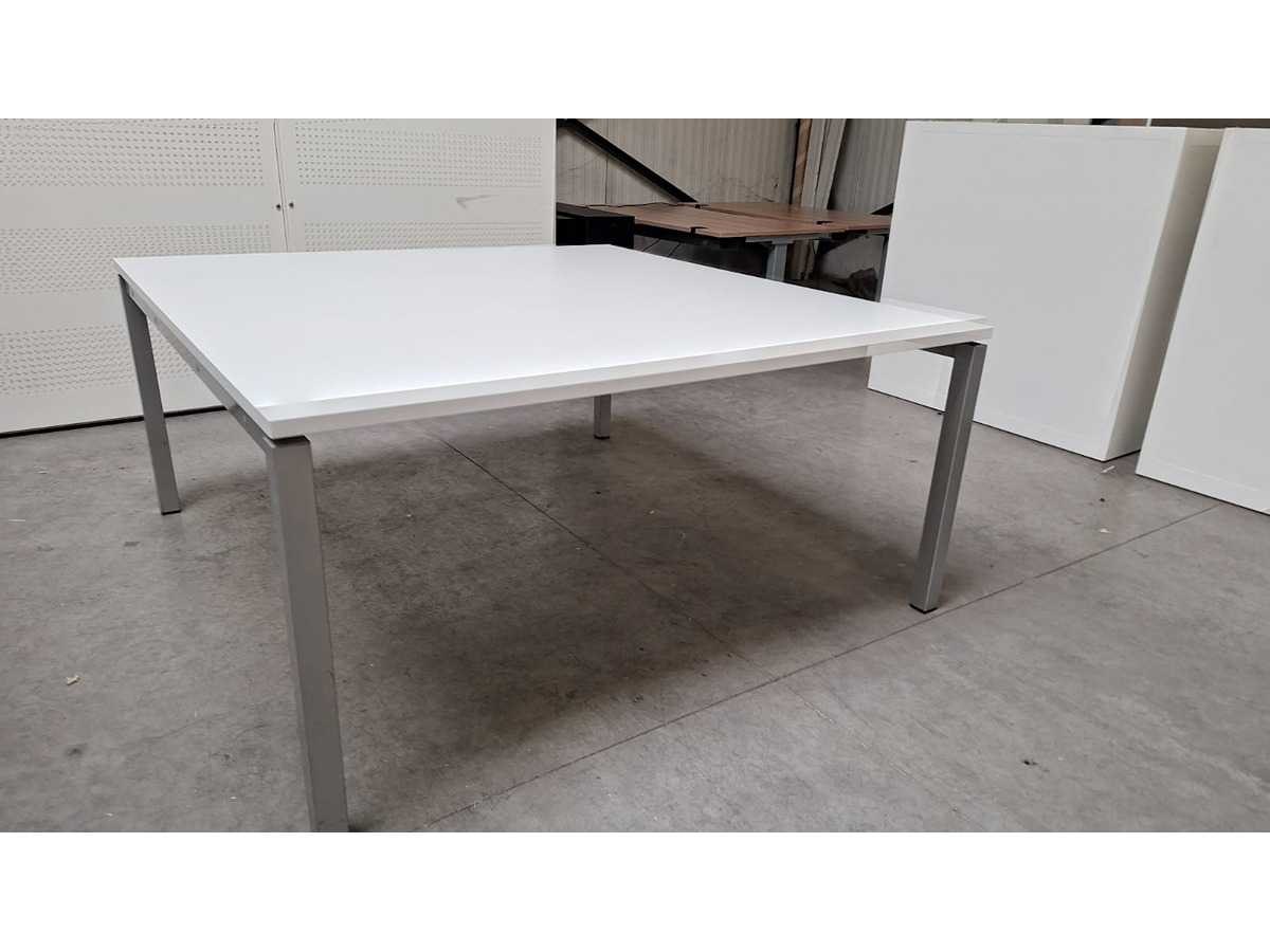 Onderstel in metaal kleur grijs, werkblad in melamine kleur wit, goede staat Merk: Robberechts Kleur: Grijs-Wit Gewicht: 50kg Lengte: 160cm Breedte: 160cm Hoogte: 74cm Materiaal: Metaal, kunststof, hout, melamine