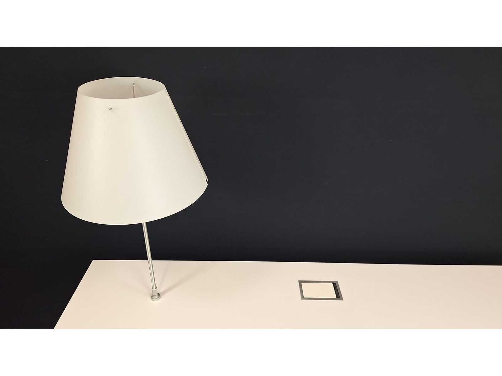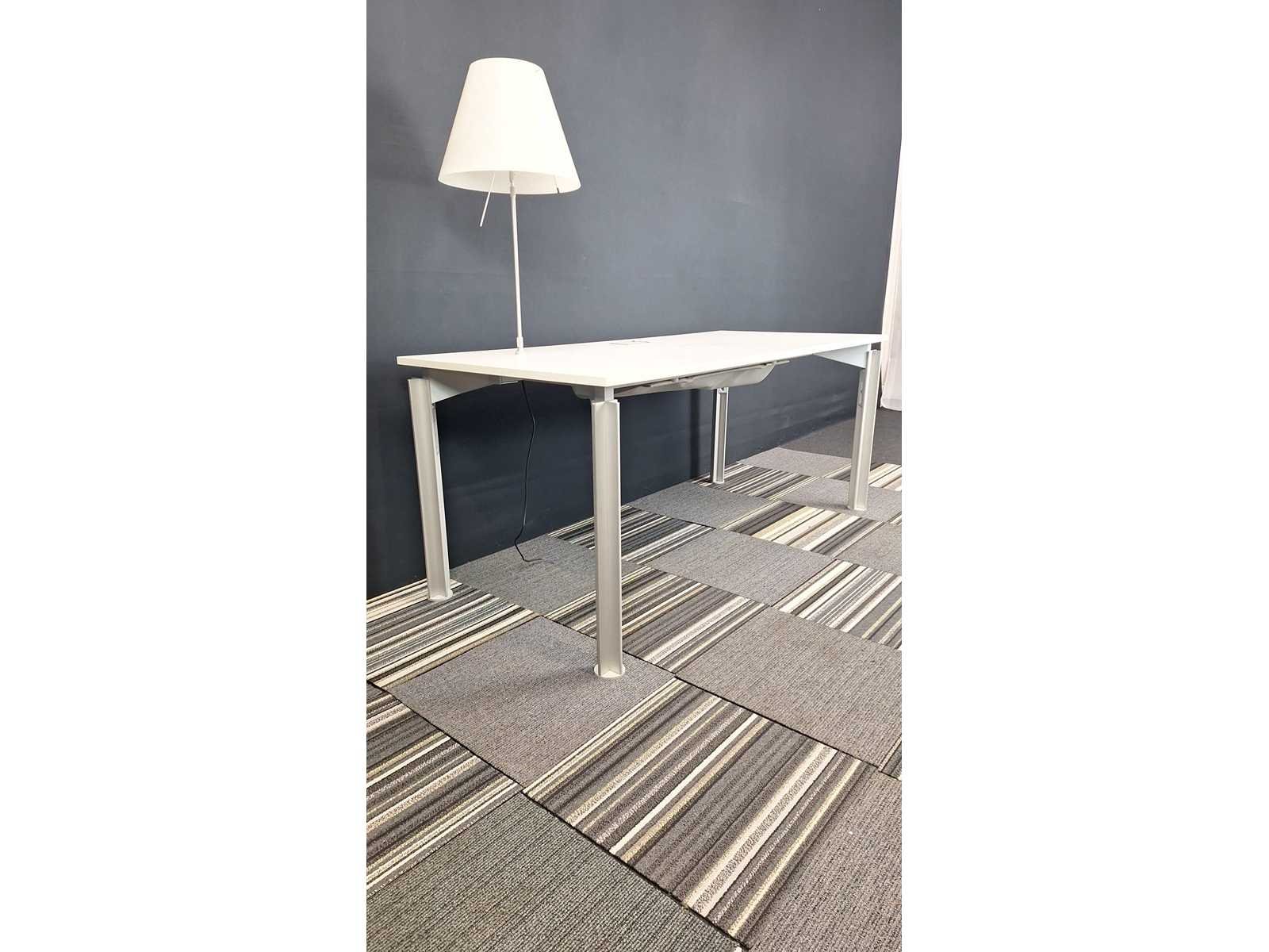 In hoogte verstelbaar onderstel in aluminium voorzien van kabelnet, werkblad in HPL kleur Alu-decor, voorzien van kabeldoorvoerklep en luceplan design bureaulamp, blad vertoont lichte gebruikssporen Merk: BULO Type: H2O Gewicht: 75kg Lengte: 180cm Hoogte: 65-80cm Materiaal: Metaal, aluminium, hout, kunststof, melamine Diepte: 80cm