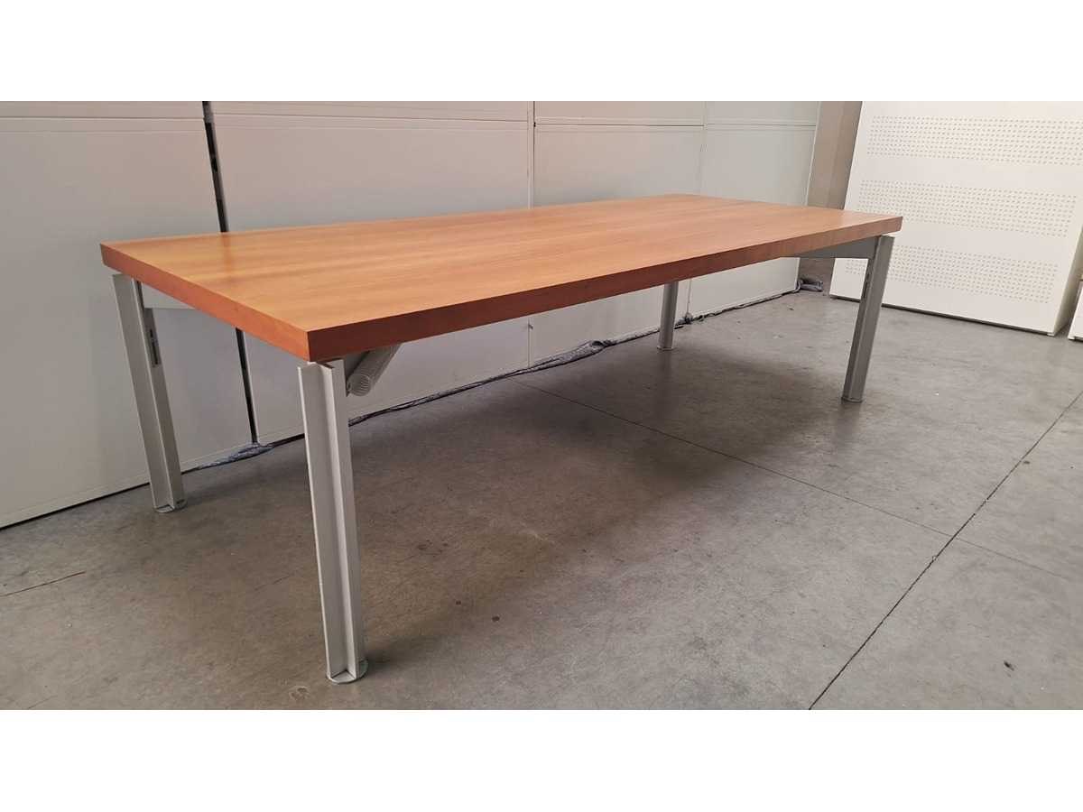 Massief blad afgewerkt met kersfineer, onderstel in aluminium in hoogte verstelbaar, blad vertoont lichte gebruikssporen (zie foto's) Merk: BULO Type: H2O Kleur: alu-kers Gewicht: 100kg Lengte: 240cm Hoogte: 65-80cm Materiaal: Metaal, aluminium, kunststof, hout Diepte: 1000cm