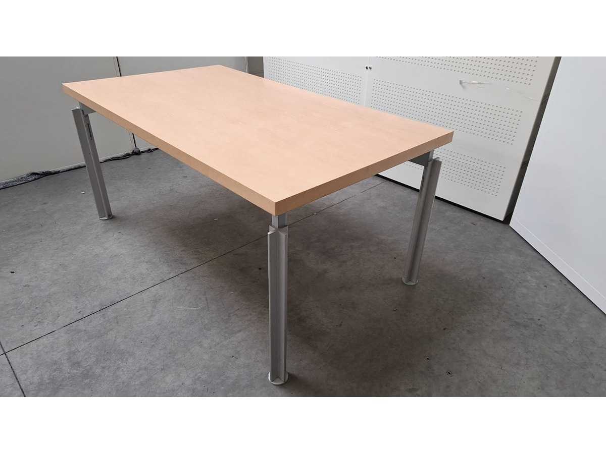 In hoogte verstelbaar onderstel in aluminium met kabelgoot, blad in hout afgewerkt met eikfineer, gebruikssporen aanwezig Merk: BULO Type: H2O Kleur: alu - eikfineer Gewicht: 100kg Lengte: 180cm Hoogte: 65-80cm Materiaal: aluminium, kunststof, hout Diepte: 100cm