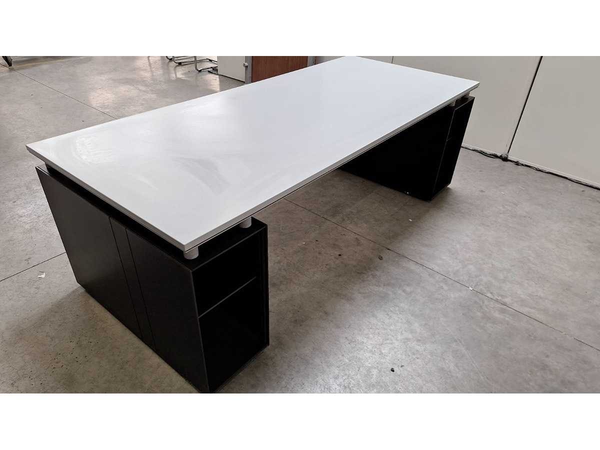 2 dragende ladenblokken in volkern kleur zwart, 1 ladenblok uitgerust met 2 gewone lades + 1 file lade, 1 ladenblok uitgerust met PC kast, achterzijde uitgerust met legplankjes, frame in metaal kleur aludecor, blad in melamine kleur alu decor, goede staat Merk: BULO Type: M Model: 233 Gewicht: 150kg Lengte: 233cm Hoogte: 74cm Materiaal: metaal, kunststof, hout, melamine Diepte: 100cm