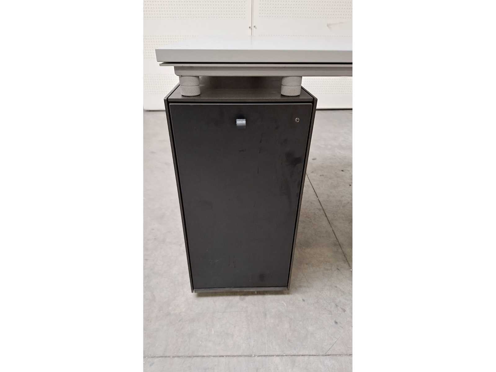 2 dragende ladenblokken in volkern kleur zwart, 1 ladenblok uitgerust met 2 gewone lades + 1 file lade, 1 ladenblok uitgerust met PC kast, achterzijde uitgerust met legplankjes, frame in metaal kleur aludecor, blad in melamine kleur alu decor, goede staat Merk: BULO Type: M Model: 233 Gewicht: 150kg Lengte: 233cm Hoogte: 74cm Materiaal: metaal, kunststof, hout, melamine Diepte: 100cm