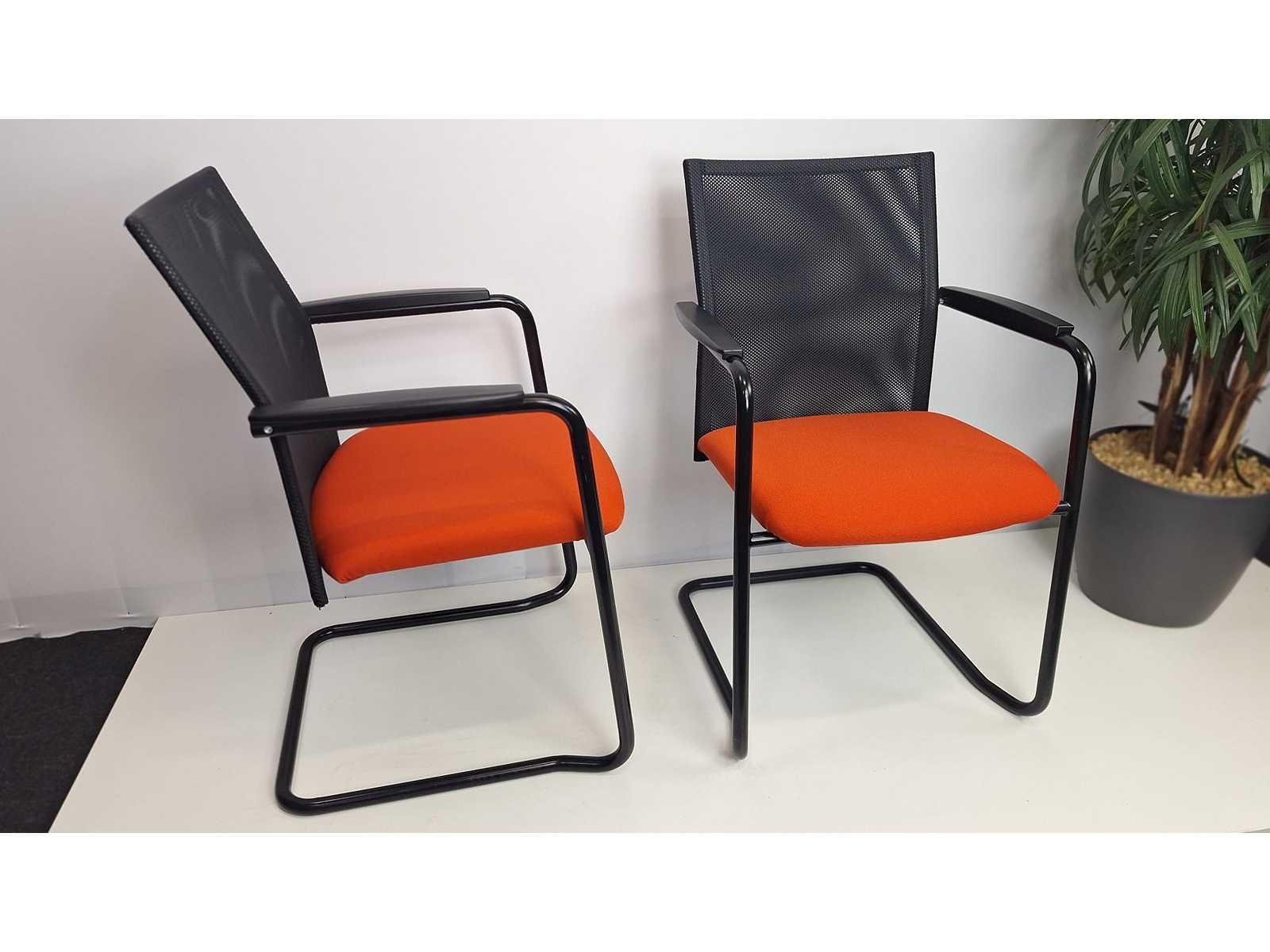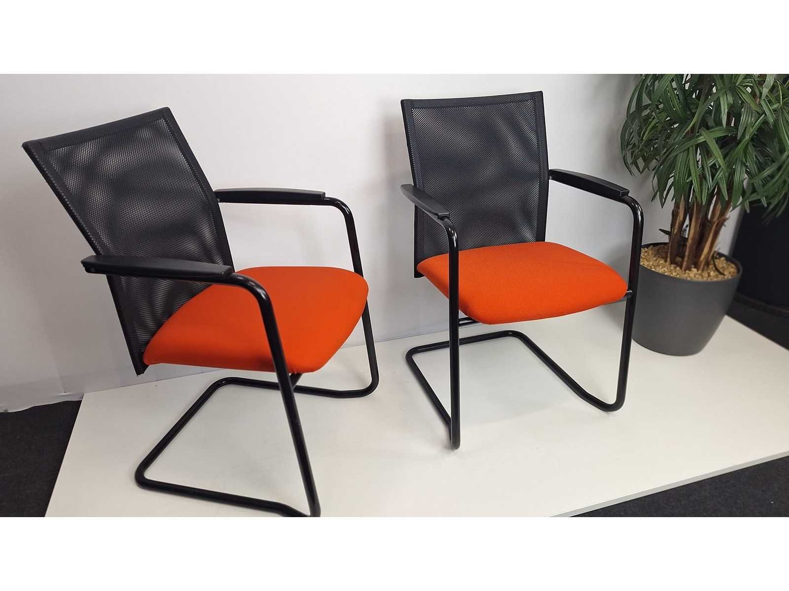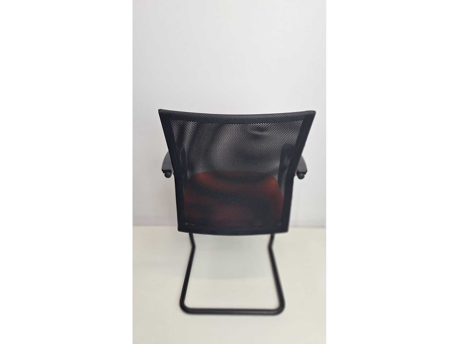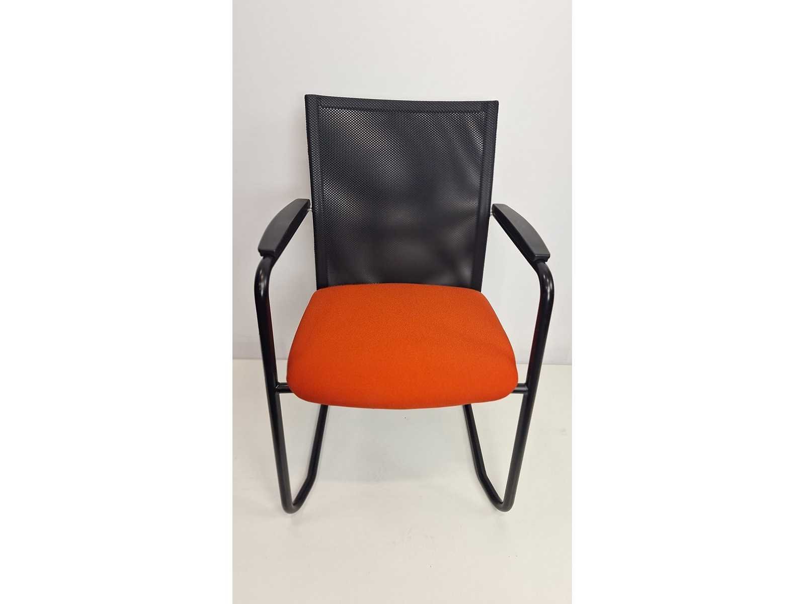 Sledeonderstel in metaal kleur Zwart, zitting bekleding in stof kleur Rood, rugleuning in netweave kleur Zwart, armleuningen in kunststof kleur Zwart, goede staat Merk: Haworth-Comforto Kleur: Zwart-Rood Materiaal: Metaal, kunststof, stof Zithoogte: 47cm Hoogte: 89cm Breedte: 59cm Diepte: 50cm Gewicht: 25kg