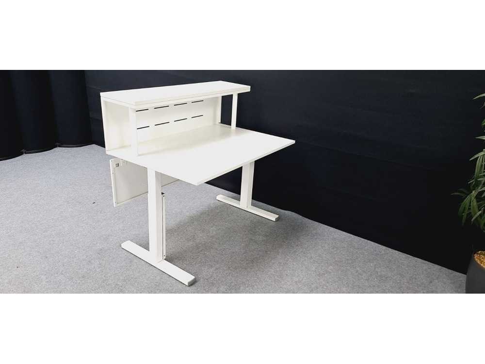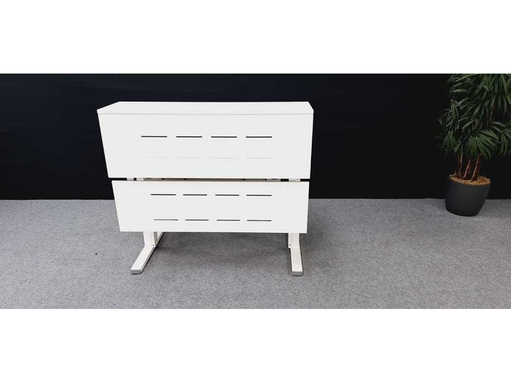 In hoogte verstelbaar onderstel in metaal kleur Wit met kabelgoot, blad in melamine kleur Wit, voorzijde voorzien van schaamschot in metaal kleur Wit, afm bureau 1200 x 800 mm (b x d) hoogte instelbaar werkblad: 620 - 820 mm, in goede staat Merk: Pami Kleur: Wit Gewicht: 75kg Lengte: 120cm Hoogte: 123cm Materiaal: Metaal, kunststof, hout, melamine