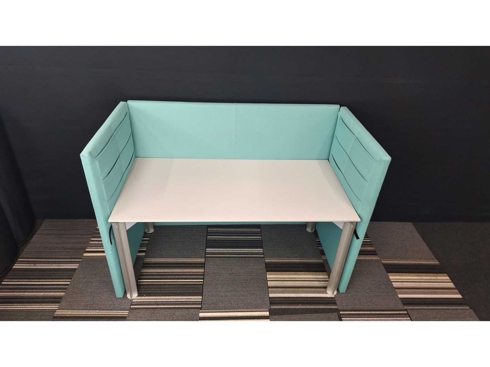 Bureau BULO H2O in hoogte verstelbaar (650 - 800 mm) onderstel in aluminium, blad in HDPE kleur Alu-decor, akoestisch privacy scherm bekleed met stof kleur Turquoise, in zeer goede staat enkel lichte gebruikssporen op werkblad Merk: BULO Type: H2O Kleur: Grijs-Alu-Turqoise Gewicht: 100kg Lengte: 160cm Hoogte: 65-80cm Materiaal: Metaal, aluminium, hout, kunststof, melamine, stof Diepte: 80cm