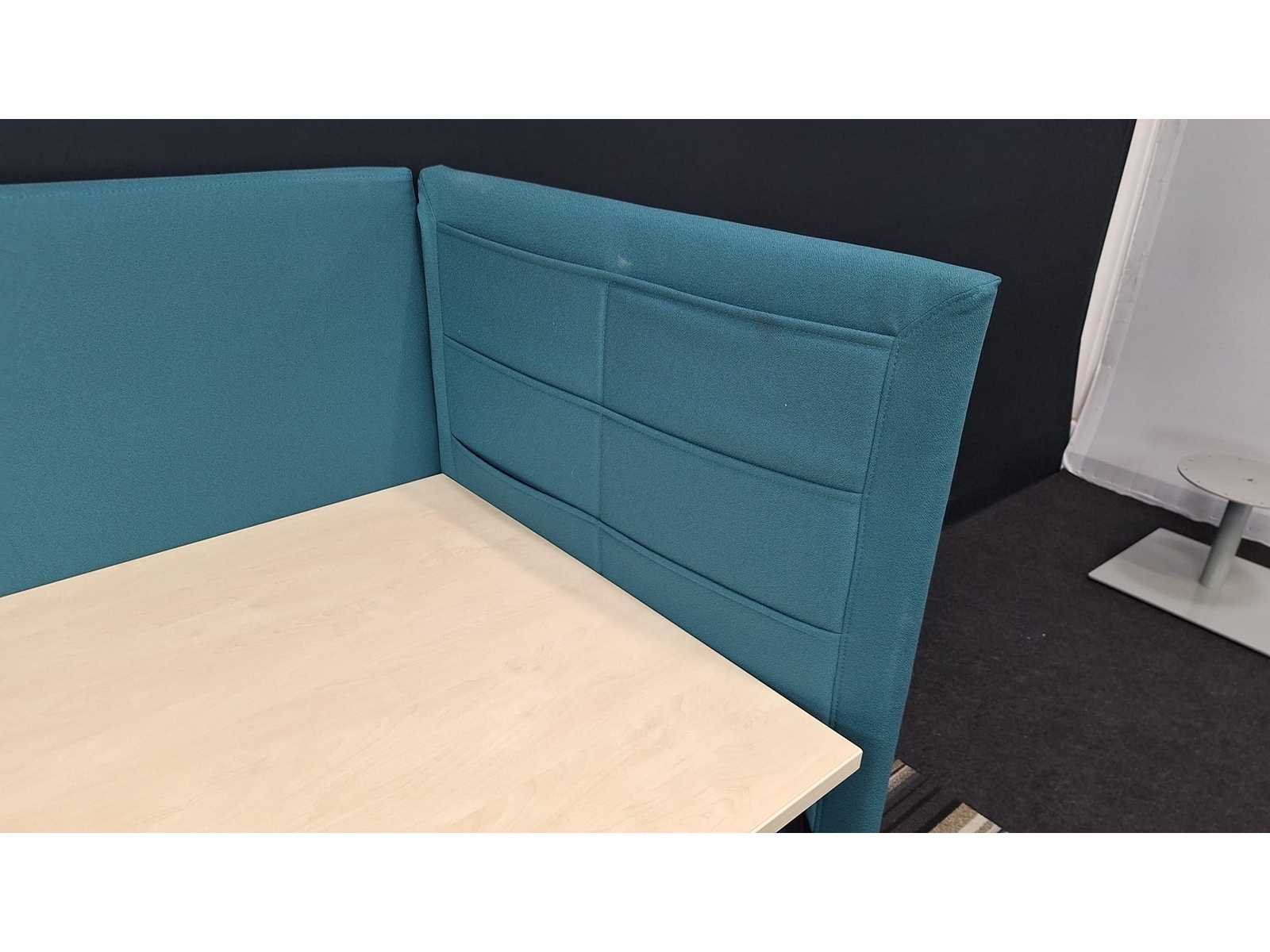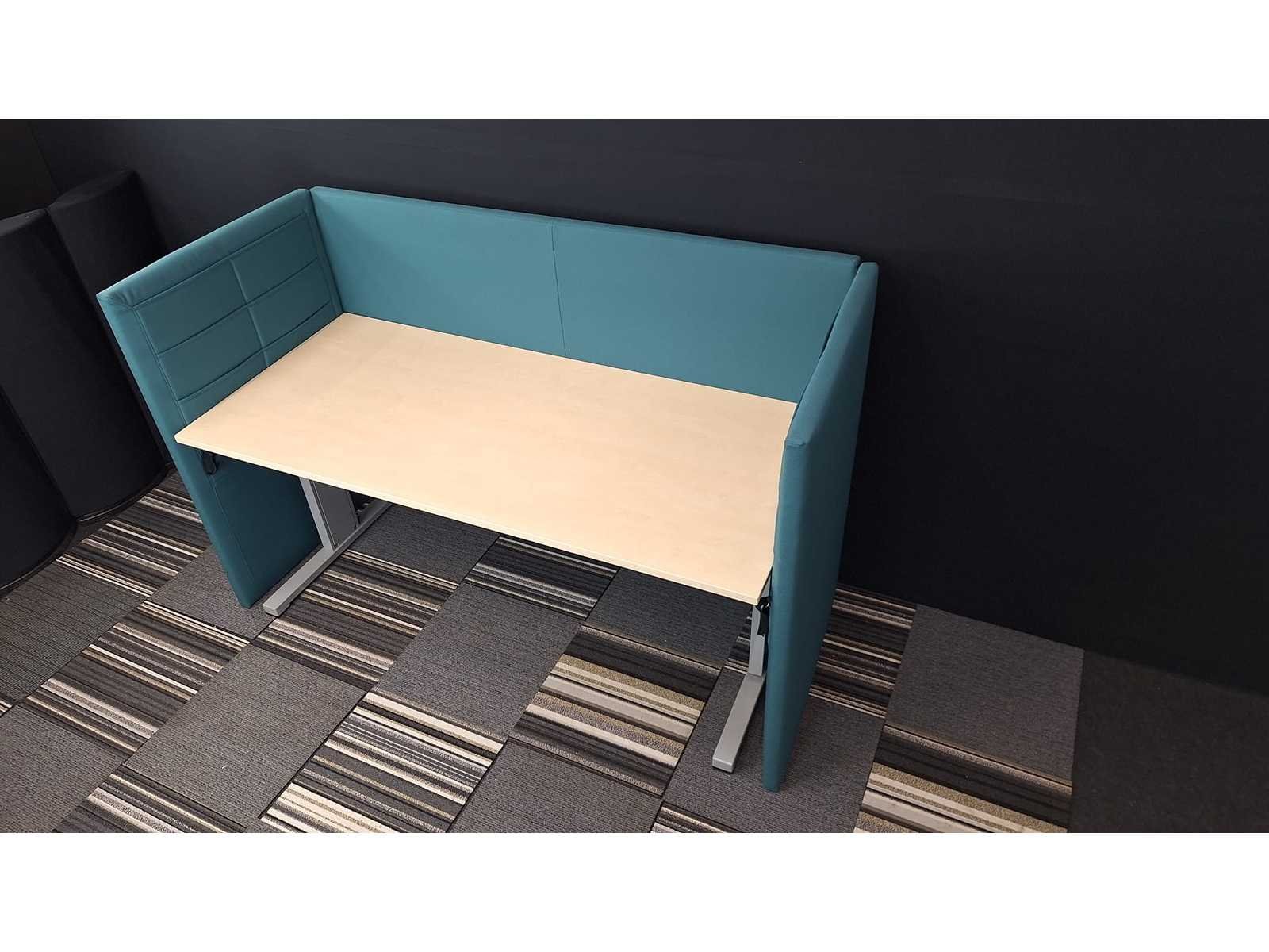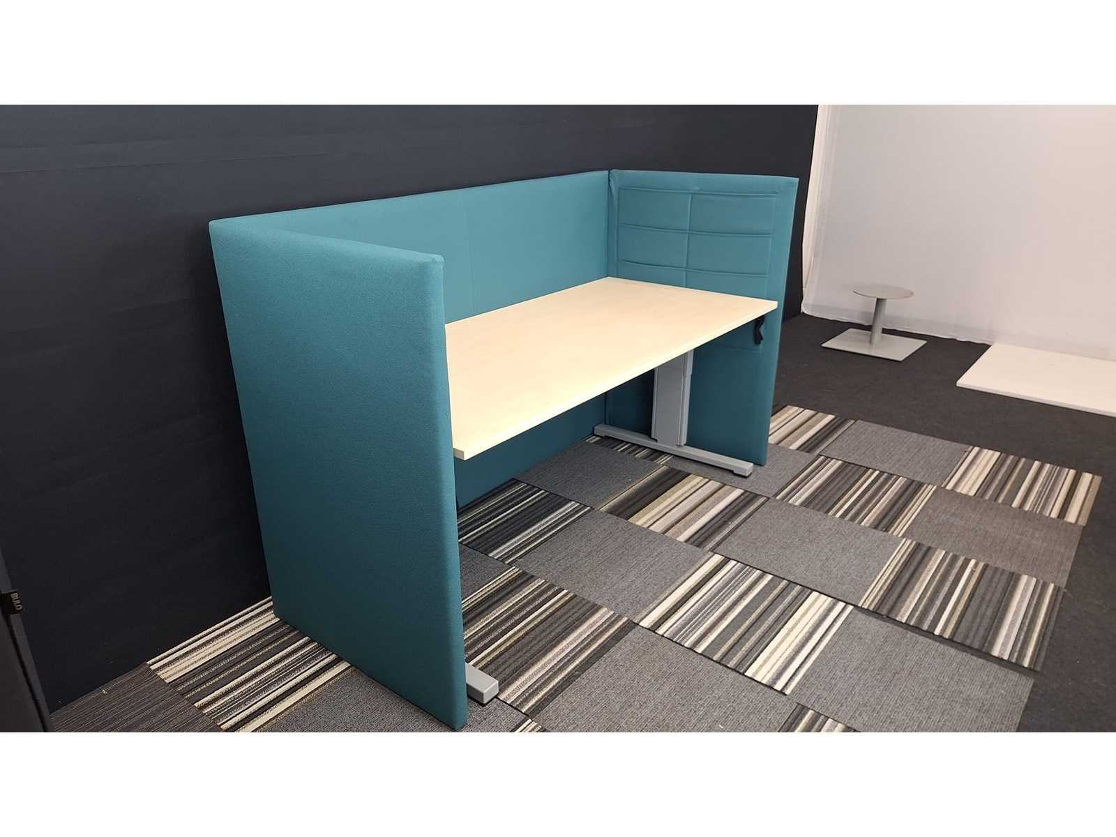 Bureau Pami, in hoogte verstelbaar (620 - 820 mm) onderstel in metaal kleur Alu, blad in melamine kleur Ahorn, akoestisch privacy scherm bekleed met stof kleur Turquoise, in zeer goede staat Merk: Pami Kleur: Grijs-Alu-Turqoise Gewicht: 100kg Lengte: 180cm Hoogte: 62-82cm Materiaal: Metaal, aluminium, hout, kunststof, melamine, stof Diepte: 80cm