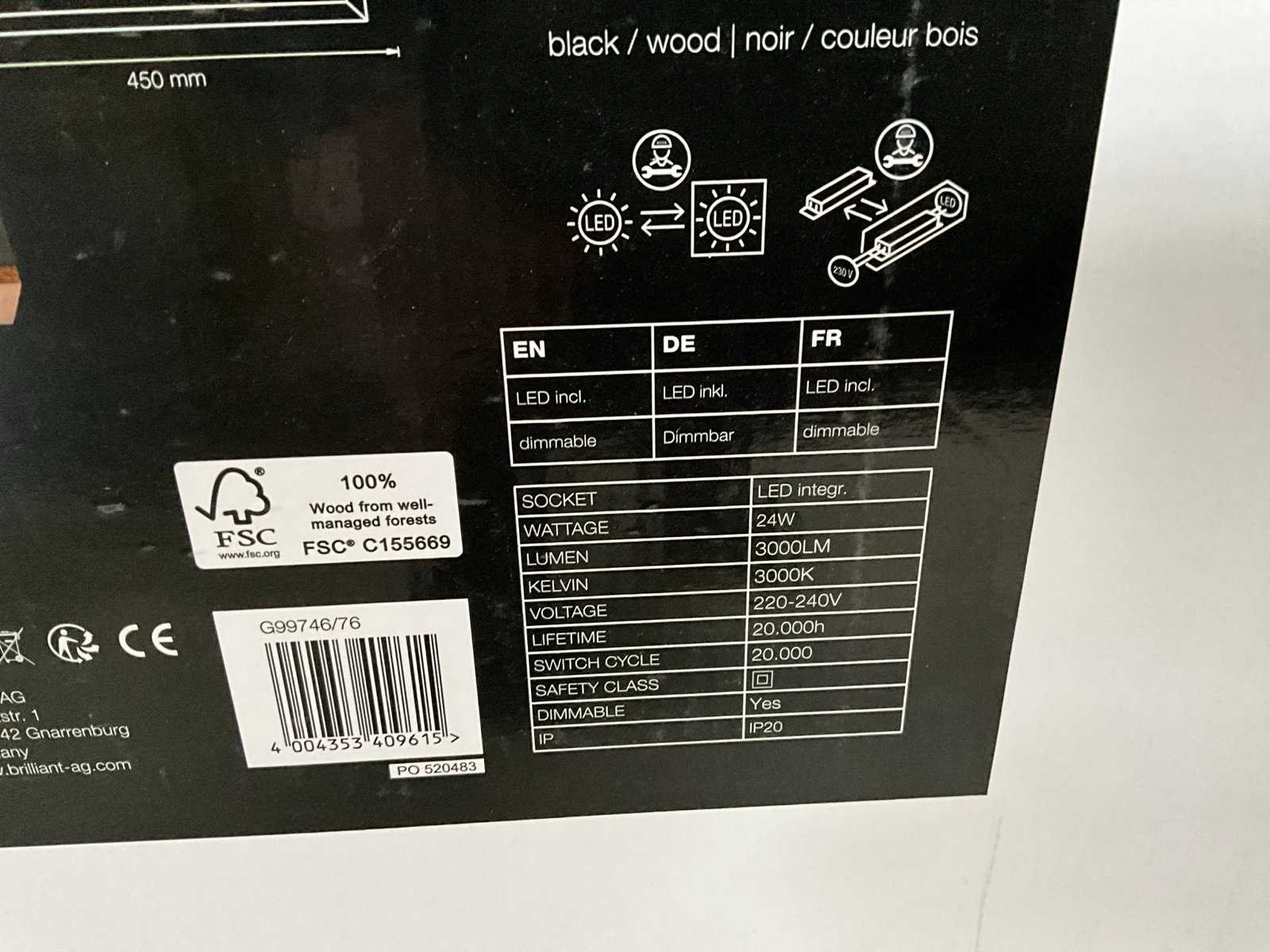 Merk: Brilliant Model: Loneos Lichtbron: Led Met lichtbron: true Kleurtemperatuur: 3000k Dimbaar: true Wattage: 24W Kleur: Zwart, hout Lengte: 45cm Breedte: 40cm Hoogte: 4.6cm Materiaal: Hout, metaal, kunststof