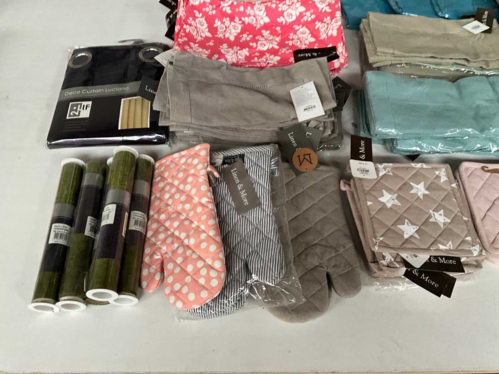 Kavel o.a. bestaande uit: placemats, tafelkleden, pannenlappen. Merk: Linen & More