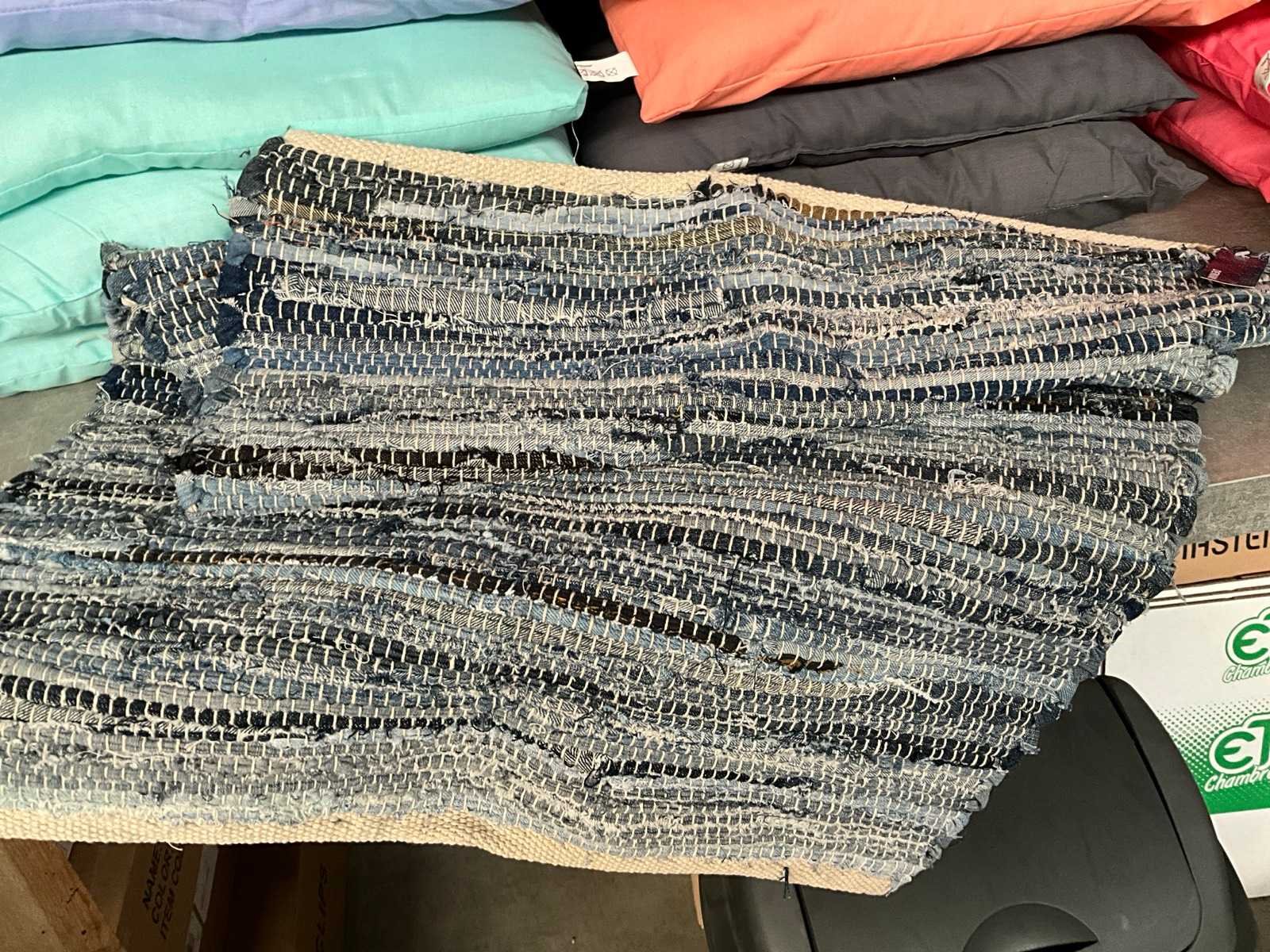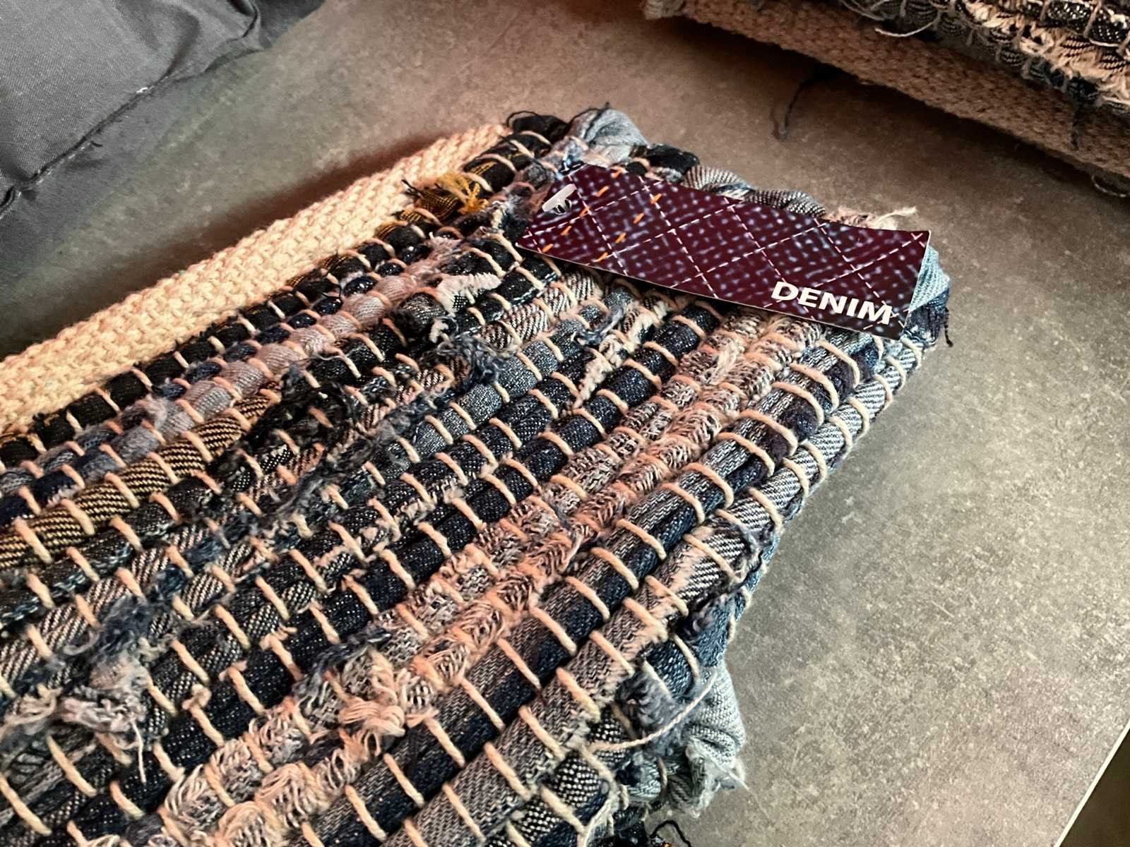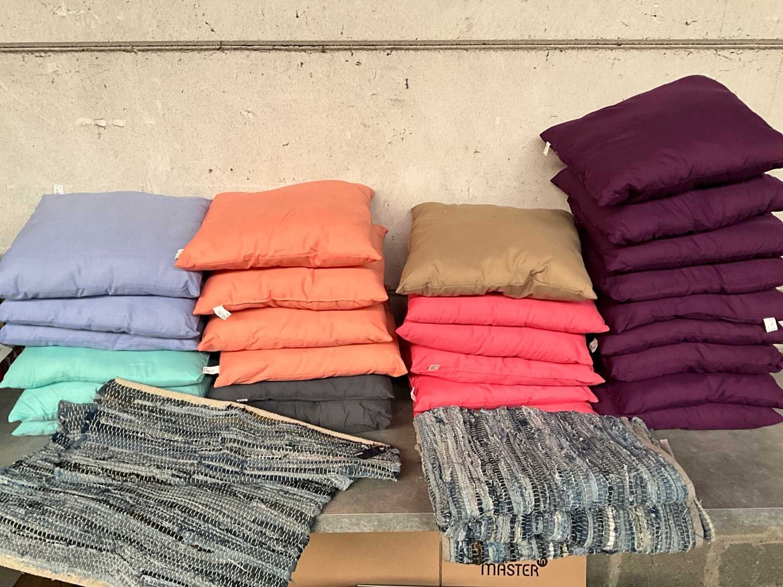 Kavel bestaande uit; 27x sier kussen, 3x denim kleed 90 x 60 cm. Lengte: 40cm Breedte: 40cm