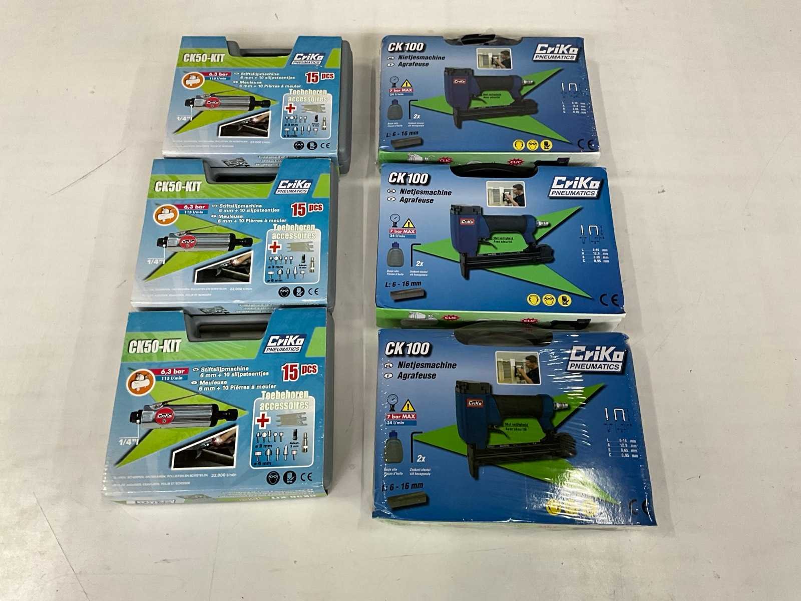 Kavel bestaande uit; 3x Criko CK100 nietjes machine, 3x CK50-Kit stiftslijpmachine 6 mm + 10 slijpsteentjes.