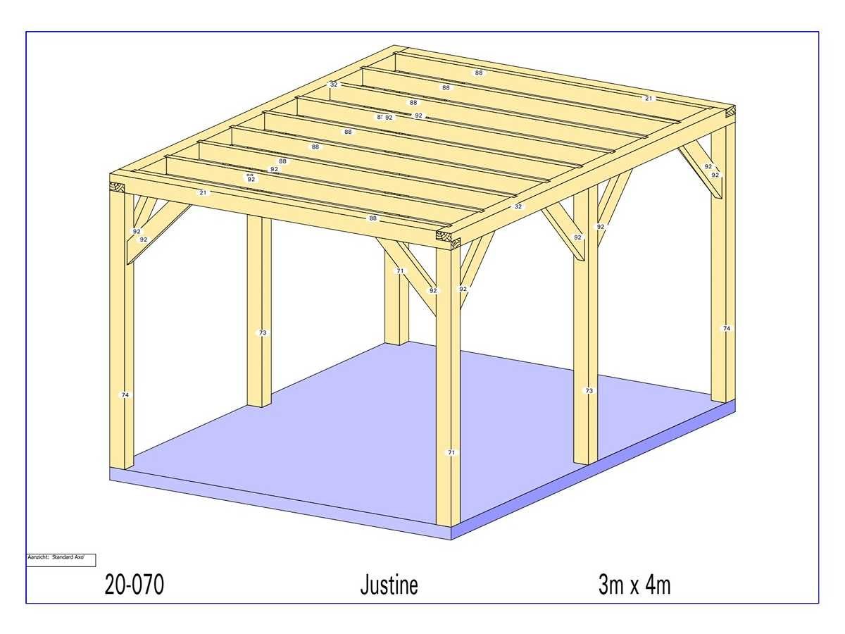 <li>Totaal afmeting pakket (transport): circa 4000x1000x700 mm </li><li>Kopmaat liggers: 130x60 mm </li><li>Aantal draagsteunen: 6 stuks </li><li>Kopmaat staanders 130x130 mm </li><li>Referentie: Justine </li><li>Handleiding opbouw: aanwezig met QR code </li> Model: 20-070 Gewicht: 700kg Lengte: 400cm Breedte: 300cm Hoogte: 233cm Materiaal: Europese eiken