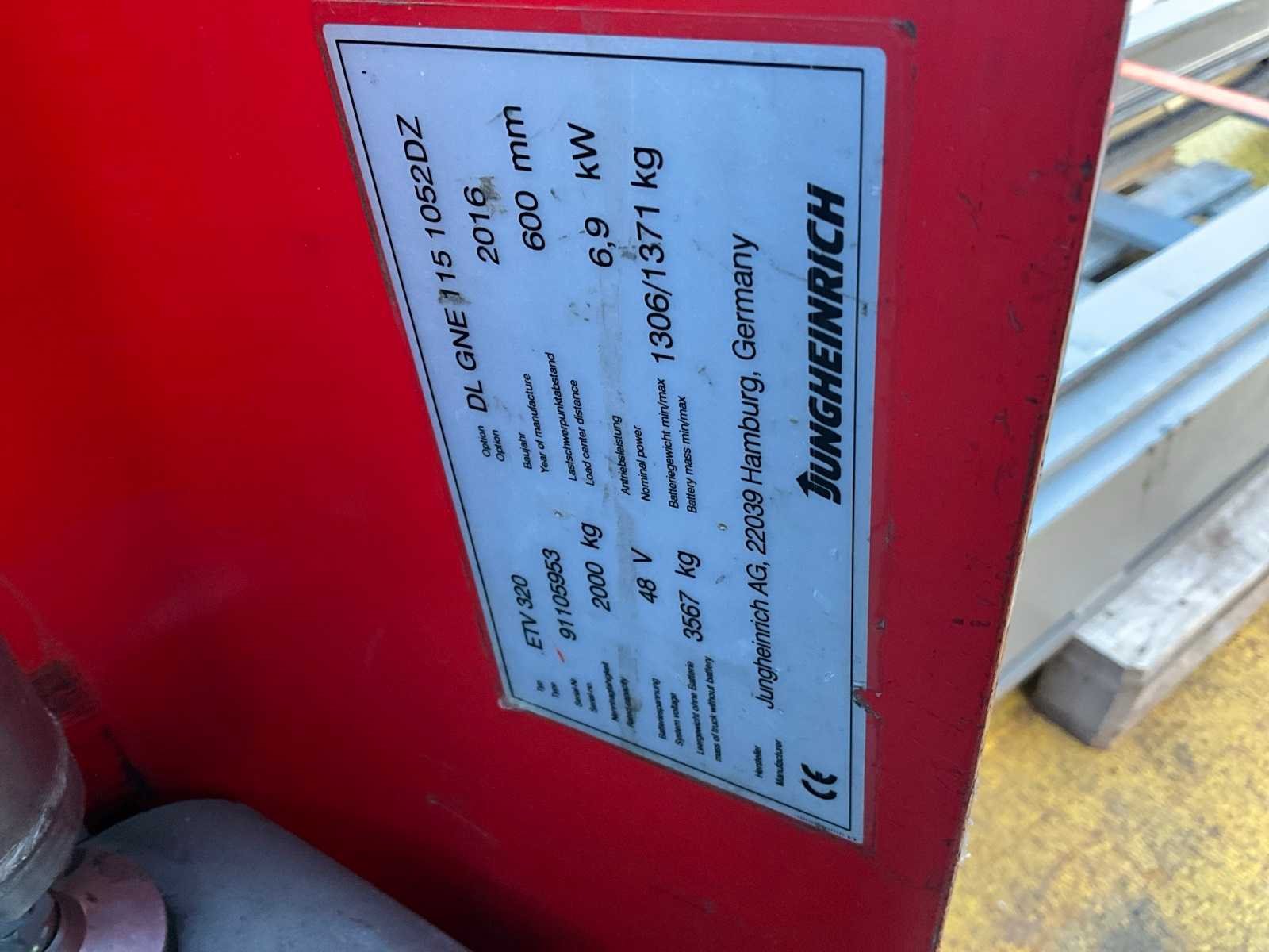 BATTERIJ NA TE ZIEN, niet werkend, mast is reeds gedemonteerd lengte 4100 mm Merk: Jungheinrich Type: ETV320 Bouwjaar: 2016 Serienummer: 91105953 Brandstof: Electrisch Mast: Triplex Aantal wielen: 3 Afgelezen urenstand: 15047 Accu lader: true Free-lift: true Side-shift: true Triple mast: true Eigen gewicht: 4800kg Hefvermogen: 2000kg Lepellengte: 1150mm Max. hefhoogte: 10500mm Totale afmeting L: 1900mm Totale afmeting Breedte: 1300mm Totale afmeting Hoogte: 2200mm Elektrisch: true