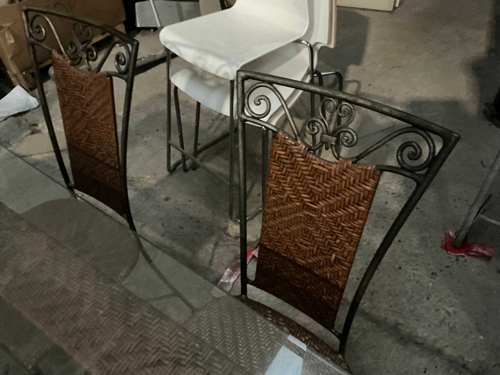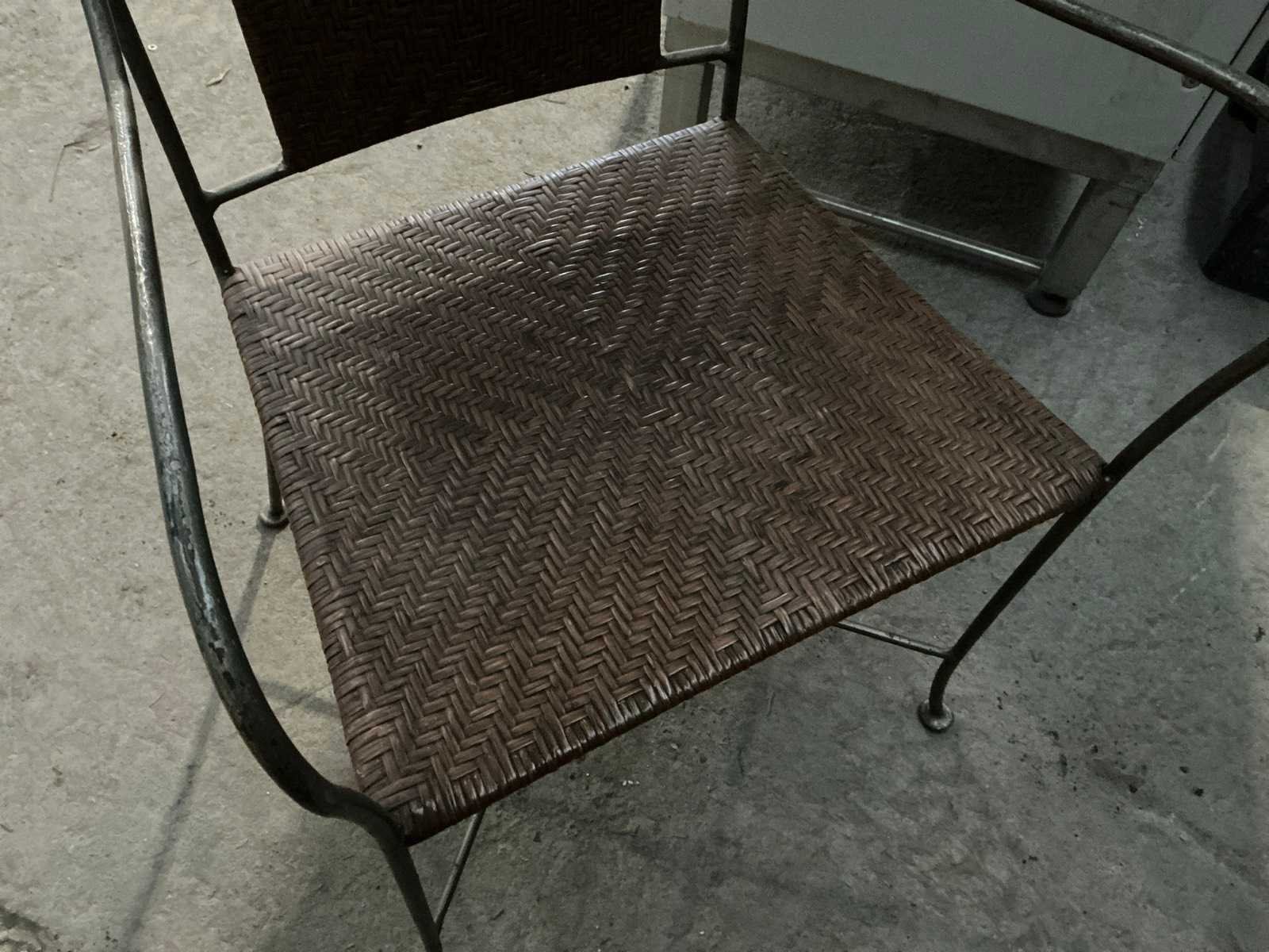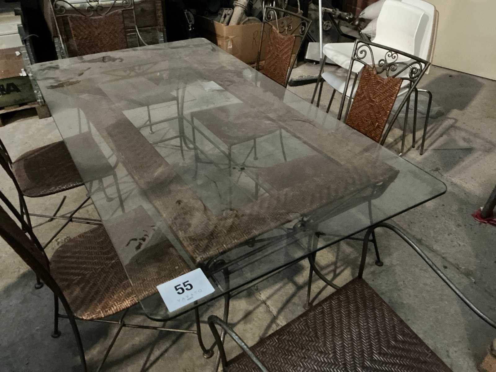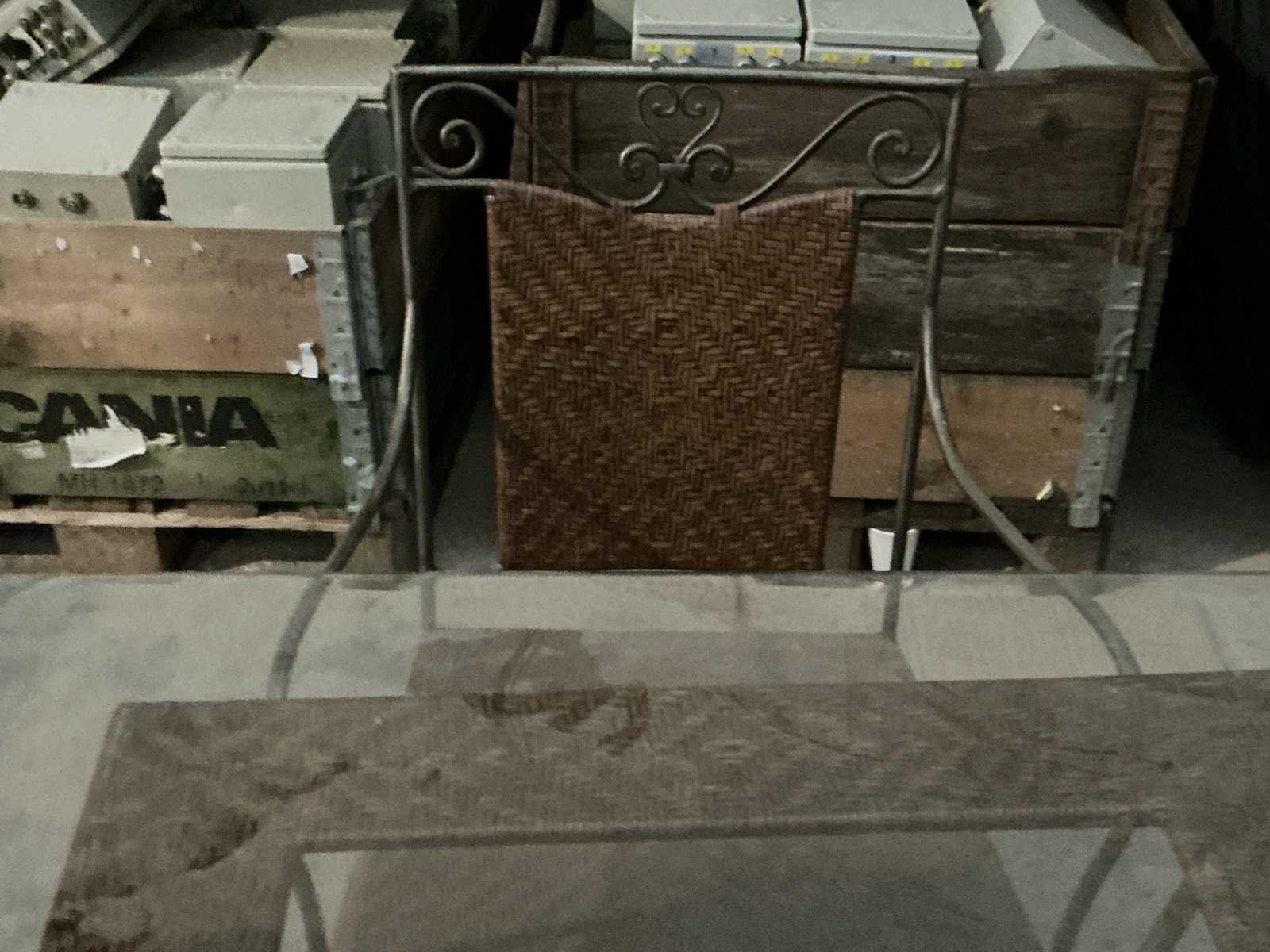 Bestaande uit: smeedijzeren tafel met glazen blad afmetingen: 163x90 cm. 6x smeedijzeren stoel. 2 verschillende types.