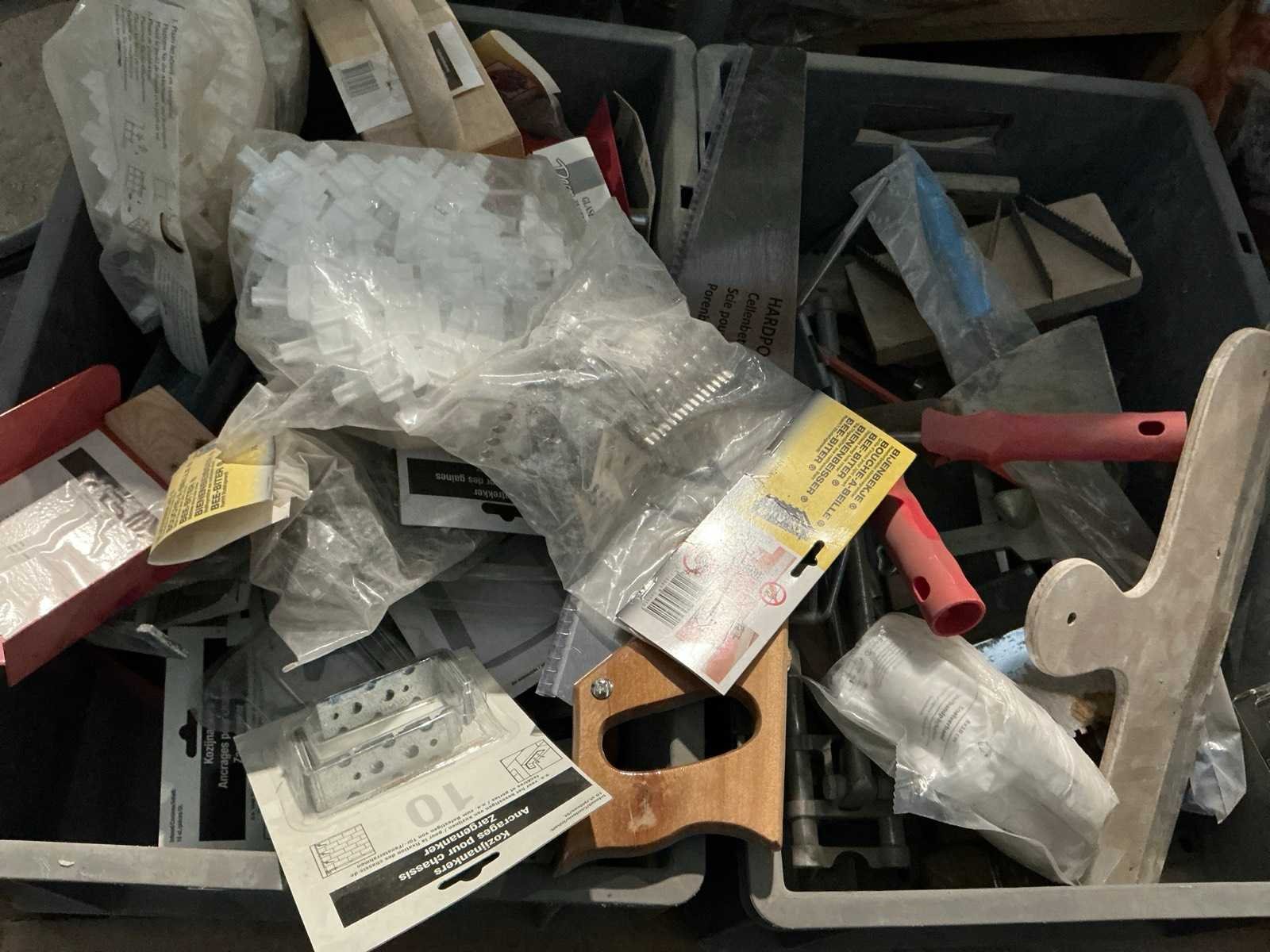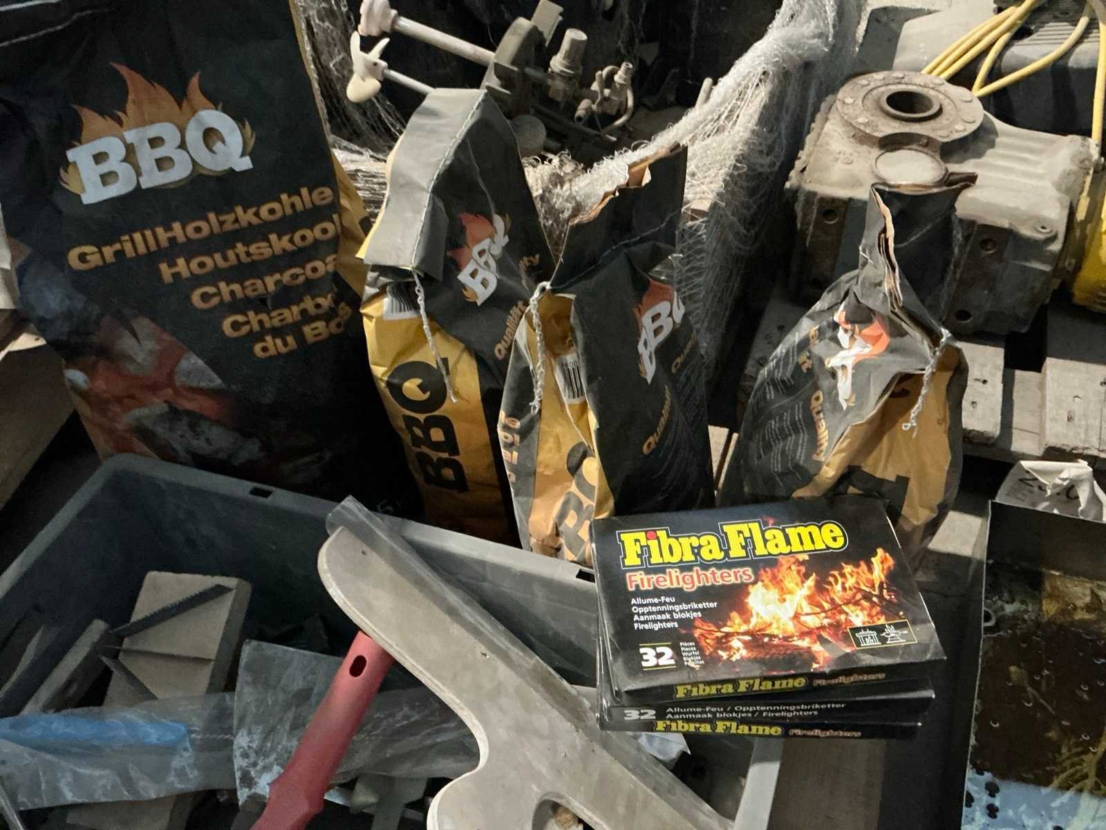 Waaronder stukadoorsmessen, glasblokkruisjes, handzaag, bijenbekjes, kozijnankers en cellenbetonrasp, Compleet met 4 zakken houtskool waaronder 3x 2kg en 1x 5kg en 3 pakken aanmaakblokjes, Liggende op 1 pallet Merk: Partij