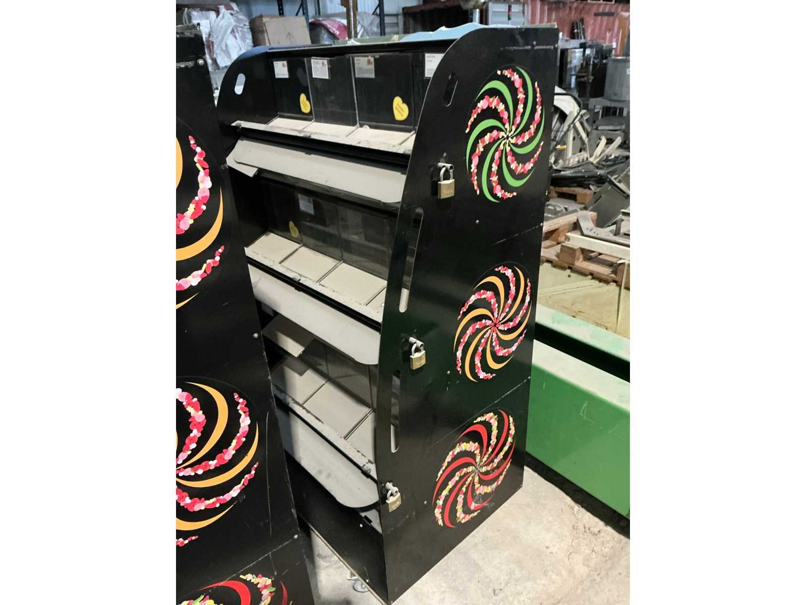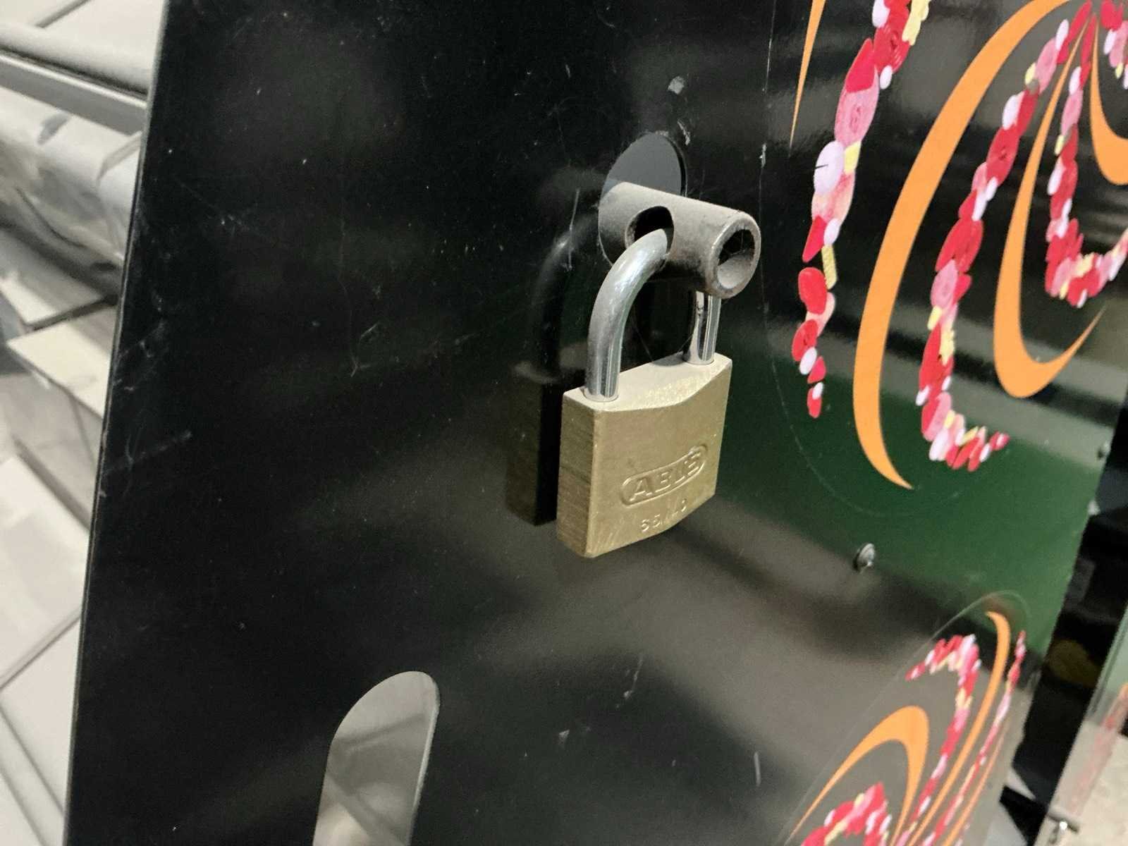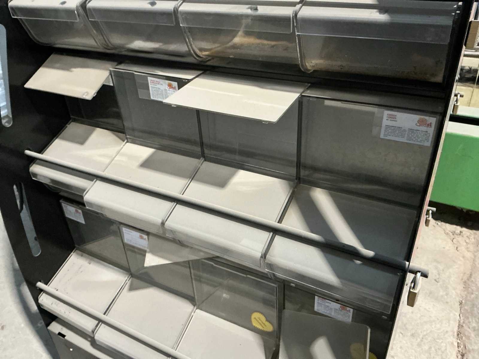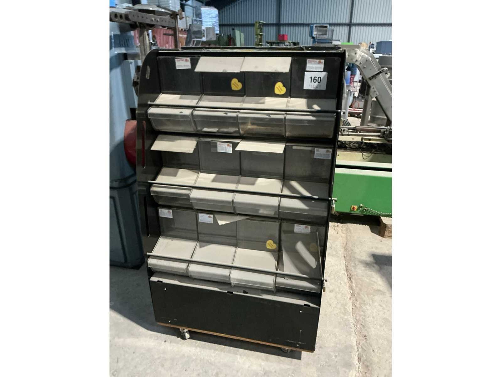 Metalen mobiel rek met 12 kunststof grijpbakken. Afsluitbaar, sleutels ontbreken Afmeting l: 630mm Afmeting b: 910mm Afmeting h: 1550mm