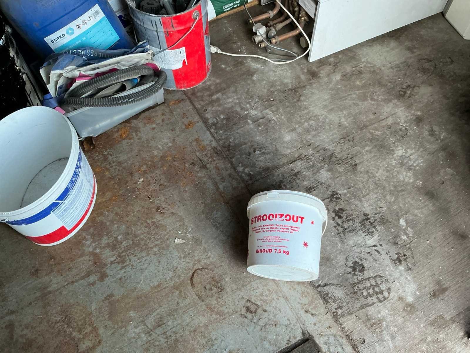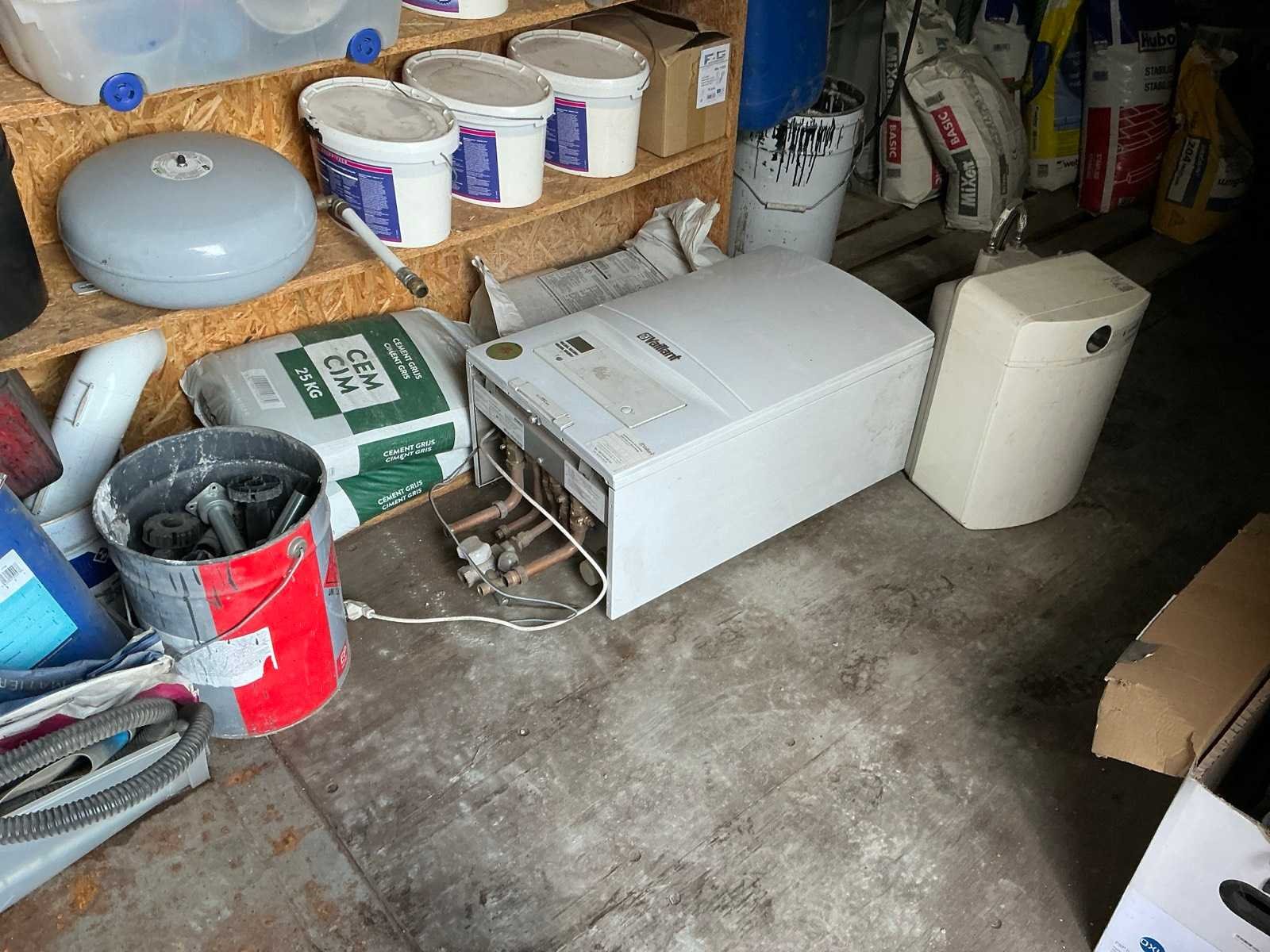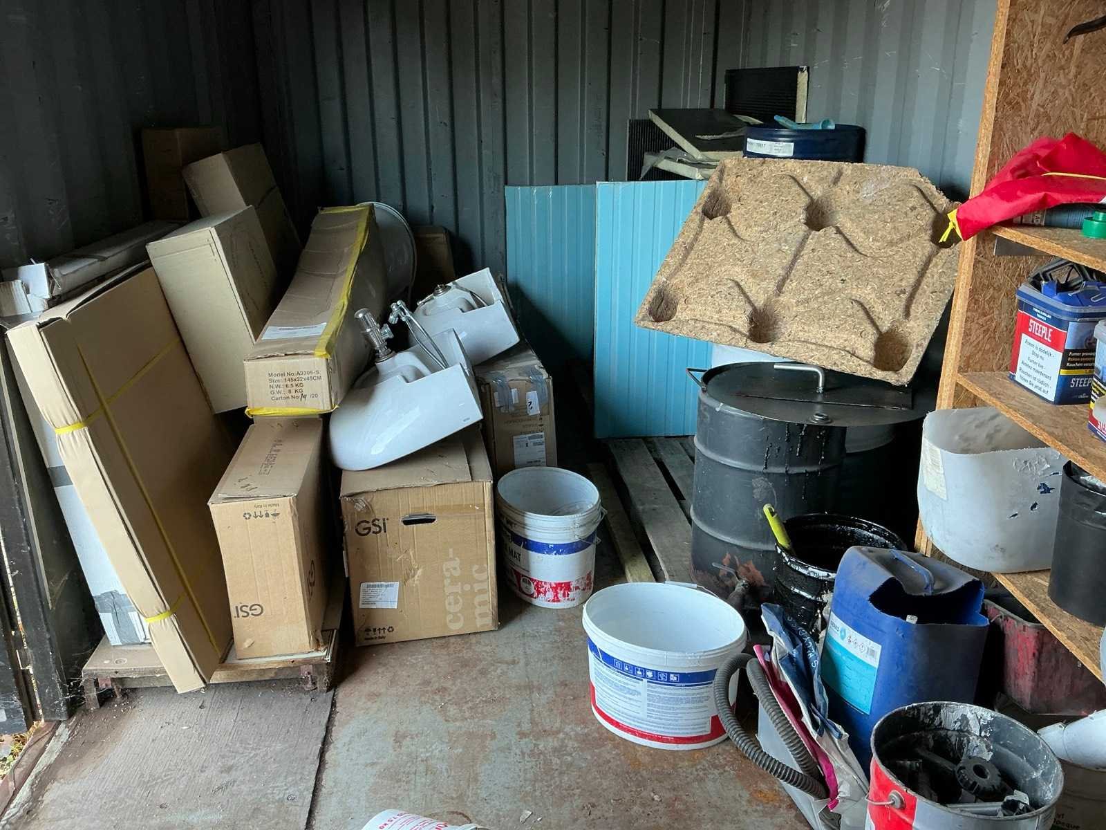 Alles moet worden meegenomen. Bestaande uit: diverse badkamermeubels, toiletten, diverse vloeistoffen, vaten, boiler Vaillant, heteluchtkannon, stofzuiger, kabels, touw, douchebakken, steenwol, enz.