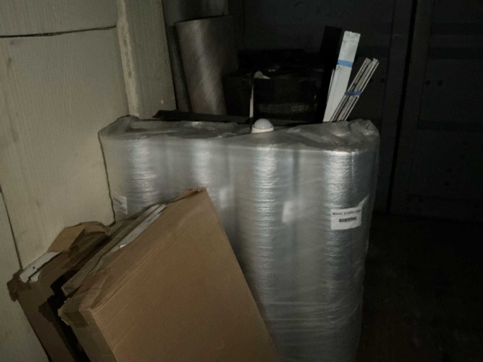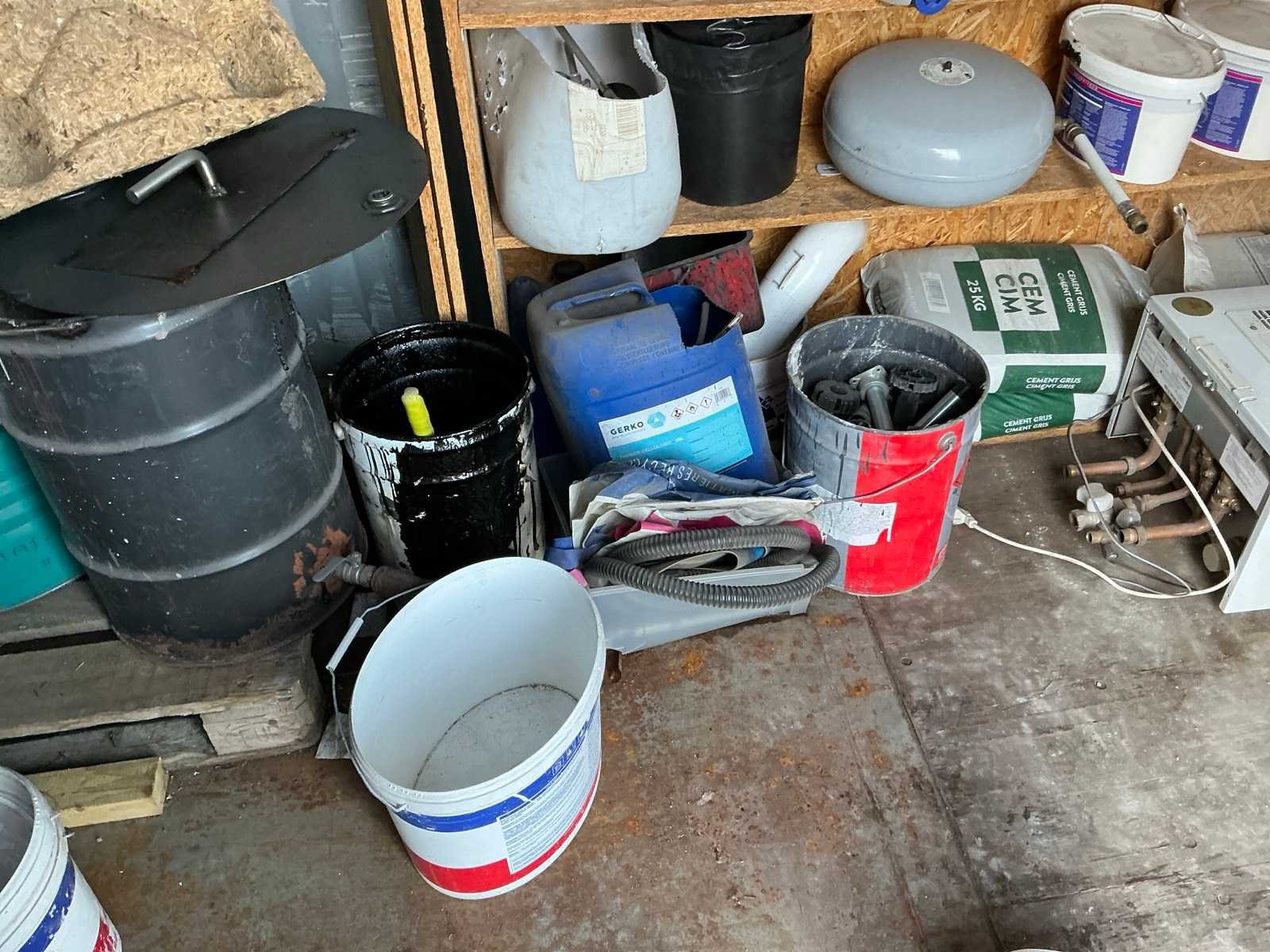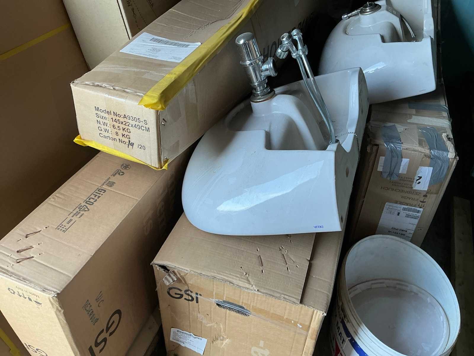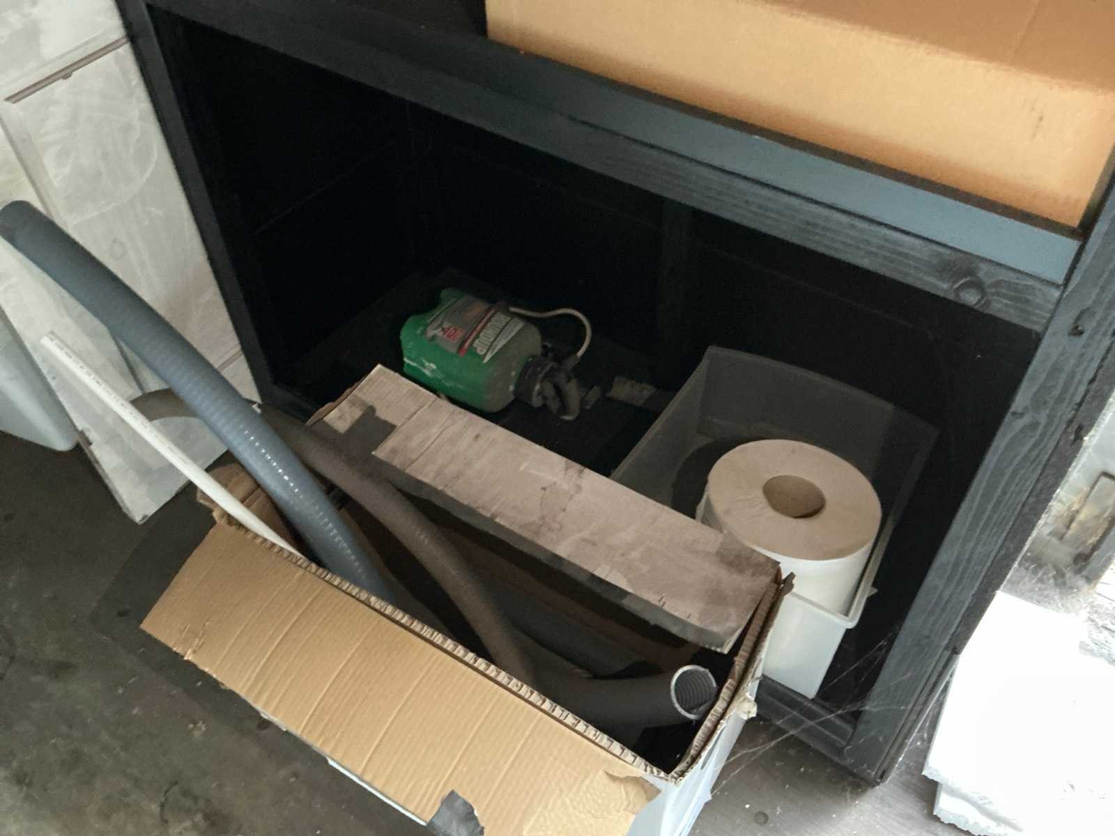 Alles moet worden meegenomen. Bestaande uit: diverse badkamermeubels, toiletten, diverse vloeistoffen, vaten, boiler Vaillant, heteluchtkannon, stofzuiger, kabels, touw, douchebakken, steenwol, enz.