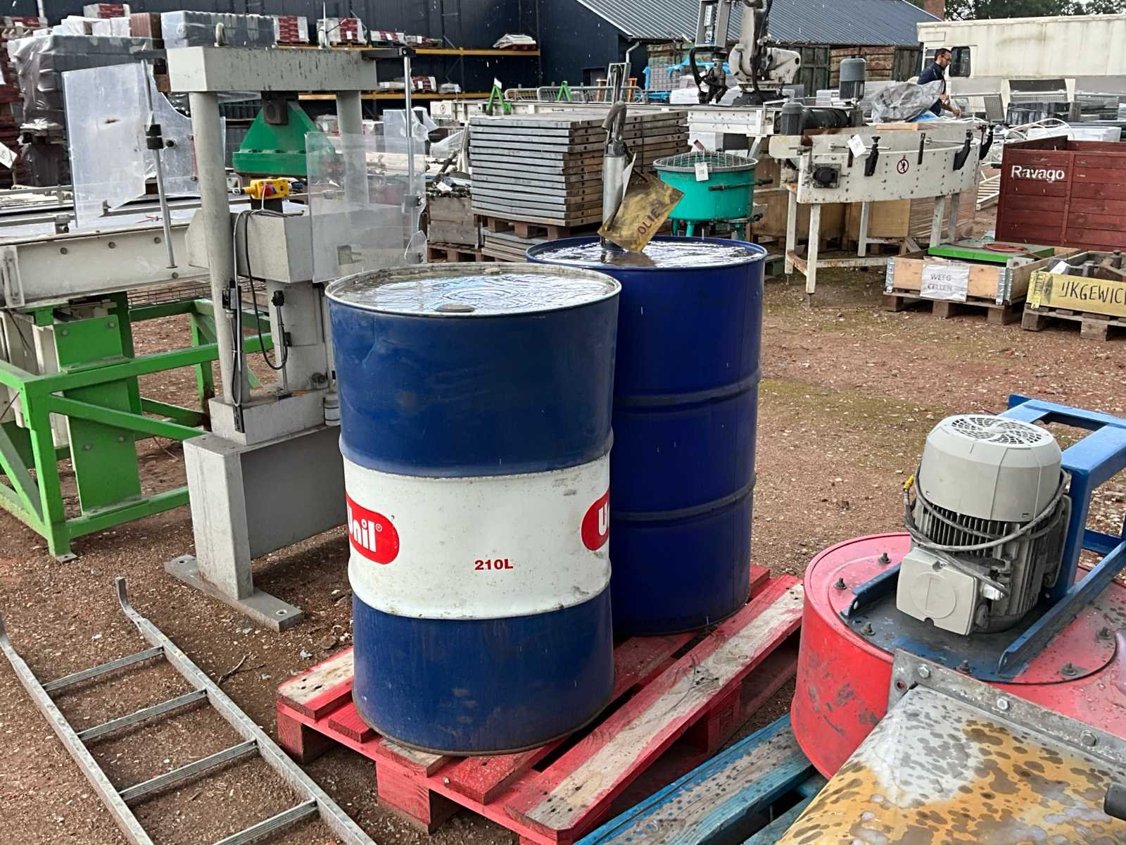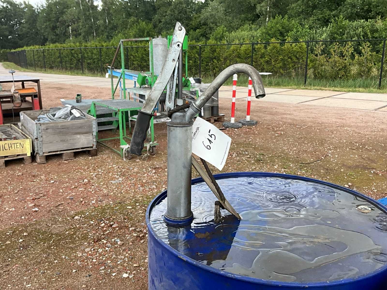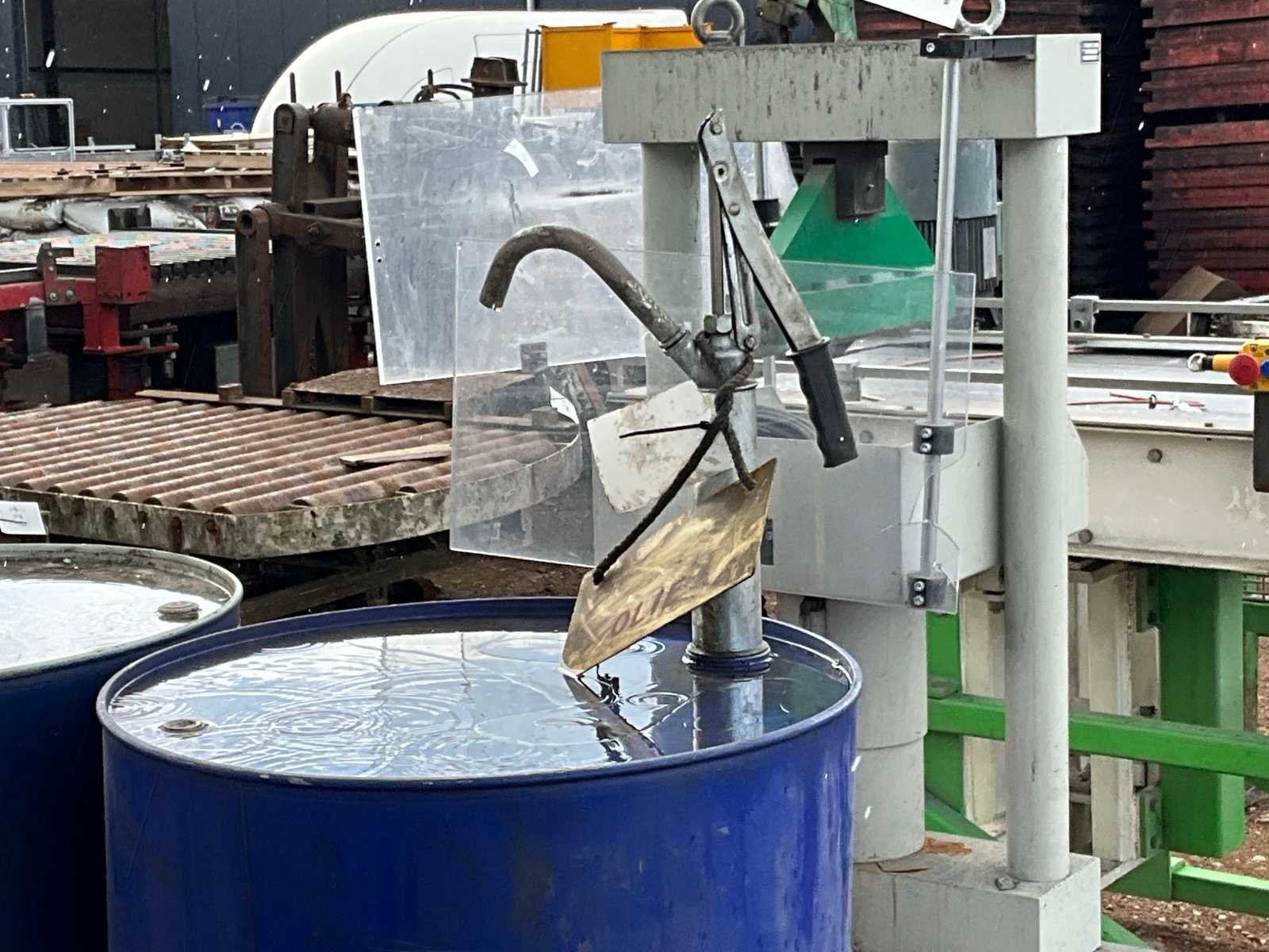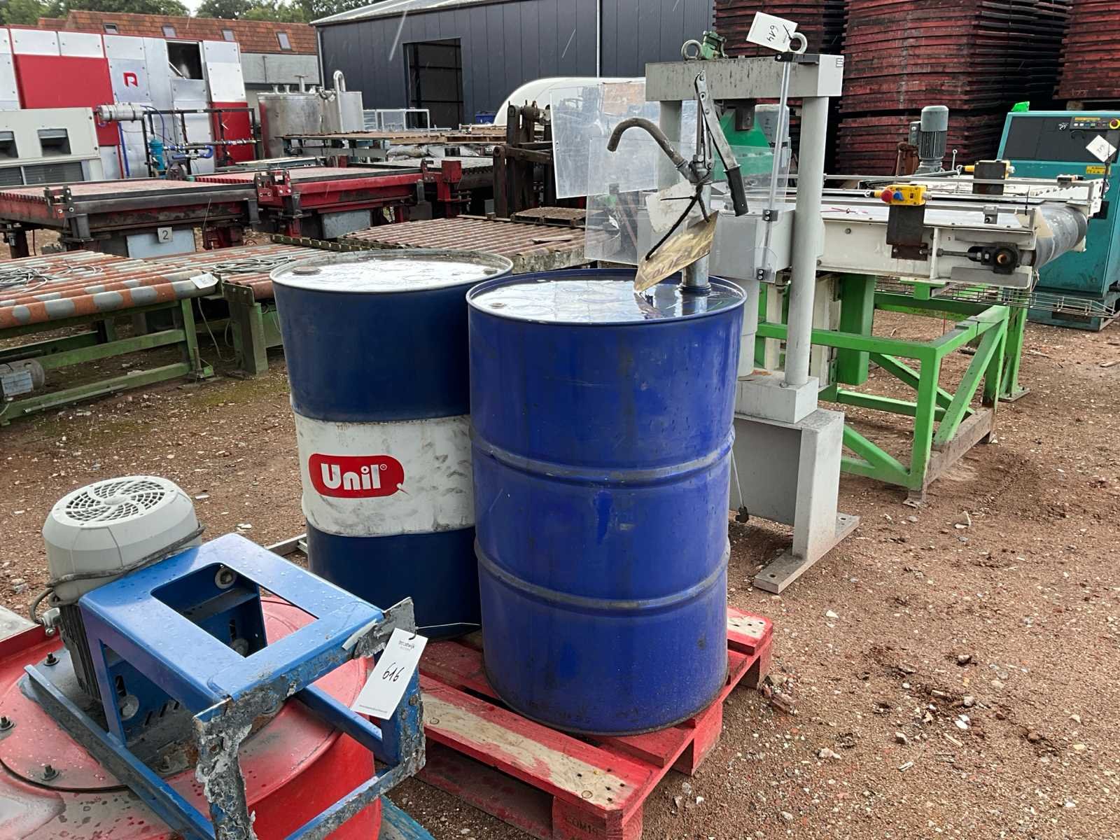 1x inhoud olie onbekend; 1x inhoud olie zoals omschreven; inclusief x handbediende vatenpomp; op pallet;