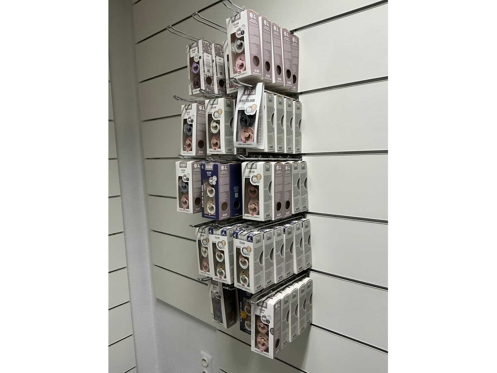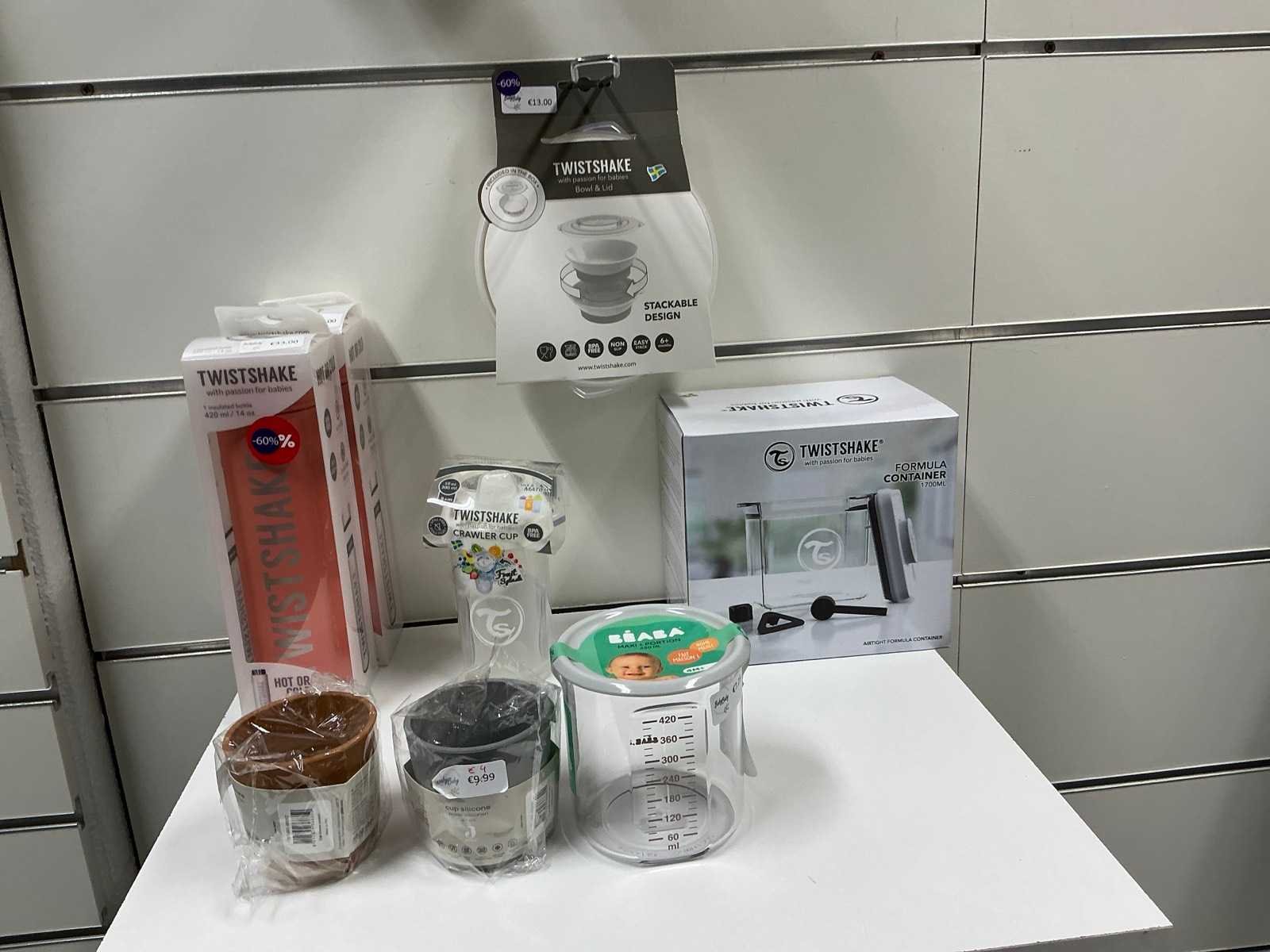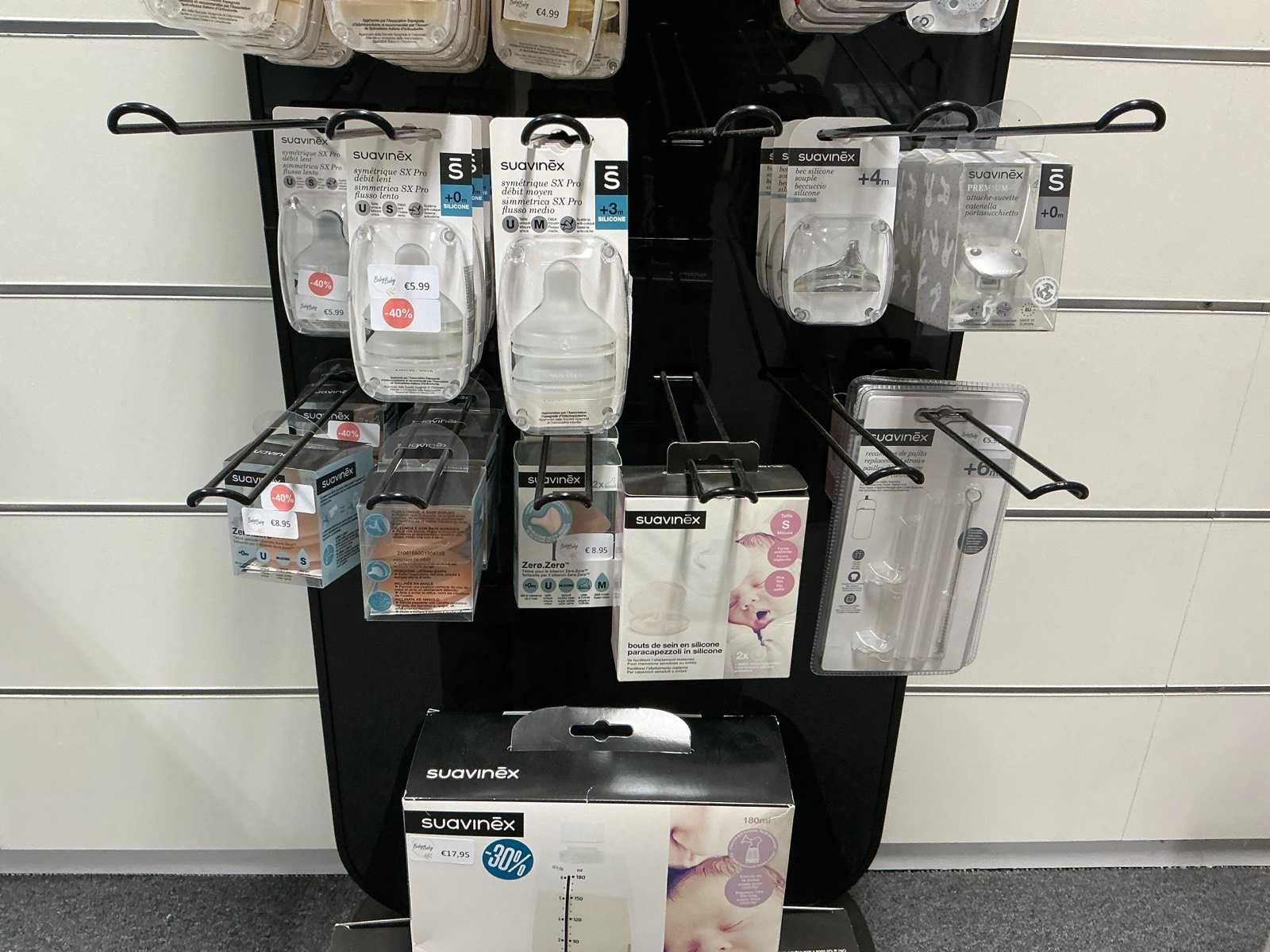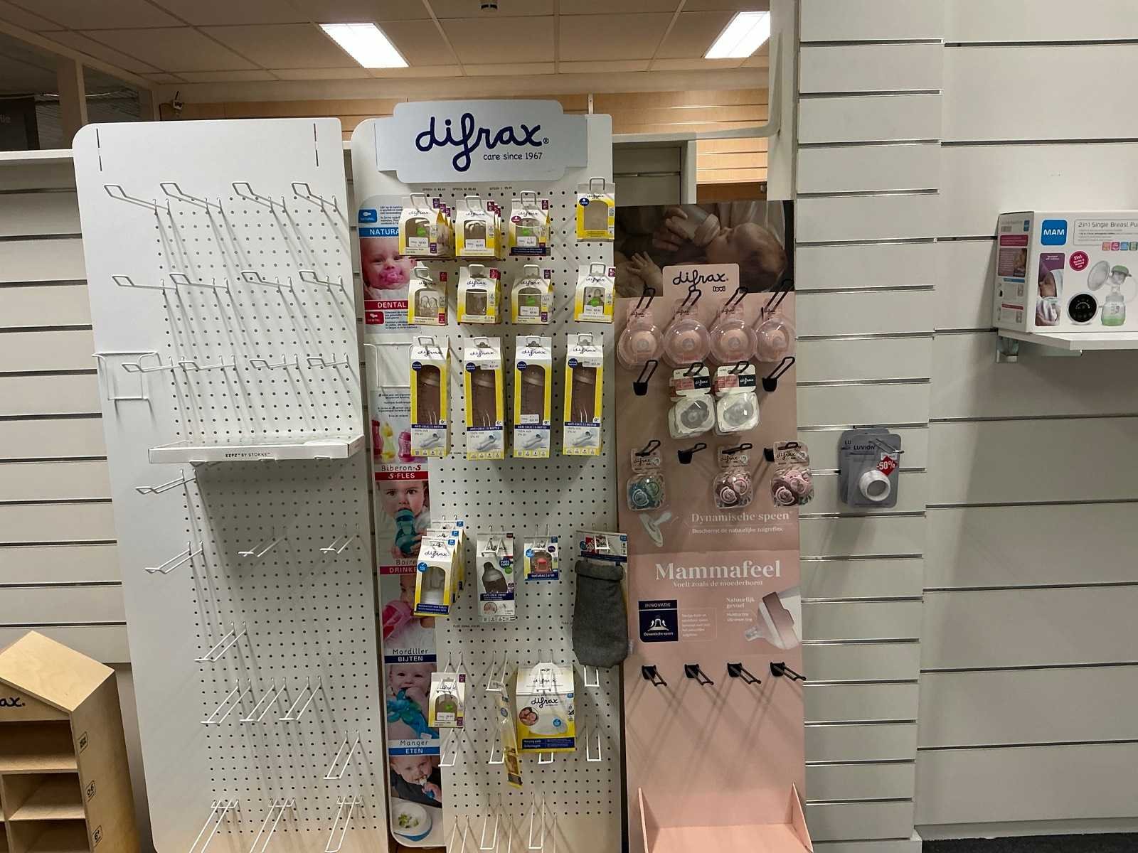 Bestaande uit fopspenen, papflessen, kolfmachine, potjes, zwangerschapsondergoed, borstschilden, afkolfsets, spenen, enzovoort waaronder Difrax, Philips advent, Carriwell, Frigg, Medela,… compleet met 6 diverse displays