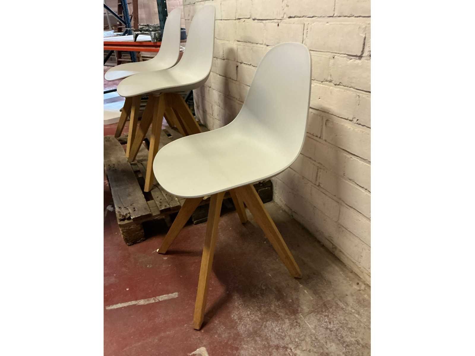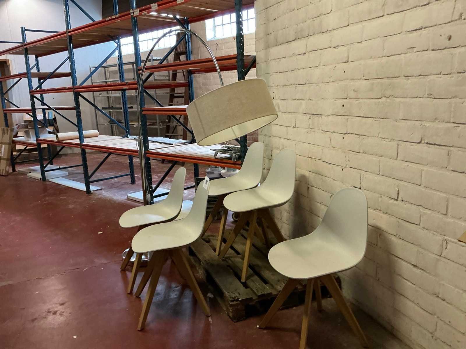 Compleet met 5 stoelen voorzien van kunststoffen zitting en houten onderstel