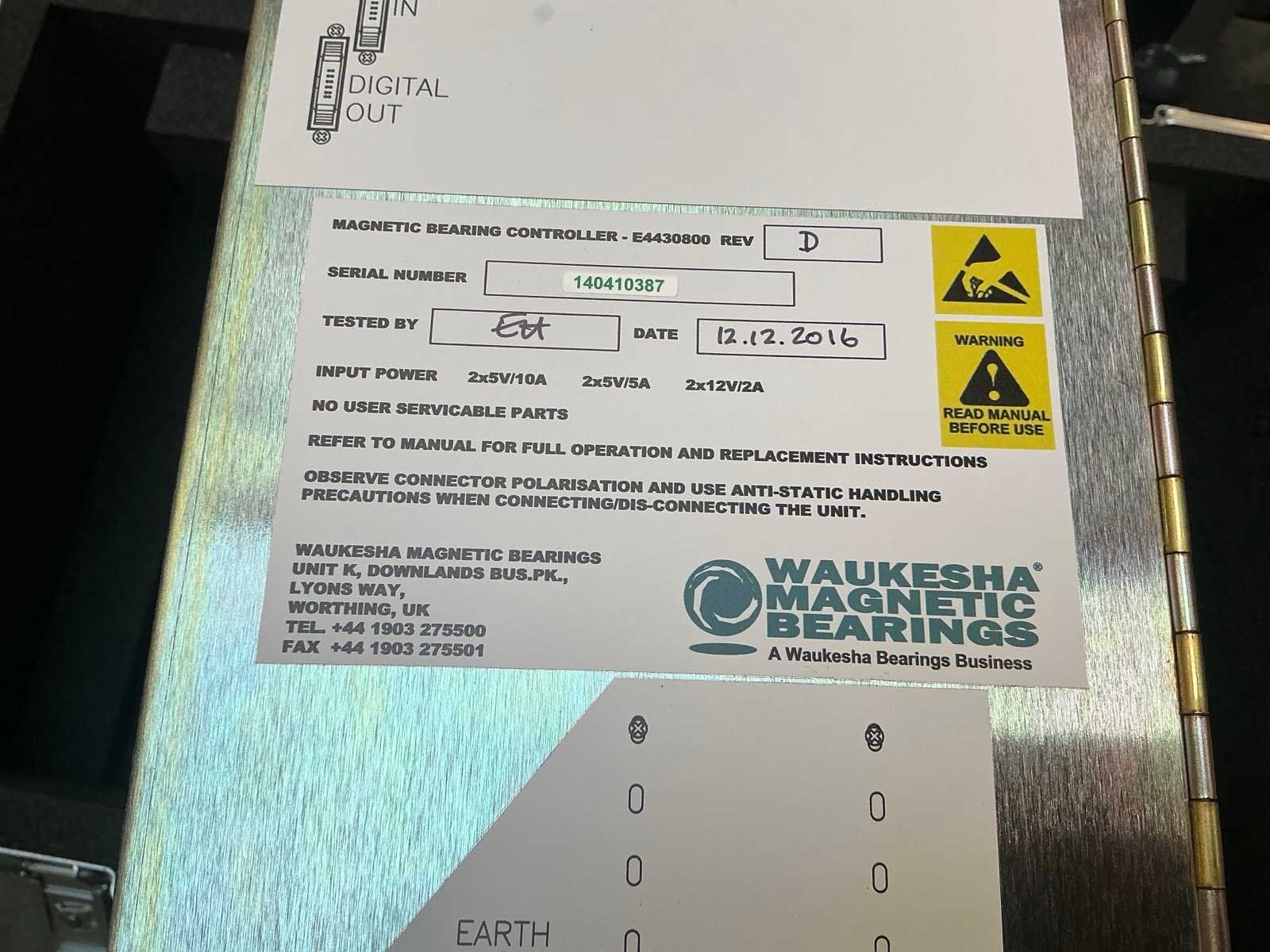 <Br> - Type: Magnetic Bearing Controller. - Model: E4430800 (Rev. D). Merk: Waukesha Magnetic Bearings