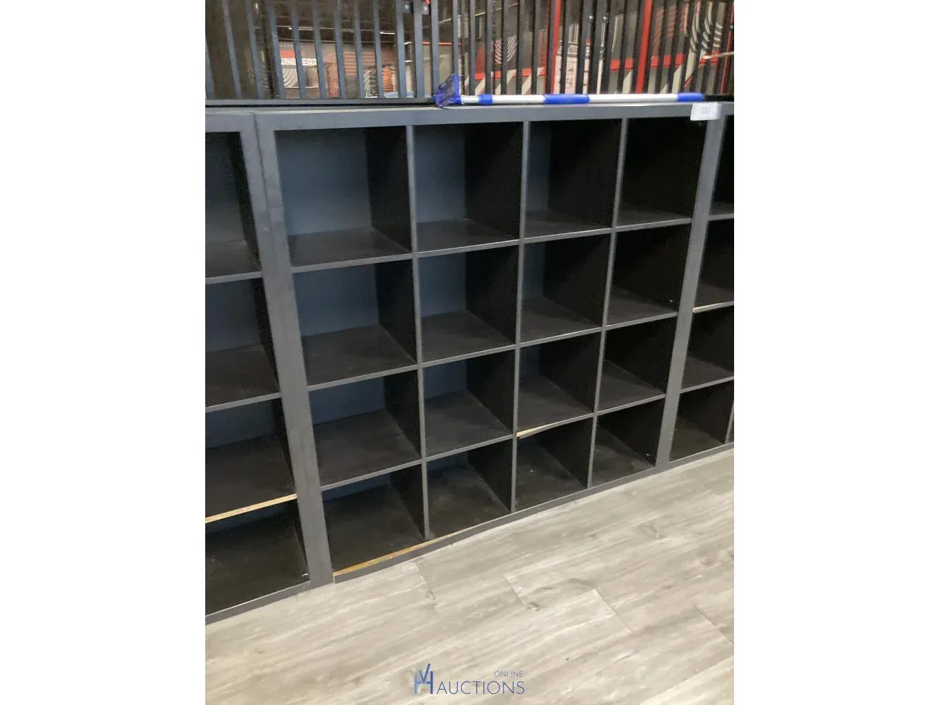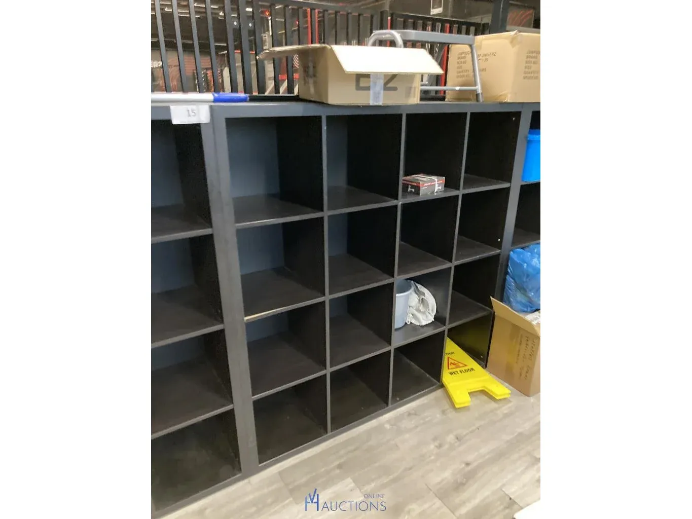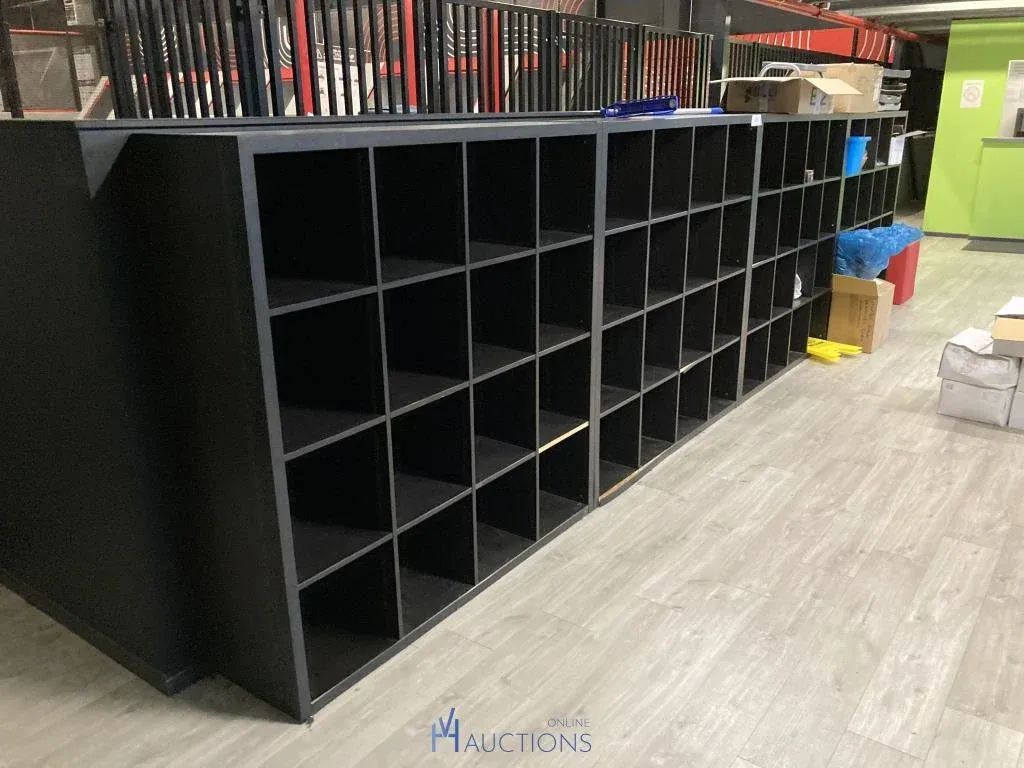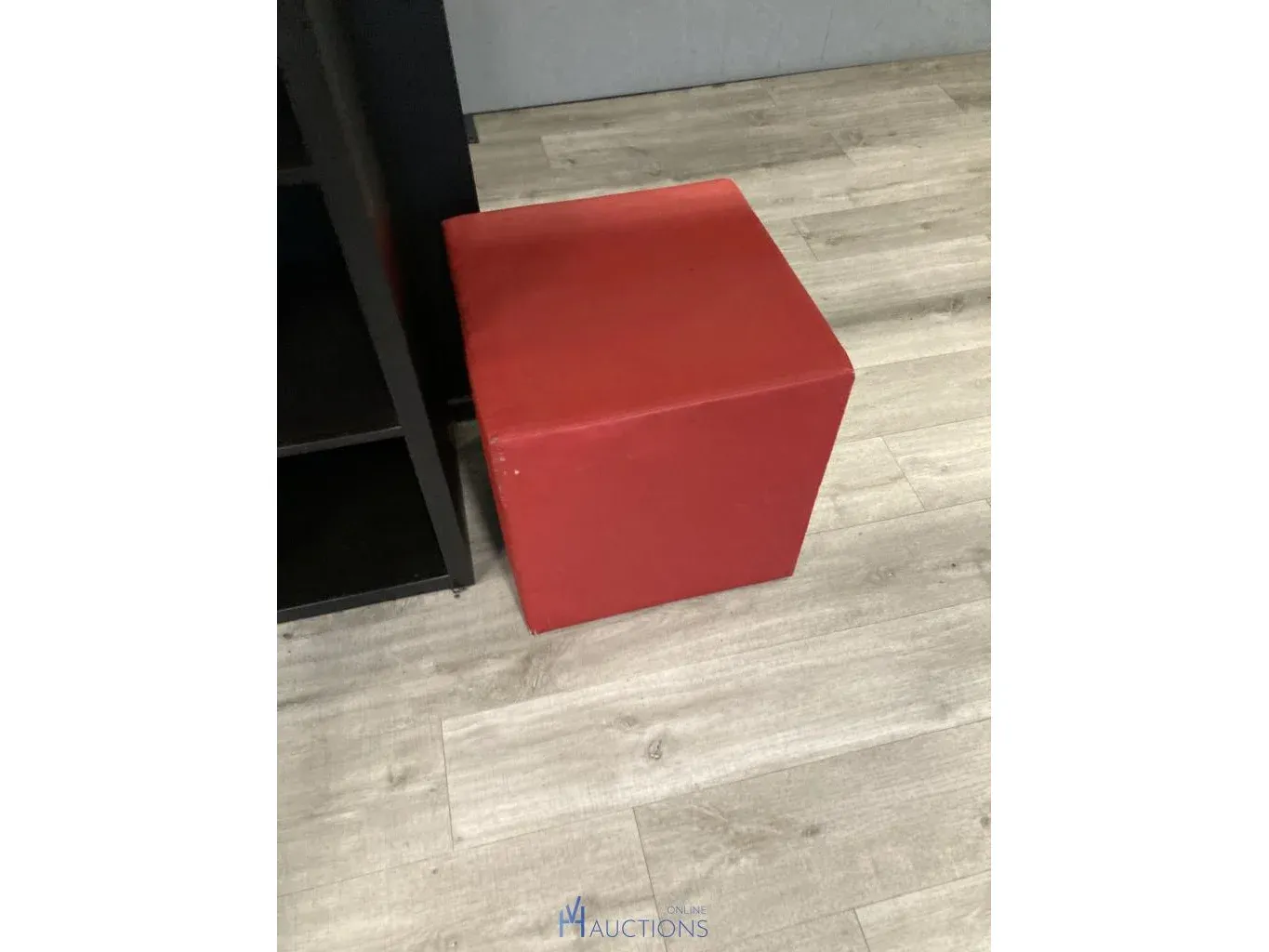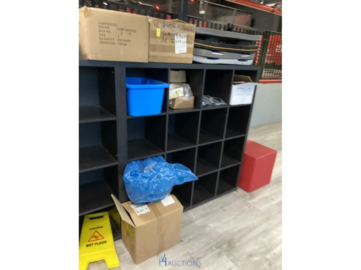 4 formica vakkenkasten van plm. 1,47 x 0,39 x 1,47 lpm.. Elk voorzien van 16 vakken compleet met inhoud inhoudende metalen opstapje, enige lampen, kraan, enige kledij, bevestigingsmaterialen, snelbinders, enz. en met rood skaien poefje