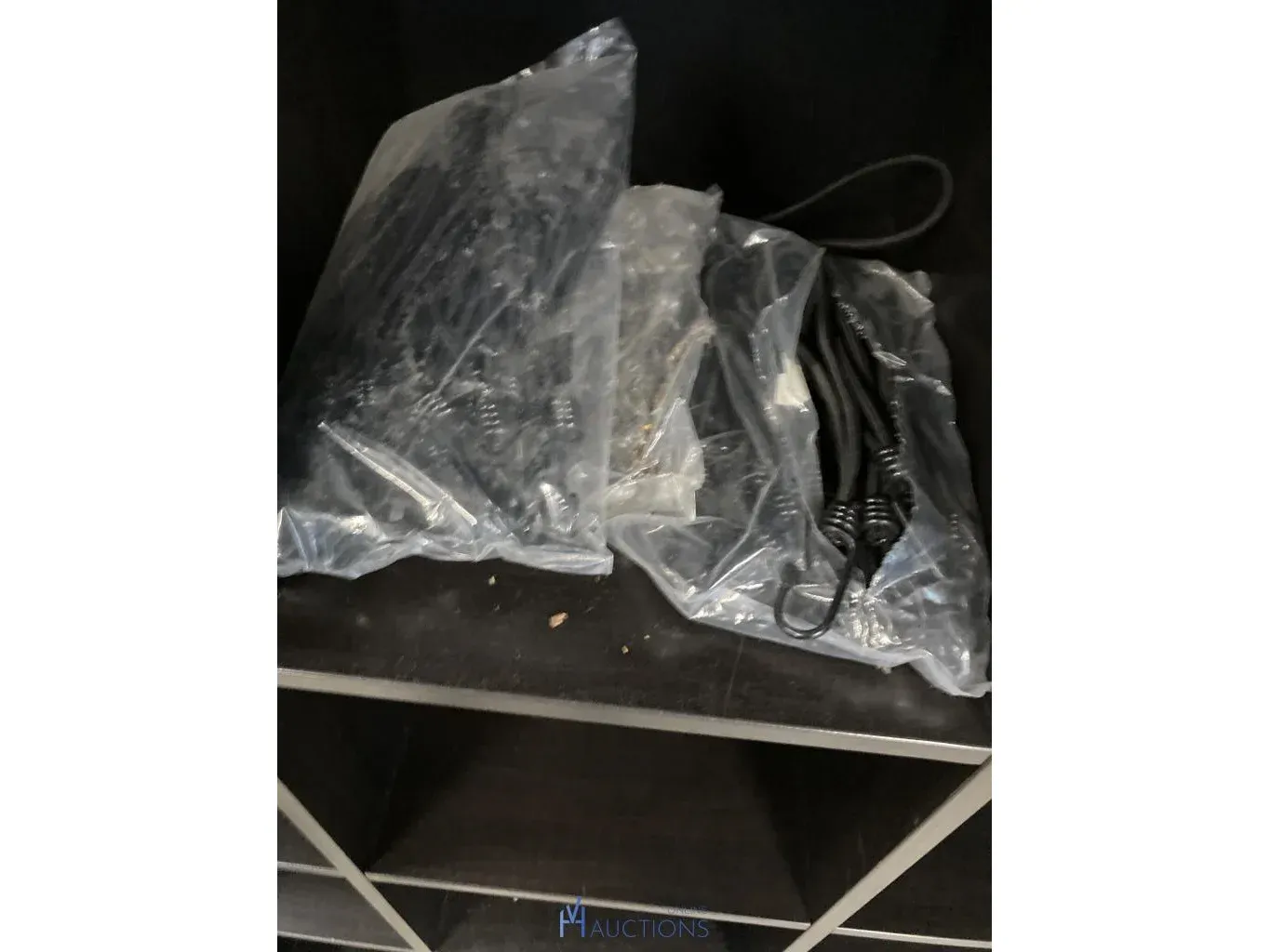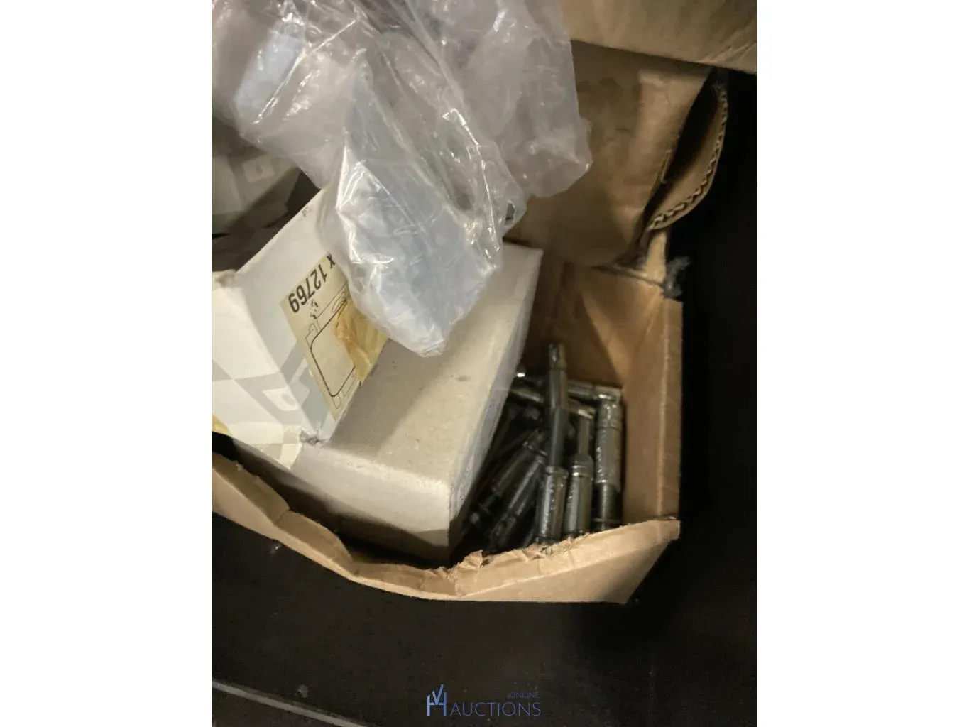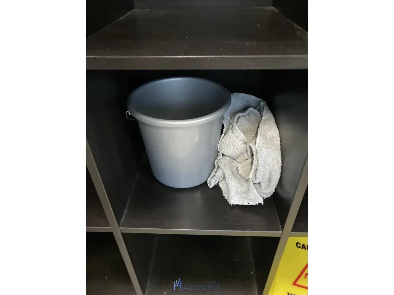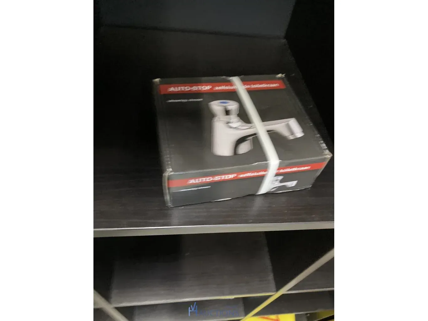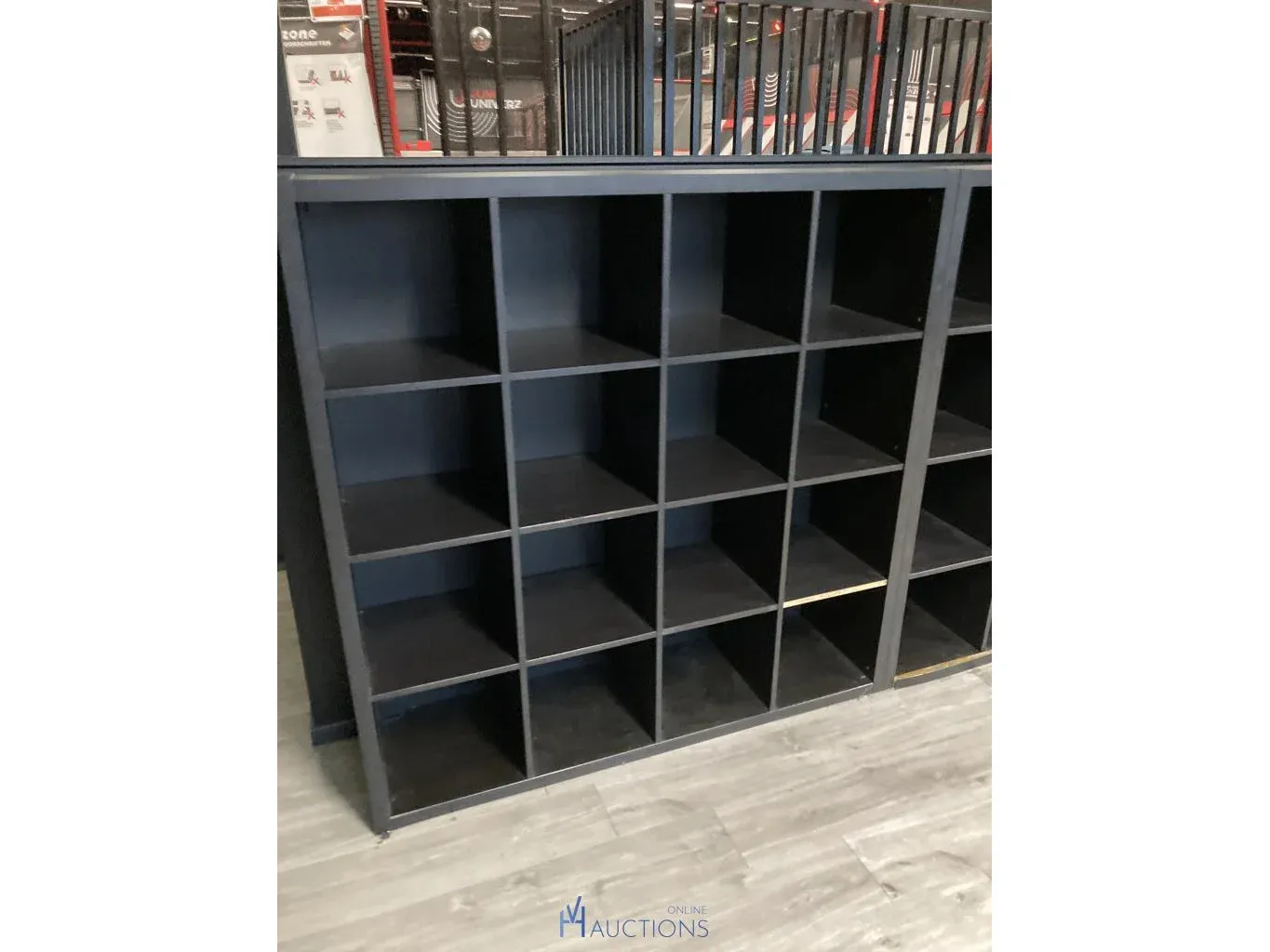 4 formica vakkenkasten van plm. 1,47 x 0,39 x 1,47 lpm.. Elk voorzien van 16 vakken compleet met inhoud inhoudende metalen opstapje, enige lampen, kraan, enige kledij, bevestigingsmaterialen, snelbinders, enz. en met rood skaien poefje