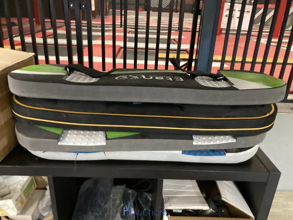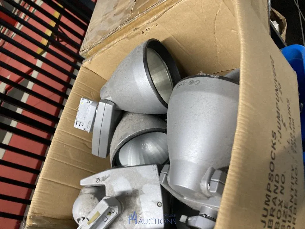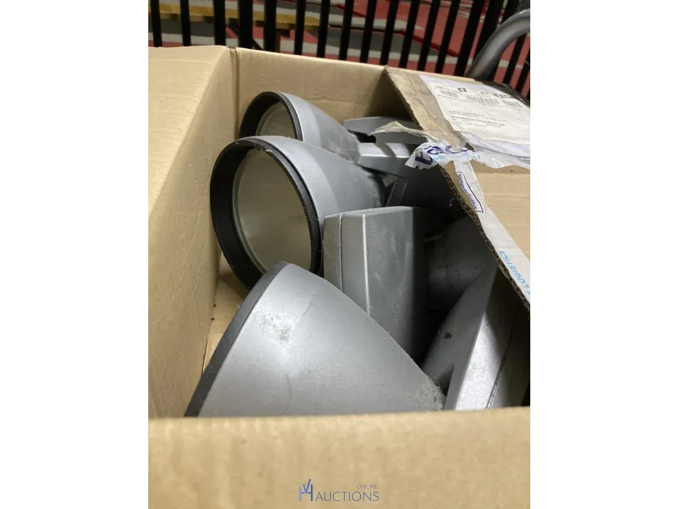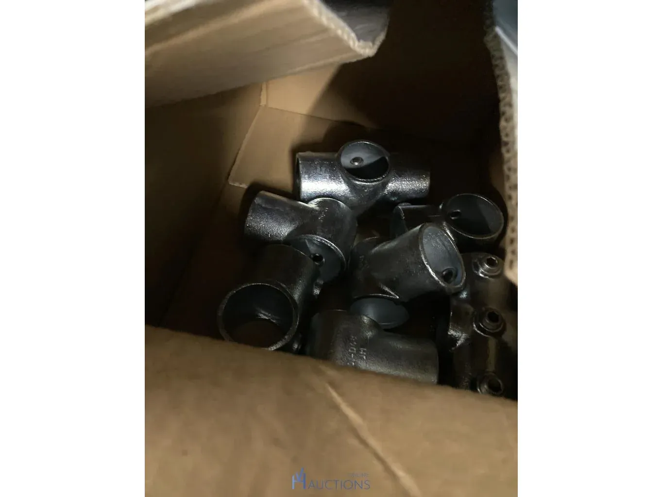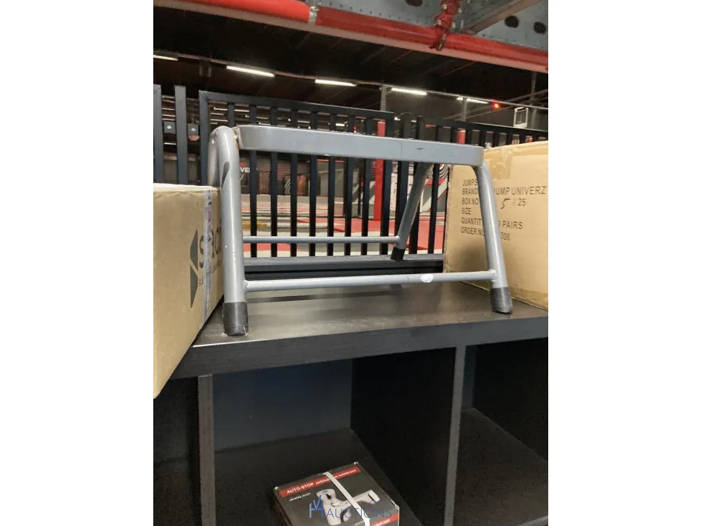4 formica vakkenkasten van plm. 1,47 x 0,39 x 1,47 lpm.. Elk voorzien van 16 vakken compleet met inhoud inhoudende metalen opstapje, enige lampen, kraan, enige kledij, bevestigingsmaterialen, snelbinders, enz. en met rood skaien poefje