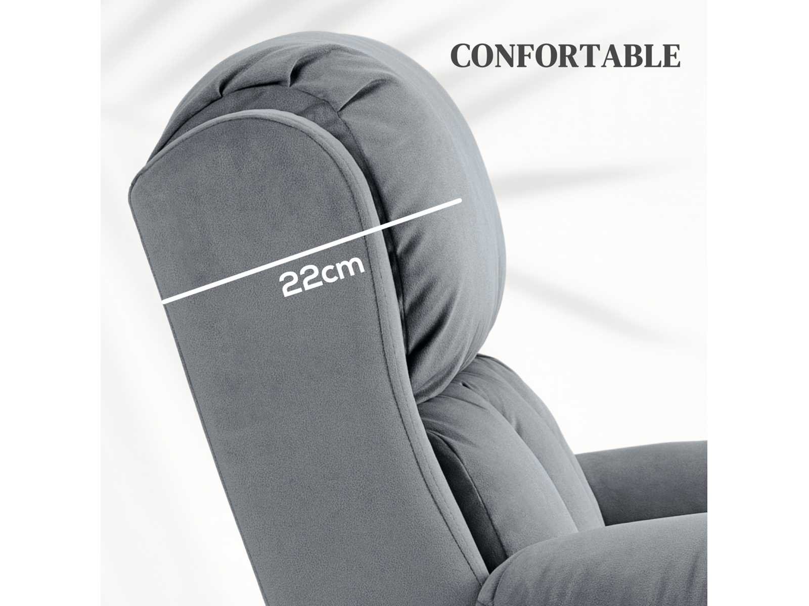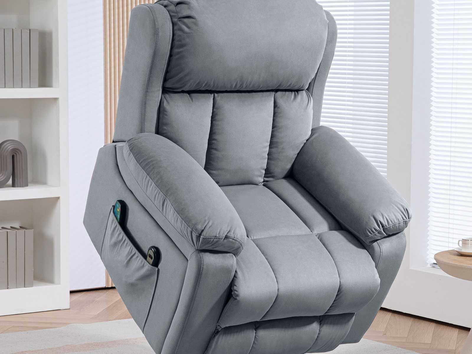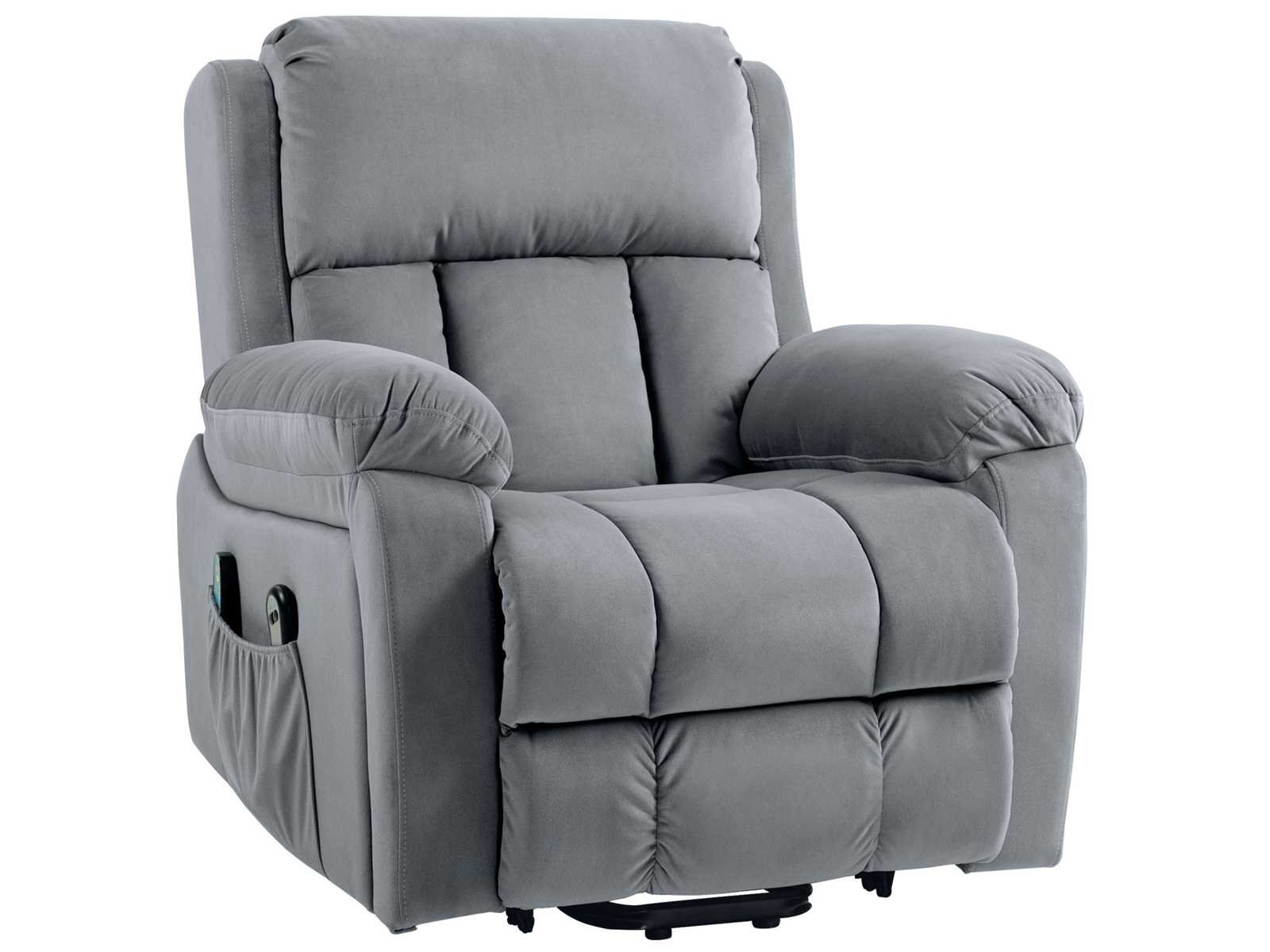 Specificaties: - Kleur: Grijs - Materialen: synthetische stof (100% polyester), staal, schuimrubberen vulling - Sun. (recht) 90B x 95D x 103H cm - Sun. helling: 97B x 150D x 83H cm - Sun. Lift: 97B x 90D x 142H cm - Sun. Zitplaats: 55B x 55D cm - Zithoogte: 48 cm - Armleuninghoogte: 15 cm (ten opzichte van de zitting) - Sun. Rugleuning: 63L x 80W cm (dikte: 22cm) - Aanbevolen maximale belasting: 150 kg - Pasvormen: = 190 cm (voor één gebruiker lengte) - Ingang: 100-240 V, 50 / 60 Hz, 1,5A - Massage-uitgang: 12 V / 1 A / 12 W - Liftvermogen: 29 V / 2 A / 58 W Non
