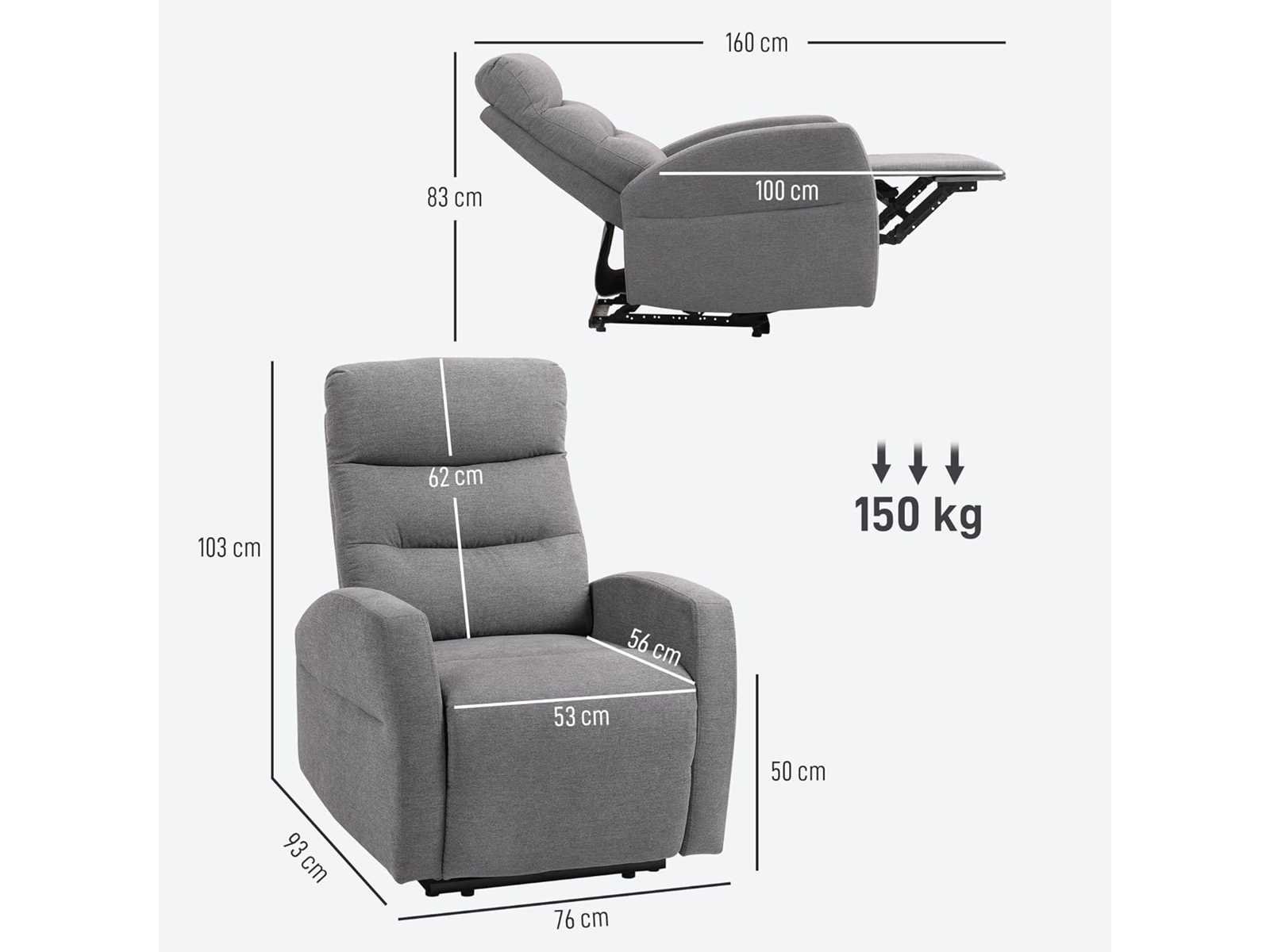 Kleur: Zwart Donkergrijs Materiaal & Materiaal Imitatie linnen (100% polyester), schuim, metaal, massief hout Totale afmetingen: (verticaal) 76 x 93 x 103 cm (B x D x H) Totale afmetingen: (hellend) 76 x 160 x 83 cm (W x D x H) Zitafmetingen: 53 x 56 cm (B x D) Zithoogte: ca. 50 cm Rugmaat: 57 x 62 cm (B x L) Dempingsdikte: 12 cm (zit), 25 cm (rugleuning) Maximale belasting: ca. 150 kg Geschikt voor mensen = 185 cm lang Non