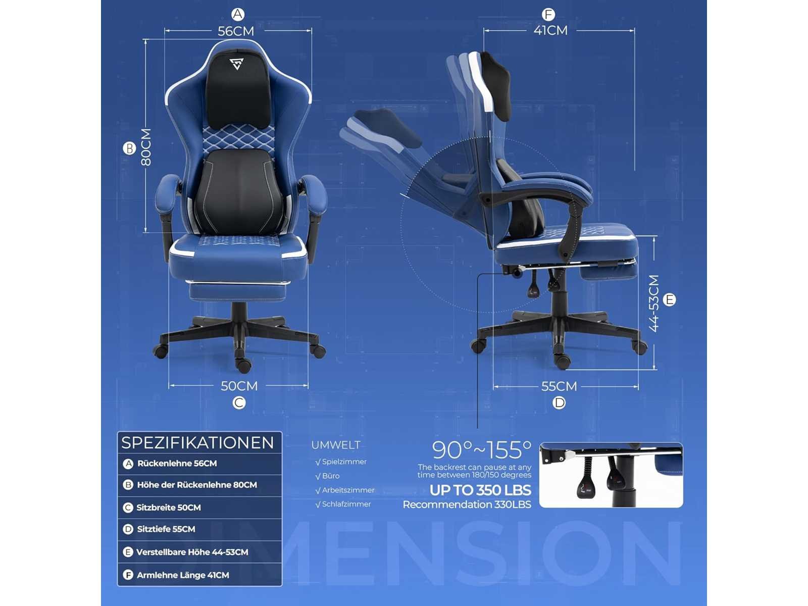 Kleur Blauw Productafmetingen: 55P x 50B x 124H centimeter Maat PU-leer Rugstijl Massieve Rug Speciale functie: armleuning, hoofdsteun, beschikbare kussen, ergonomisch Non