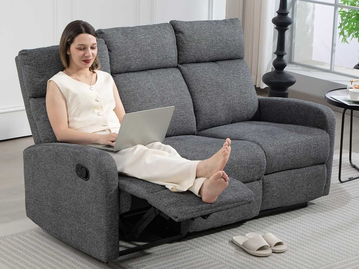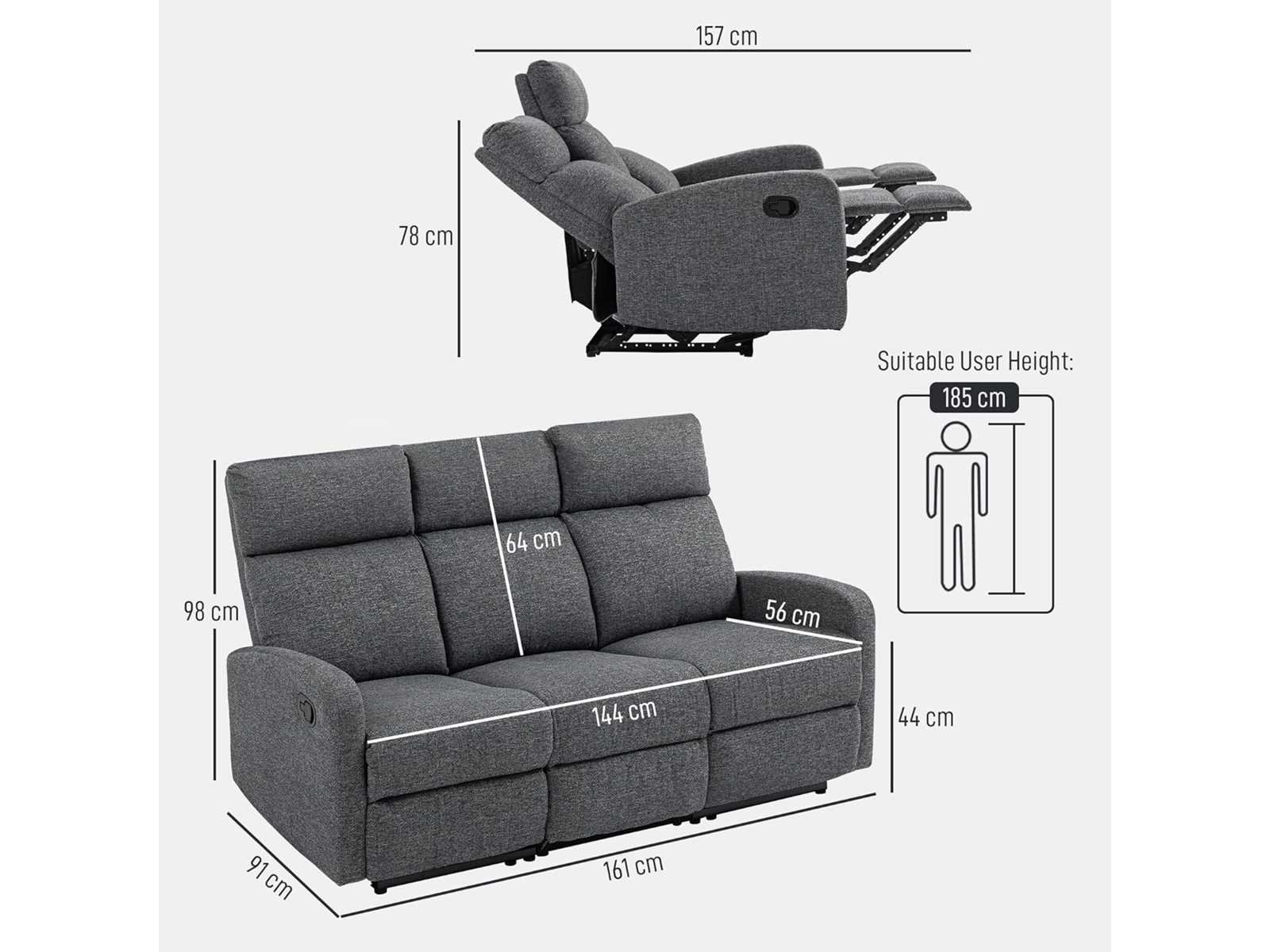 UITZONDERLIJK COMFORT Comfortabel in deze relaxstoel met royaal gewatteerde zitting (12 cm dik) en rugkussens (17 cm dik), waar schuim met hoge dichtheid, pocketveren, S-veren en elastiekbanden ondersteuning en comfort bieden. Geniet van individueel comfort dankzij het gesplitste rugsteunontwerp en de onafhankelijke rugleuning tot 145°. Stel de rugleuning van de relaxstoel handmatig bij het kijken van tv, terwijl je gezin rechtop kan zitten en tijdschriften kan lezen. ELEGANTE EN GETEXTUREERDE ZACHTHEID: Bekleed met een zachte, ademende chenillestof biedt de bioscoopstoel een subtiele maar assertieve elegantie dankzij de rijke textuur die ontspanning uitnodigt. Eenvoudig te installeren: Met hulp van iemand anders kan je nieuwe tv-stoel in slechts 12 minuten worden opgezet. Afmetingen van de ligstoel: Afmetingen in zitpositie: 161 cm (B) x 91 cm (D) x 98 cm (H); Afmetingen liggend: 161 cm (W) x 157 cm (D) x 78 cm (H); Afstand tot de muur (liggende positie): 45 cm; Maximale belasting: 120 kg (per zitplaats). Druk met de hiel op de voetsteun totdat hij vergrendelt. Non