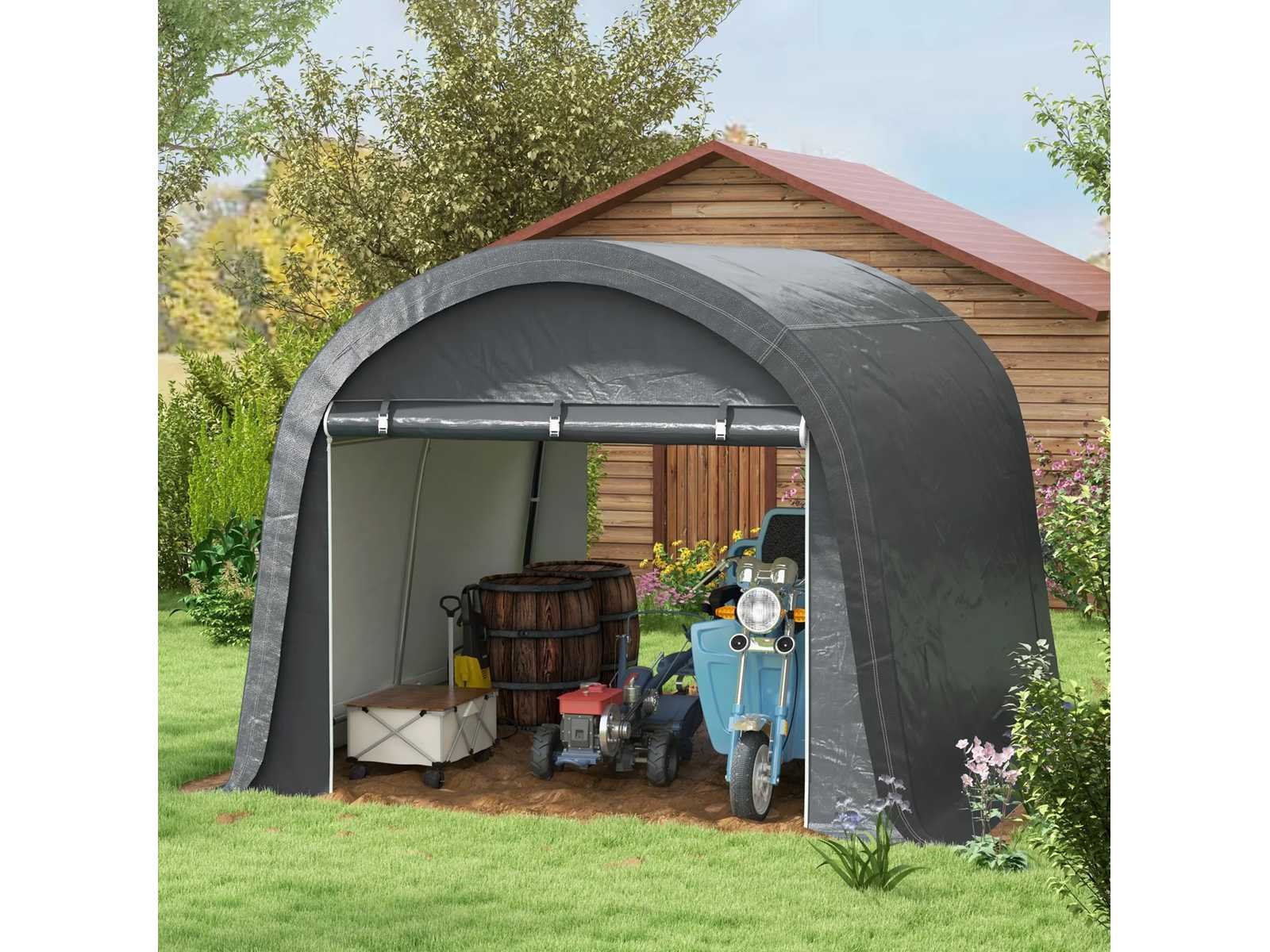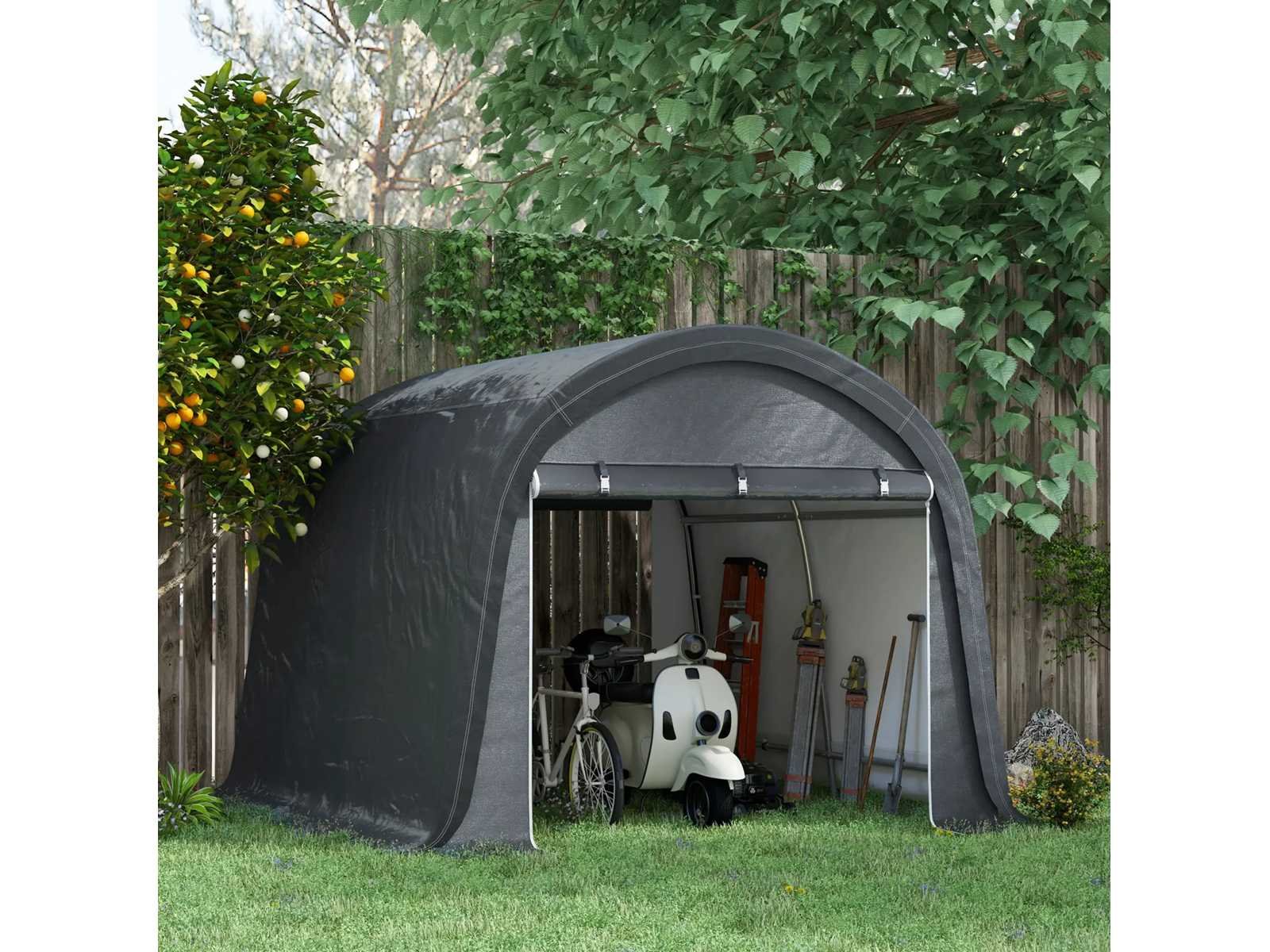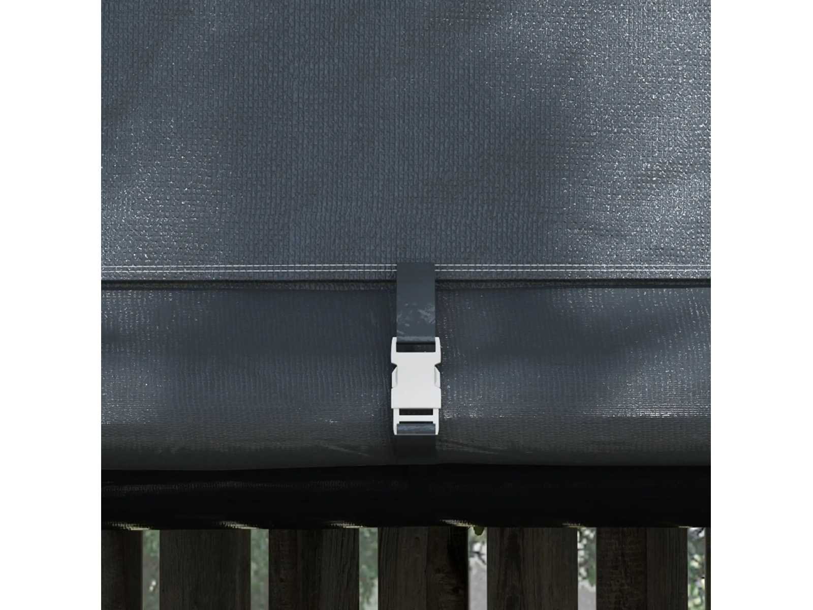 Specificaties: - Kleur: Grijs - Materialen: Gegalvaniseerd staal, PE - Totale afmetingen: 300L x 300B x 235H cm - Deurafmetingen: 188B x 168H cm - Goothoogte: 183 cm - Rekrand: 10L cm - 1 x Foliengerätehaus - 12 x spiraalstijlen - 2 x Dekselspanningssysteem - 1 x Handgeschakeld Non