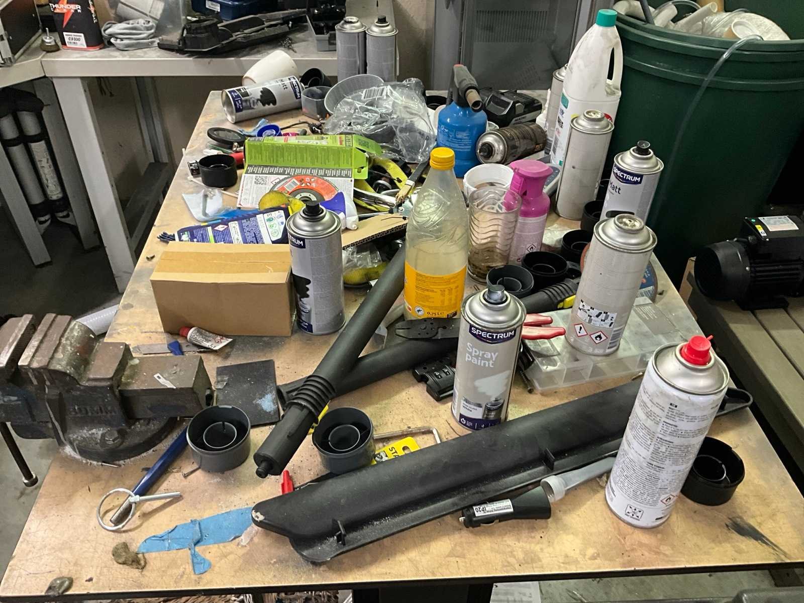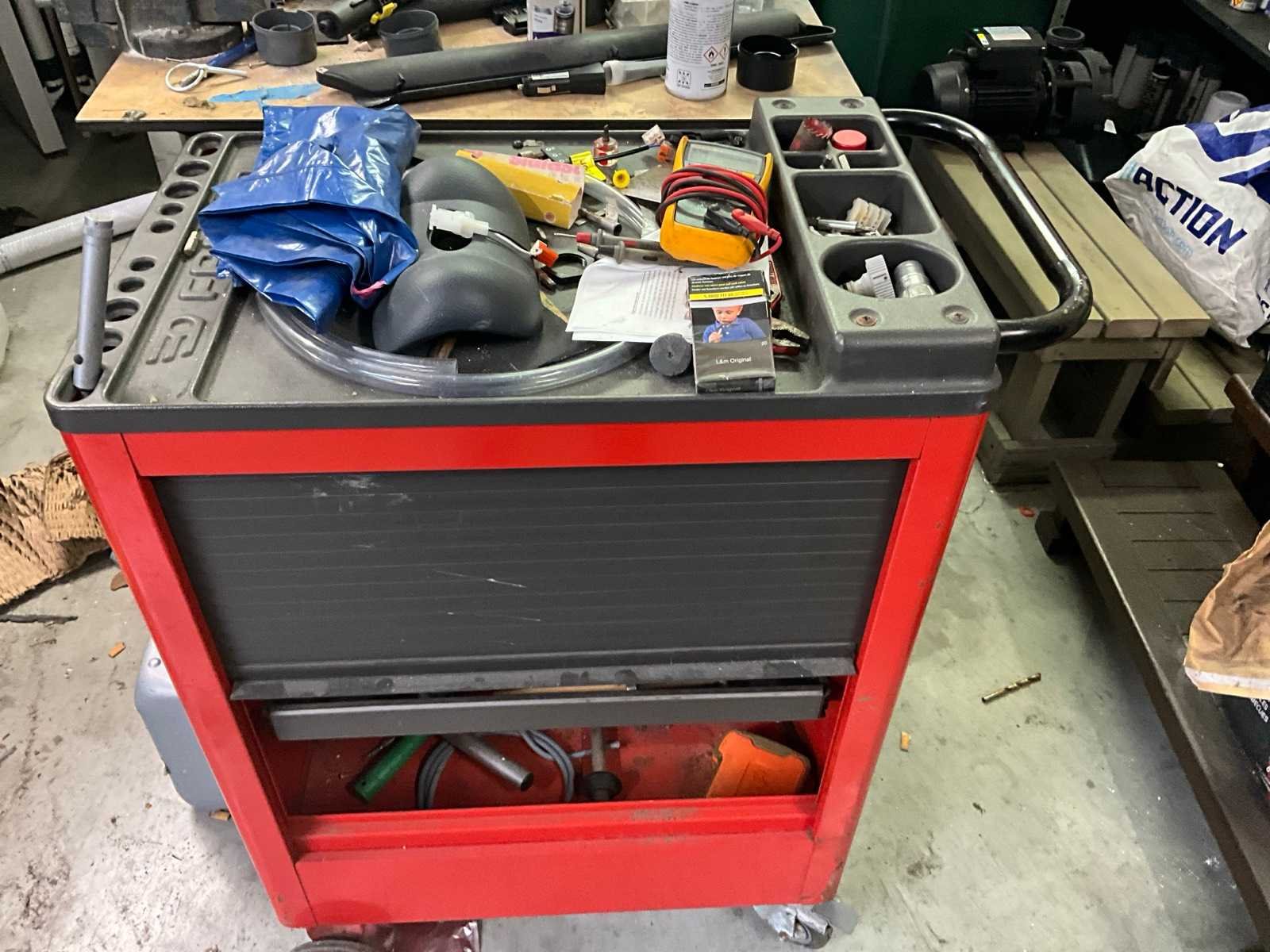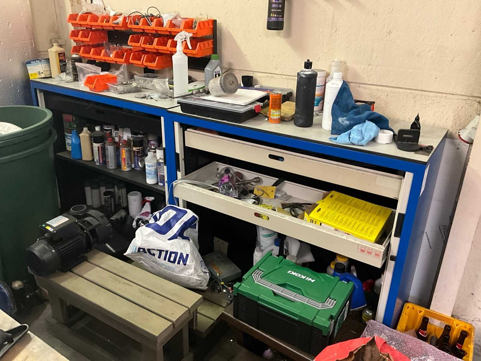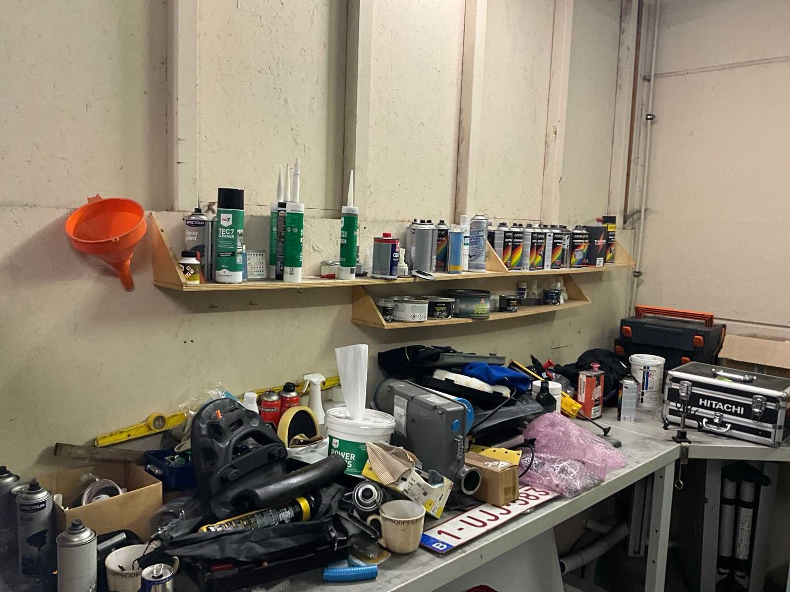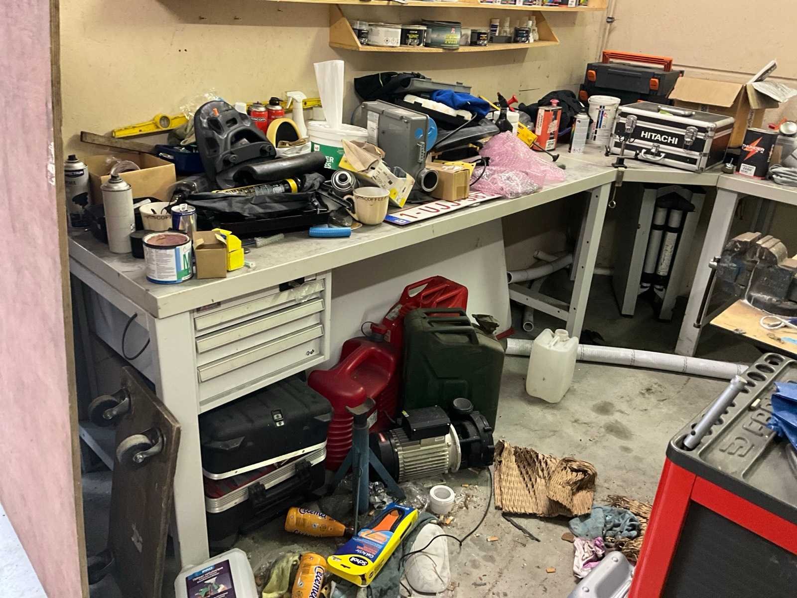 Bestaand uit L- vormige werkbank 300x200 cm, 2x magazijnkast hoogte 100 cm, +1x mobiele werktafel, +1x materiaalwagen Facom, ALLES MET INHOUD!, UITGEZONDERD KOELKAST!! Nee