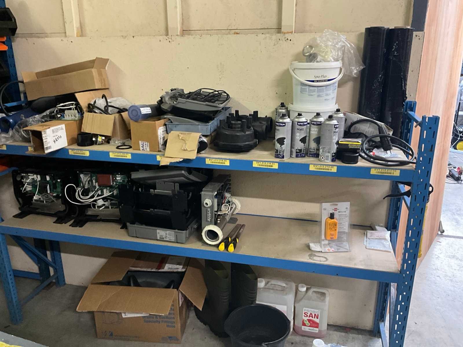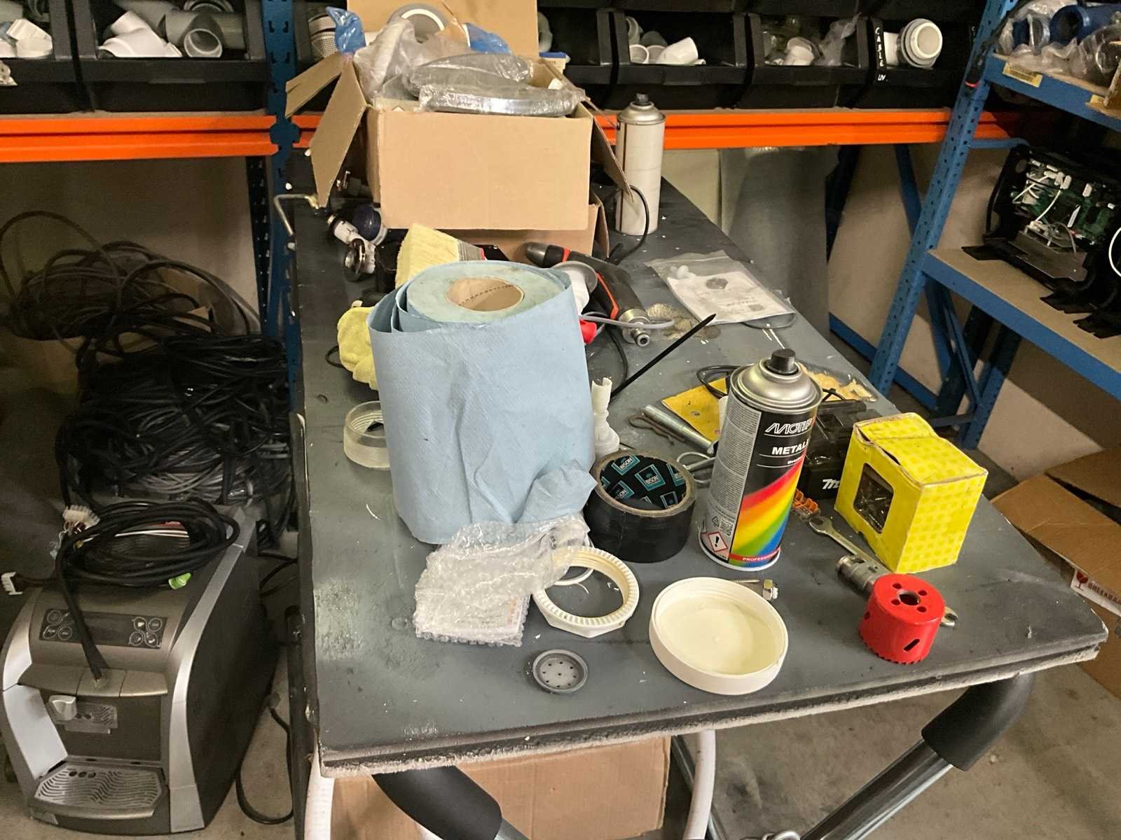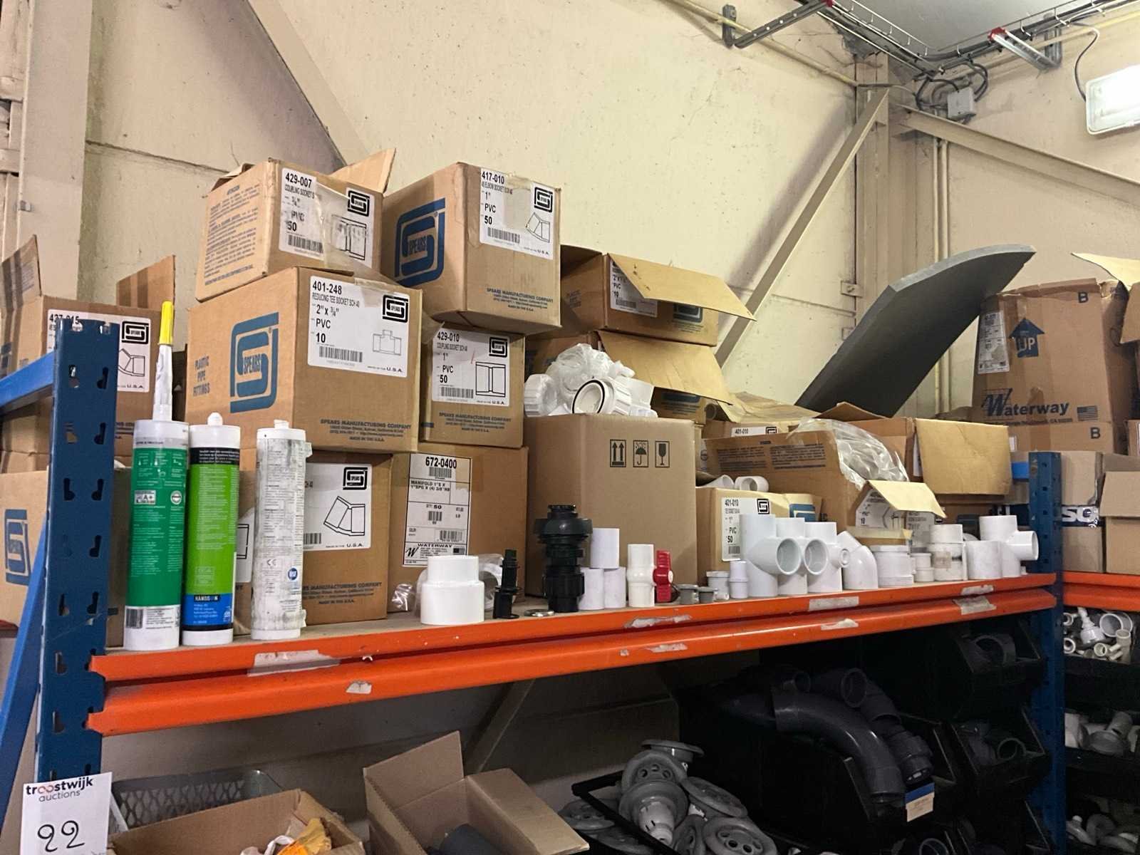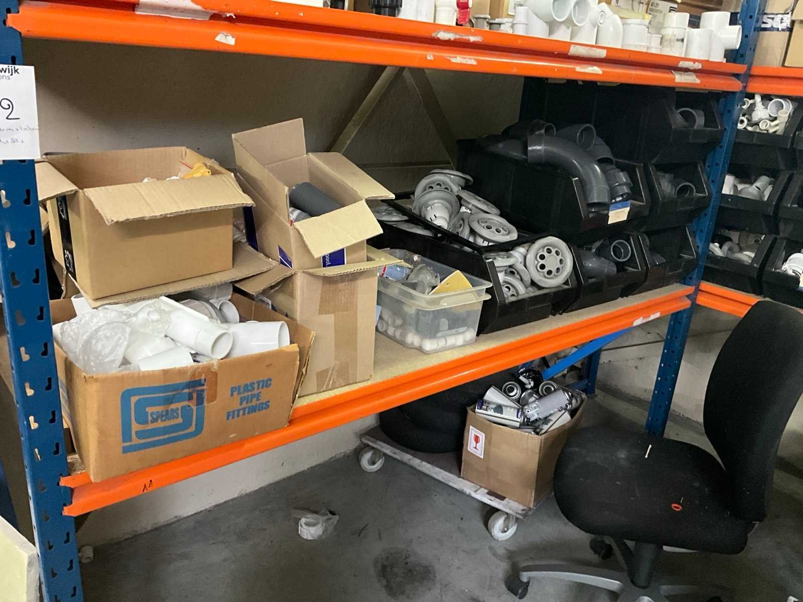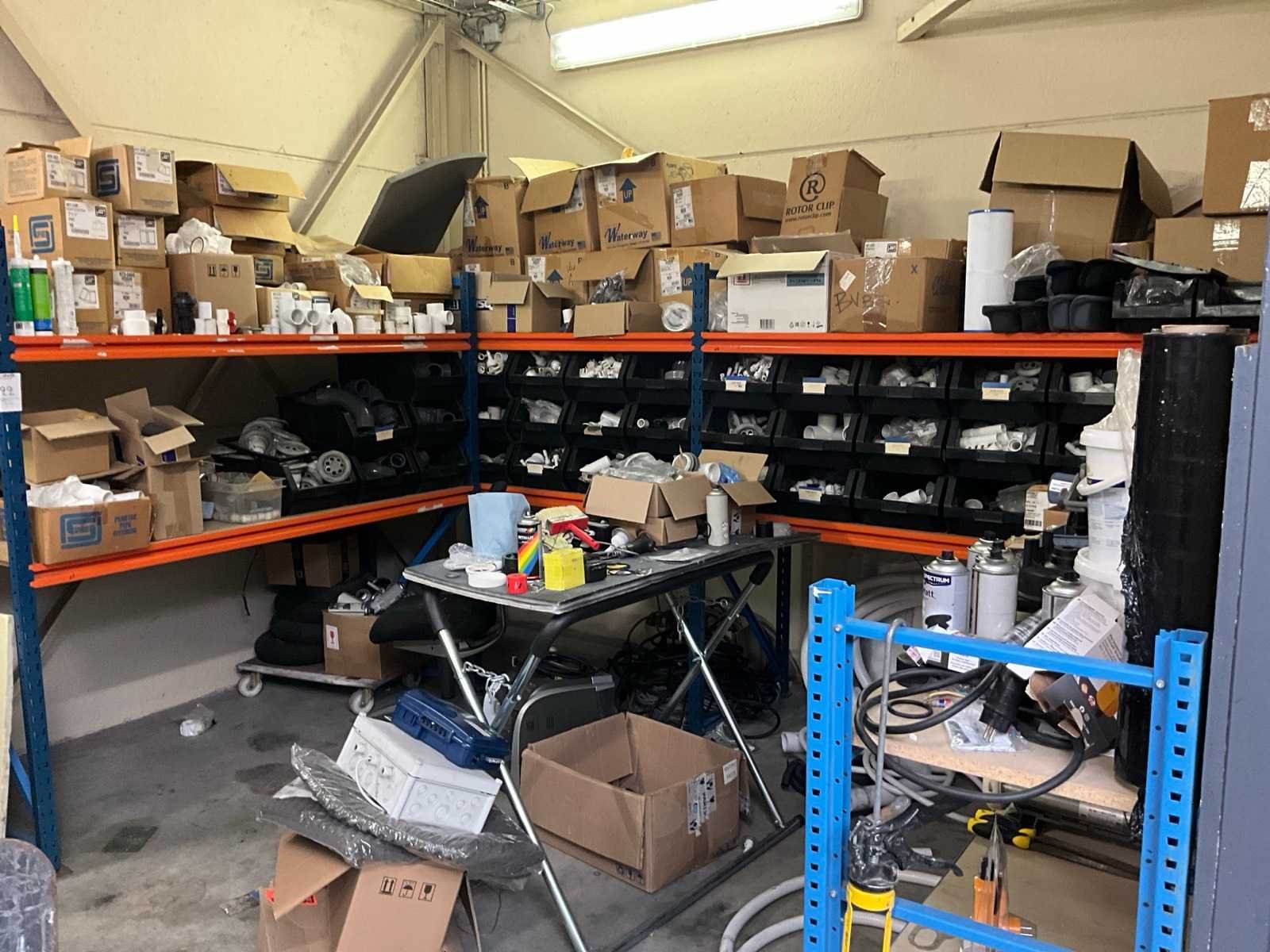 Bestaand uit 5x staanders 78x190 cm, +12 x ligger 180 cm, +2x staander 44x130 cm, met inhoud bestaande uit pvc koppelstukken, jets, sturingen, verfbussen, bekabeling, vouwschraag enz.. Nee
