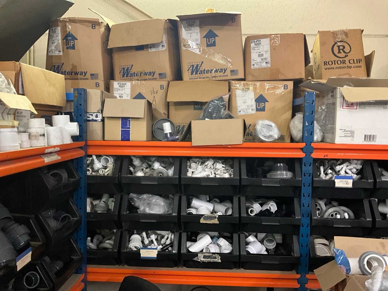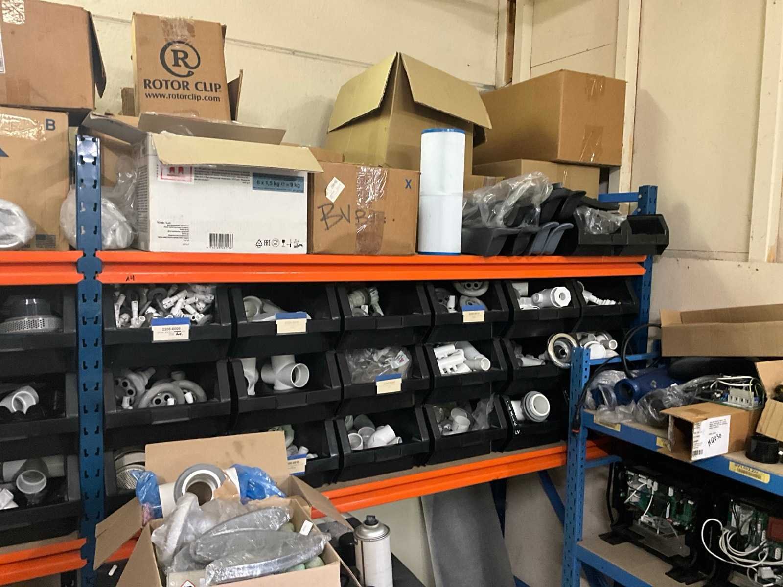 Magazijnrek rechts met inhoud grote partij wisselstukken