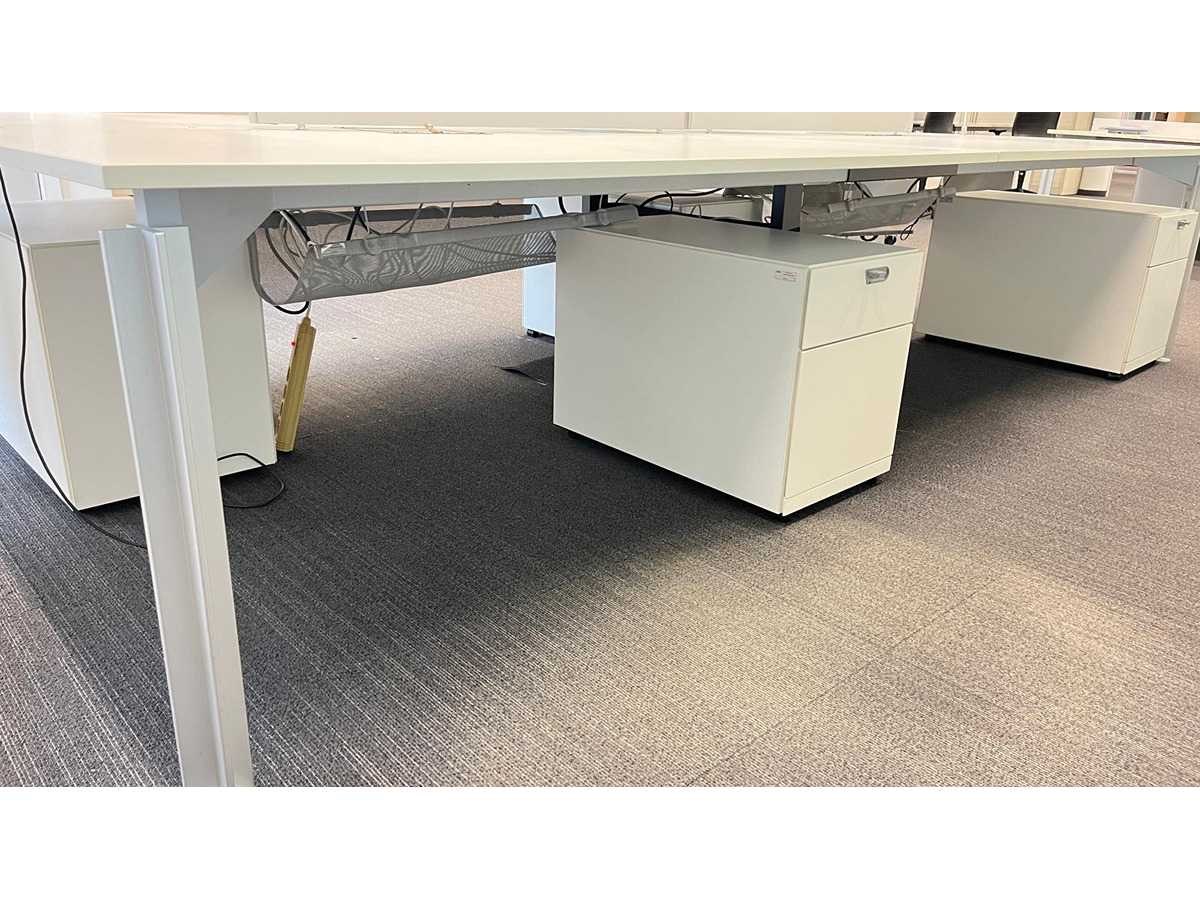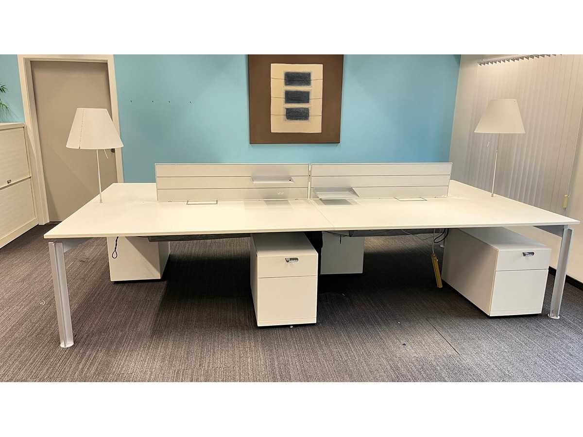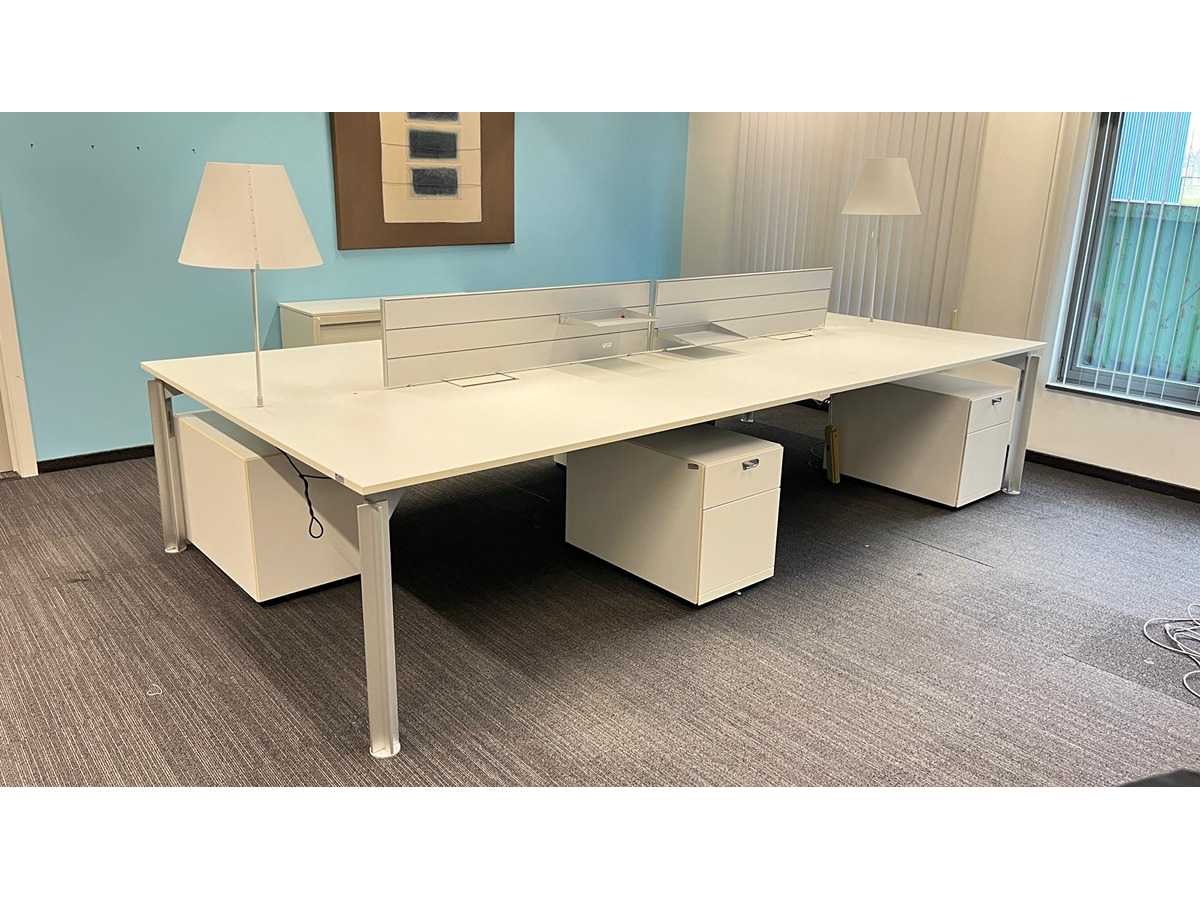 Complete set bestaande uit : 1 X Bulo H2o 4-persoons wit melamine workbench met 2 kabeldoorvoeren + 4x Bulo ladeblokken met hangmapsysteem en pennelades + 2x Luceplan Costanza lampen, 2x aluminium tussenpanelen Met gebruikssporen, staat kan variëren per item. Nee Merk: BULO Type: H20 -4 persoons Model: h2o Kleur: Wit Gewicht: 150kg Lengte: 360cm Breedte: 180cm
