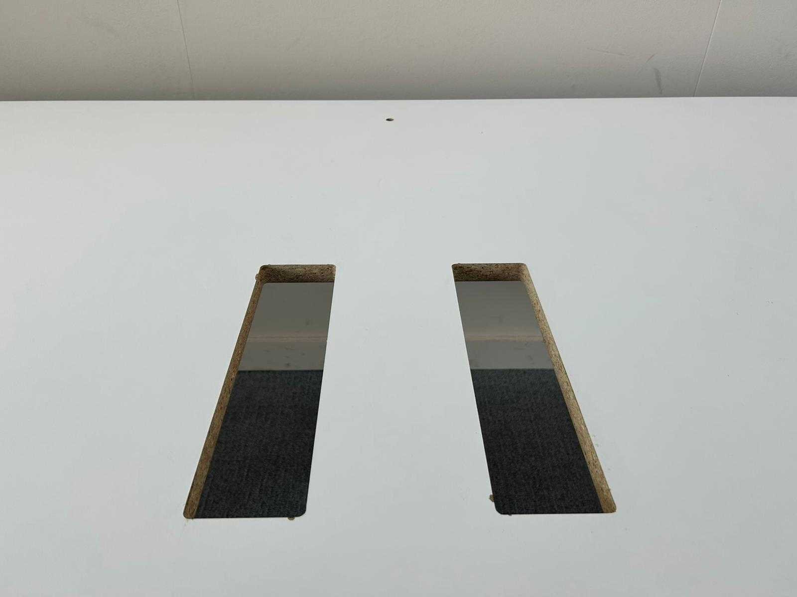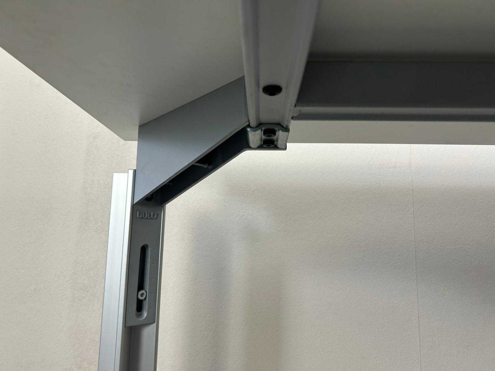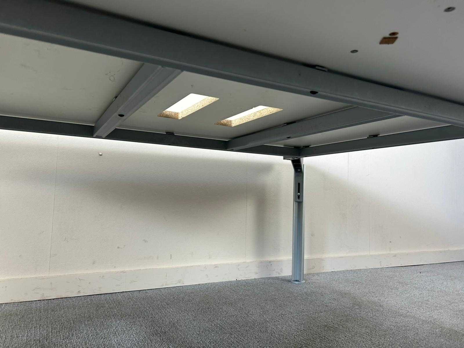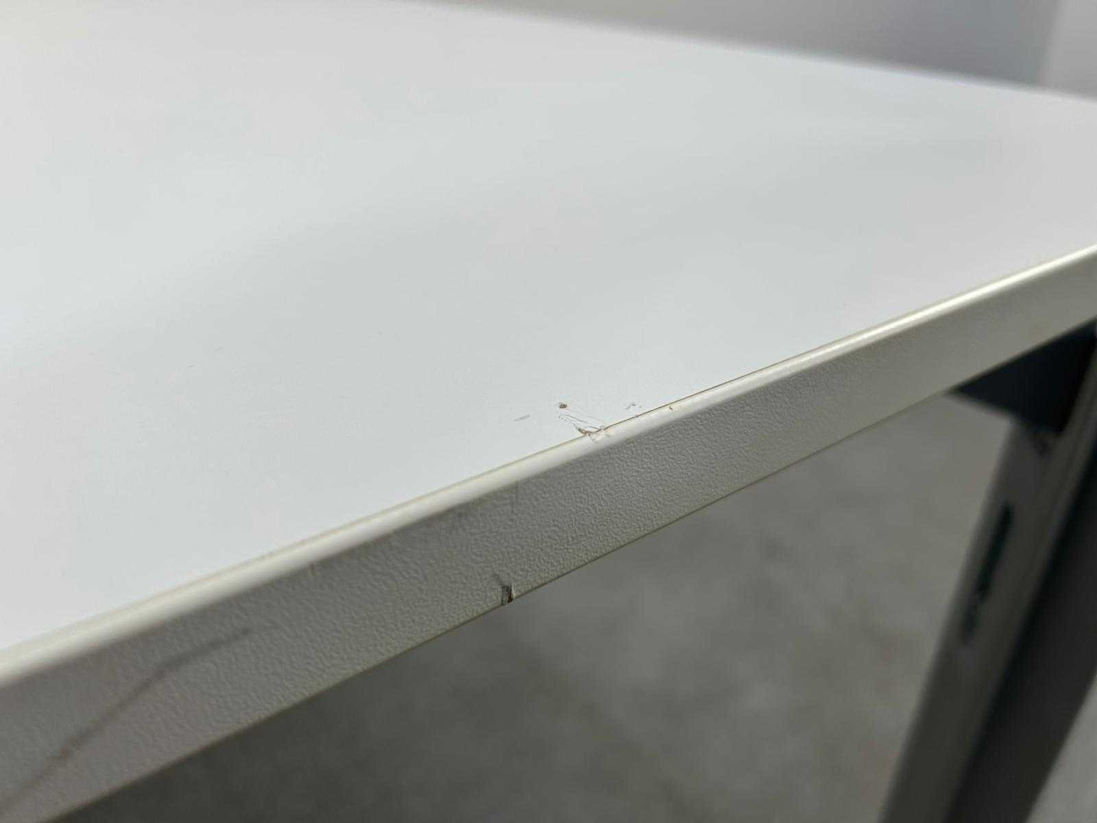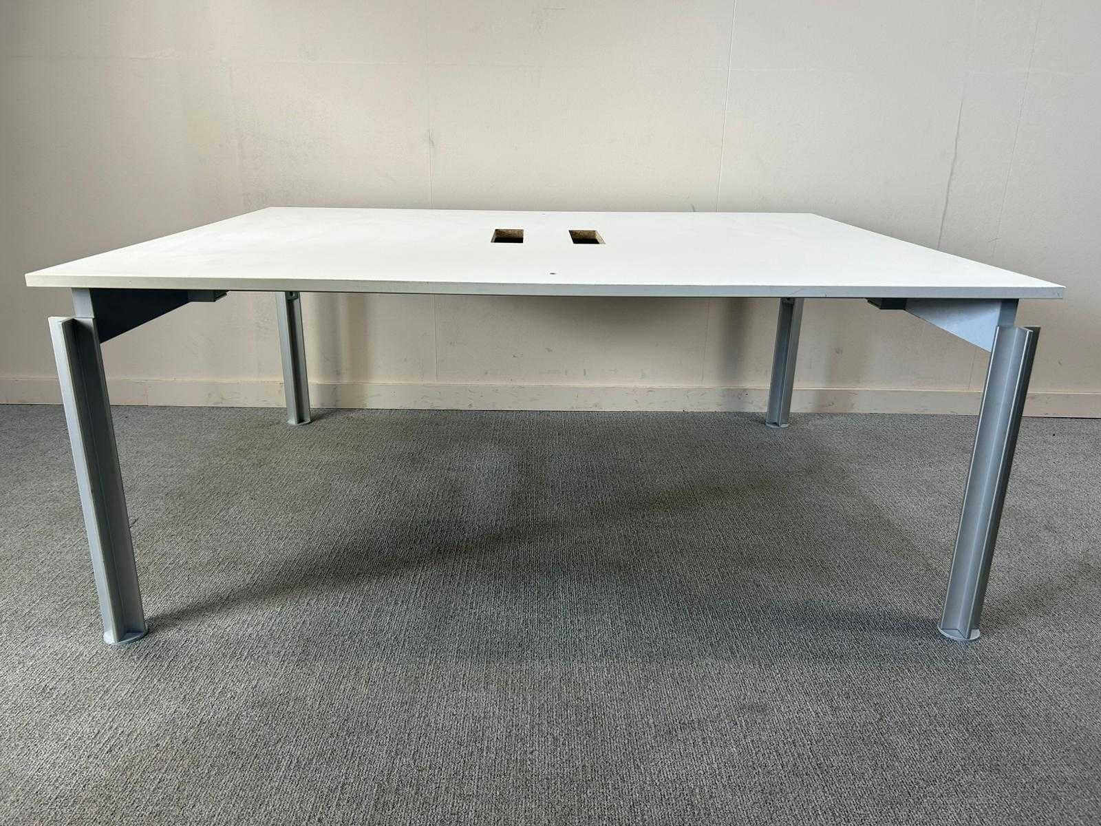 Bulo 2p-workbench met een wit melamine tafelblad en vierpoots metalen onderstel, handmatig verstelbaar, met 2 kabeldoorvoergaten. Met gebruikssporen Nee Merk: BULO Type: H2o Product type: 2p-Workbench Kleur: Wit Gewicht: 50kg Lengte: 180cm Breedte: 140cm Hoogte: 65-78cm Materiaal: Melamine
