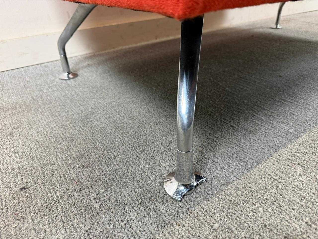 Tweedelige zitbank / tweezits sofa (Orangebox), uitgevoerd in oranje/rode stoffering. Strak, compact ontwerp met lage rugleuning en verchroomde metalen poten. Geschikt voor ontvangstruimte, wachtruimte of kantooromgeving. Gebruikte staat met zichtbare vlekken en gebruikssporen op de stoffering (zie foto’s). Nee Merk: Orangebox Kleur: oranje/rood Materiaal: textiel