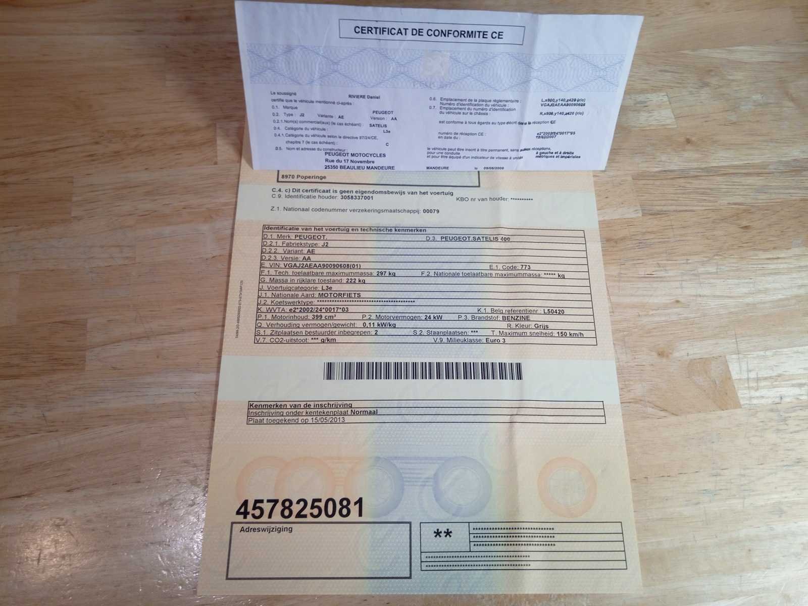 Inschrijvingsbewijs deel 1 en 2 aanwezig, gelijkvormigheidsattest aanwezig . Nee Merk: peugeot Model: Satelis 400 Chassisnummer: VGAJ2AEAA90090608 Cilinderinhoud: 400cc Datum eerste toelating: 15/02/2012 Vermogen (kW): 24kW Afgelezen kilometerstand: 14900km Boorddocumenten aanwezig?: true Aantal sleutels: 2 Startinformatie: ja Bouwjaar: 2012