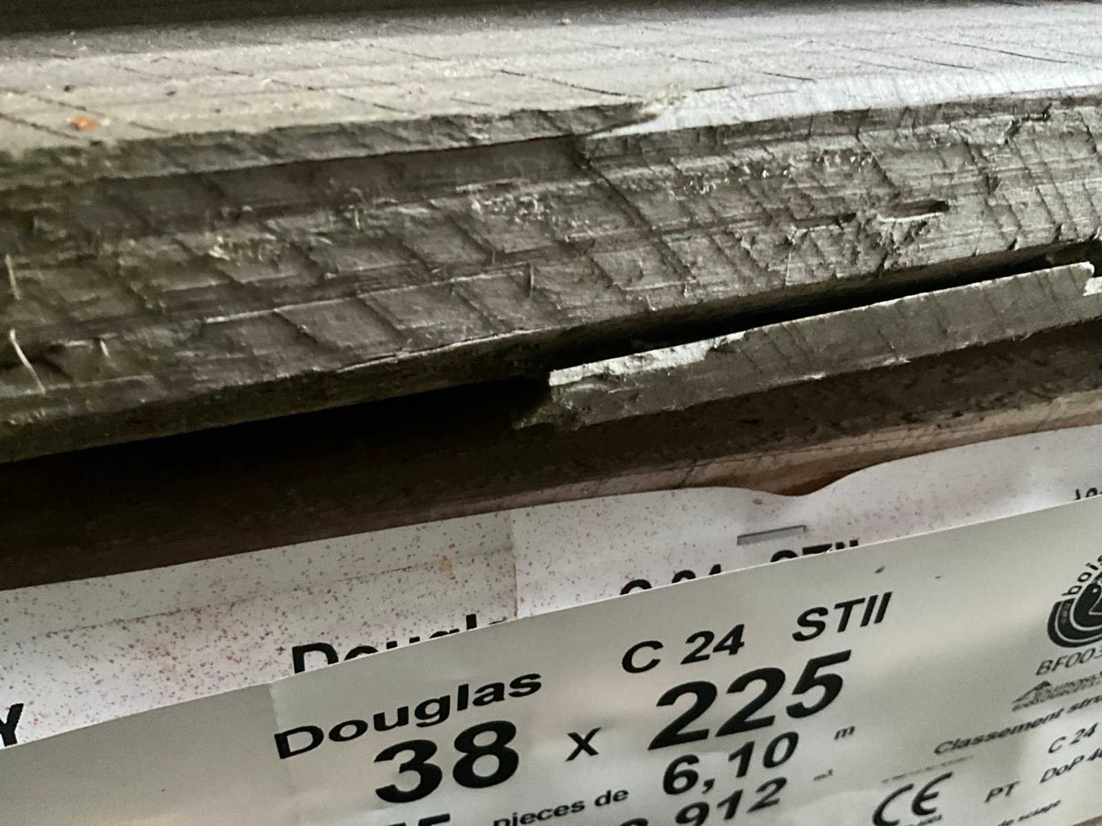 Elk met een lengte van 6,1 lpm, gedrenkt C24. No Type: Douglas Kopmaat: Zes meters en de rest Afmeting l: 6100mm Afmeting b: 225mm Afmeting h: 38mm