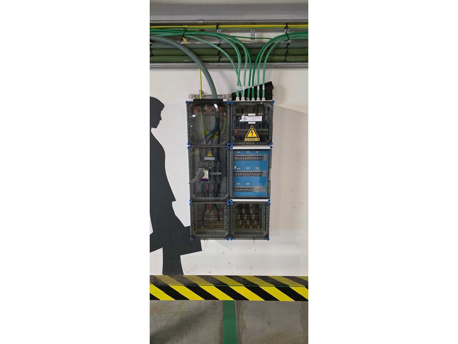 Bestaande uit: 1x Dubbele hub (master) met wandbeugel. 2x Dubbele satellite (slave) met wandbeugel. 2x Enkele satellite (slave) met wandbeugel. 1x Zekeringskast. Nee Merk: EVBox Model: Gen4 Maximale laadsnelheid: 22kW