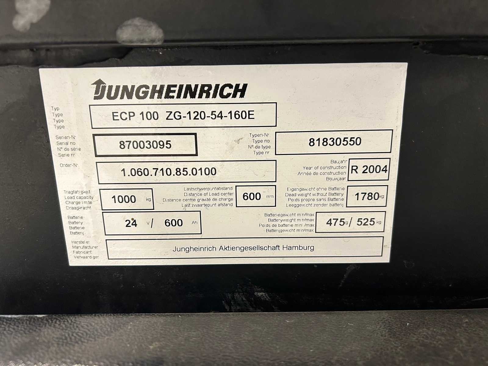 Geen batterij Nee Merk: Jungheinrich Type: ECP Bouwjaar: 2004 Hefvermogen: 1000kg Hefhoogte: 2350mm Lepellengte: 1200mm Accu lader: true Afgelezen urenstand: 1484