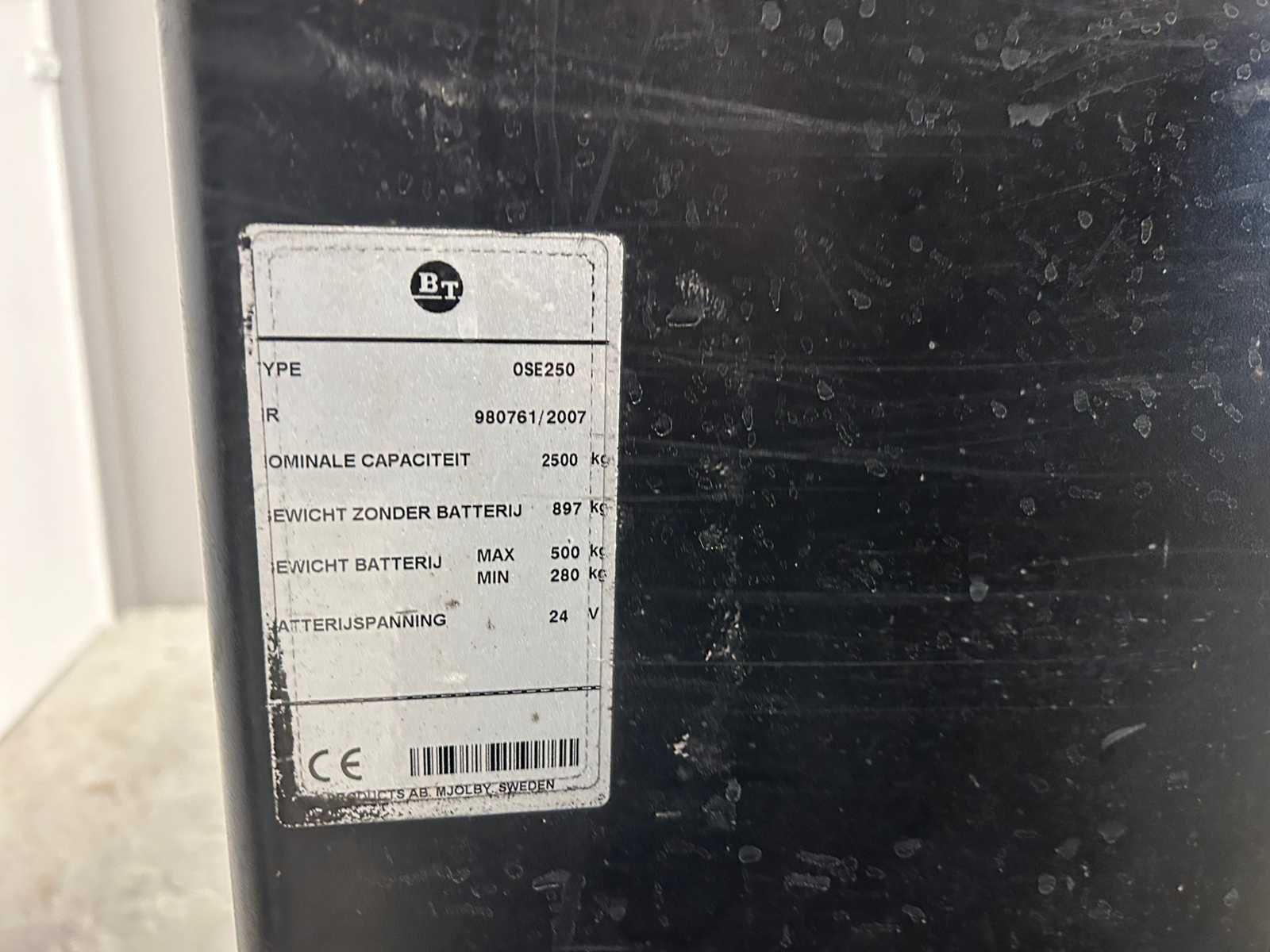 Geen batterij Nee Merk: BT Type: OSE250 Bouwjaar: 2007 Serienummer: 980761 Hefvermogen: 2500kg Lepellengte: 1200mm Afgelezen urenstand: 1434