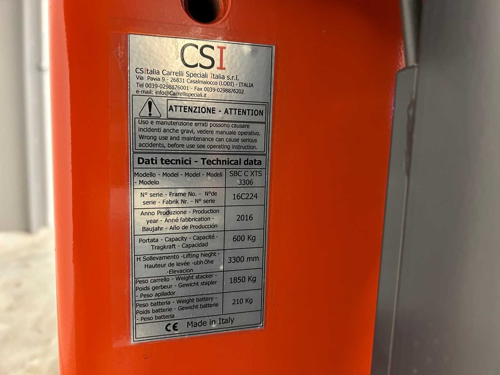 Nee Merk: CSI Type: SBC XTS Bouwjaar: 2016 Serienummer: 16C224 Hefvermogen: 600kg Hefhoogte: 3300mm Lepellengte: 800mm Afgelezen urenstand: 141
